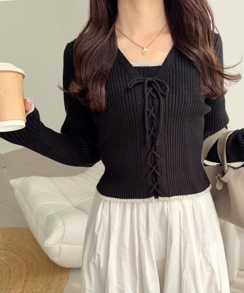 トレンド感たっぷりのレースアップデザインが目を惹くリブニットトップス。