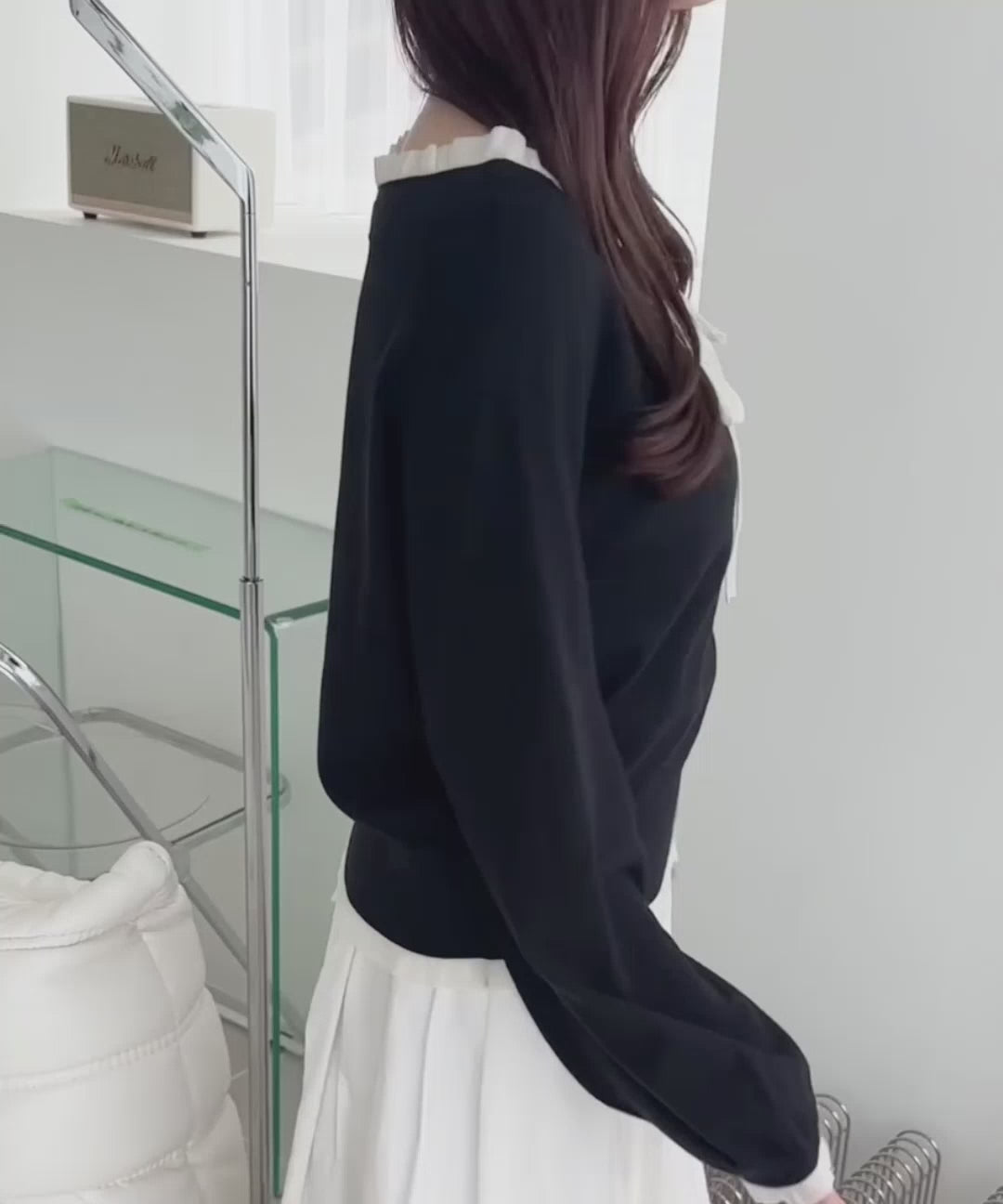 さらに胸元のシアーリボンや、袖口・裾に施されたシアーフリルが、軽やかで女性らしい雰囲気をプラスしてくれます。