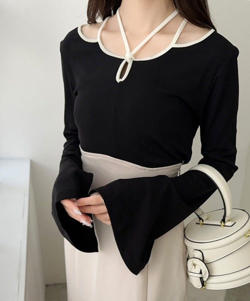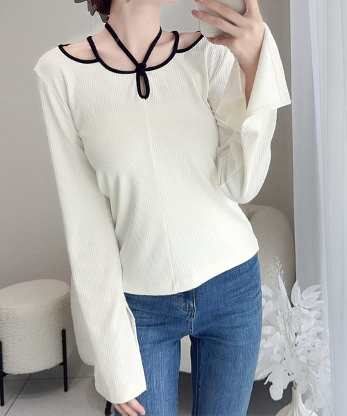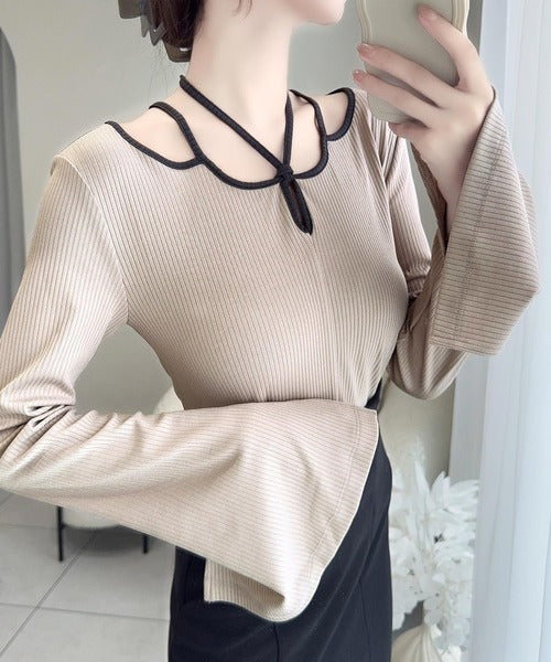 【mily bilet】程よい肌見せで女性らしく。チョーカー使いパイピング配色袖フレアカットソー mi1249001