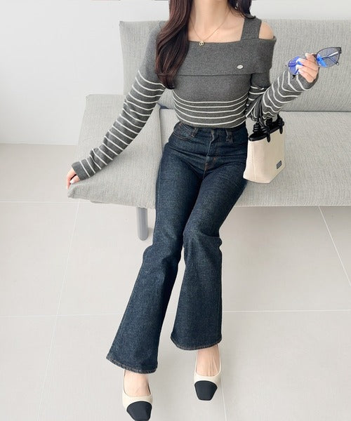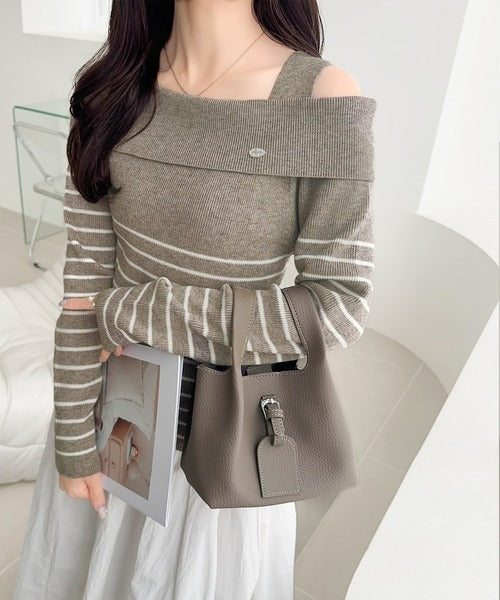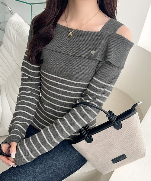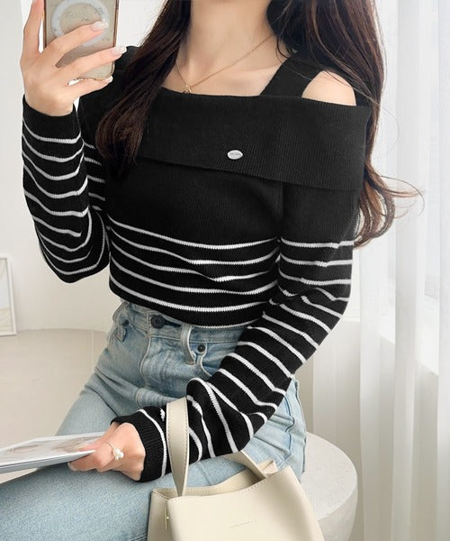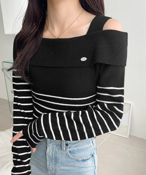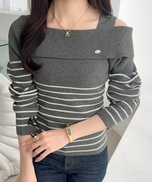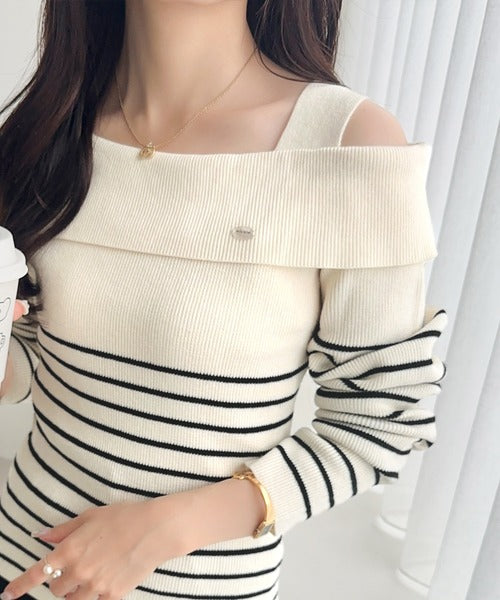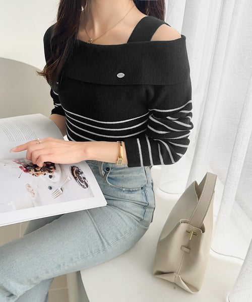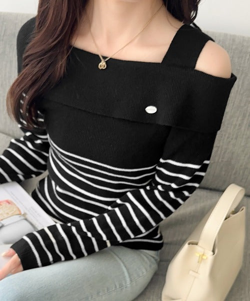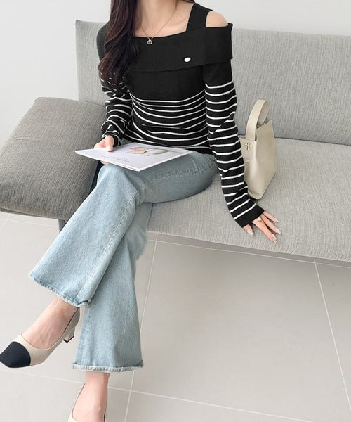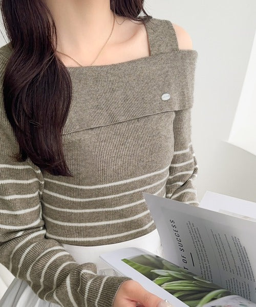 【mily bilet】抜け感たっぷり大人の肌見せ。ワンオフショルアクセントボタンボーダーニット(長袖) mi1259019
