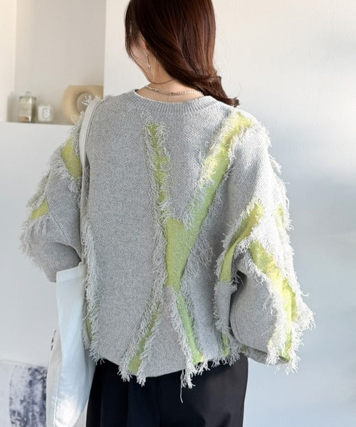ゆったりオーバーシルエットのフリンジ配色ジャガードニットです。
