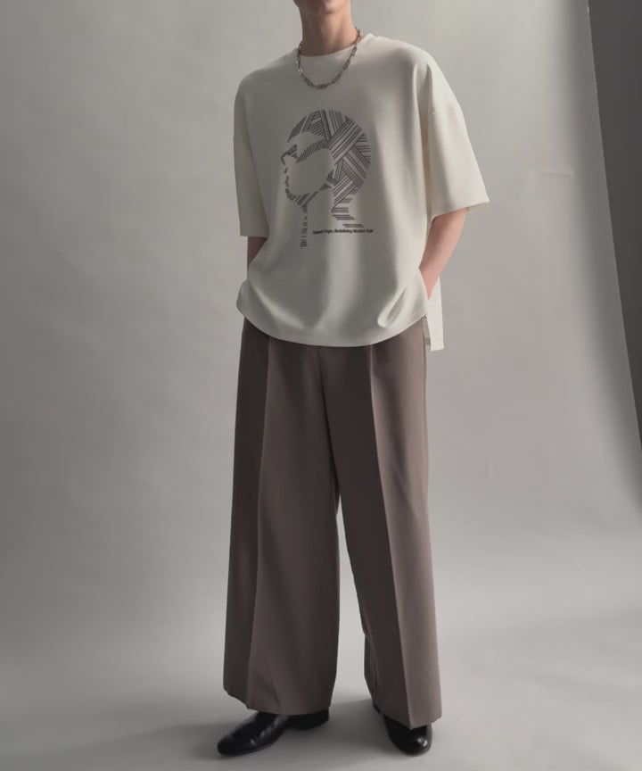 ストレートなラインを持つボトムスと組み合わせることで、Tシャツのオーバーサイズ感が引き立ち、余裕のあるスタイリングに。
