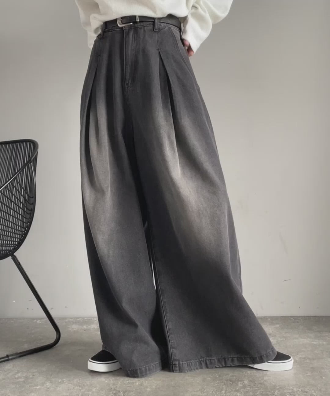 「変形3タックスーパーワイドデニム/Unique Three-Tuck Super Wide Denim」
