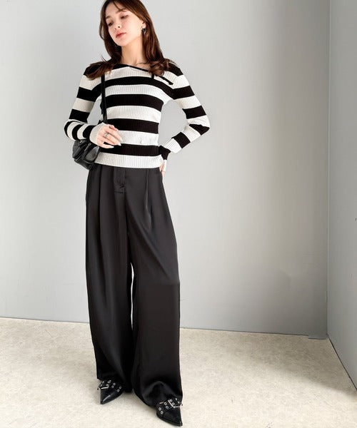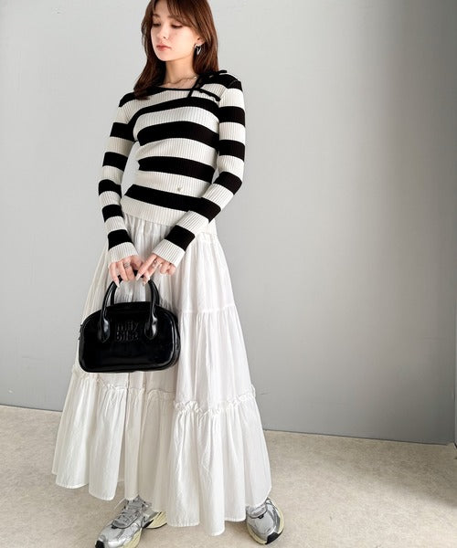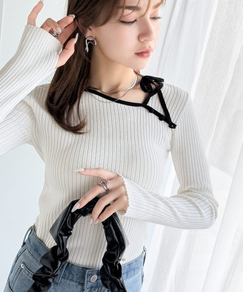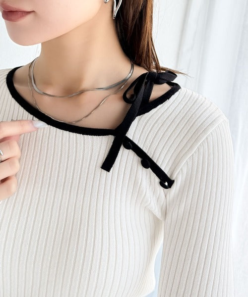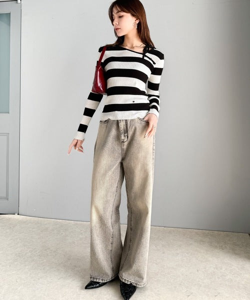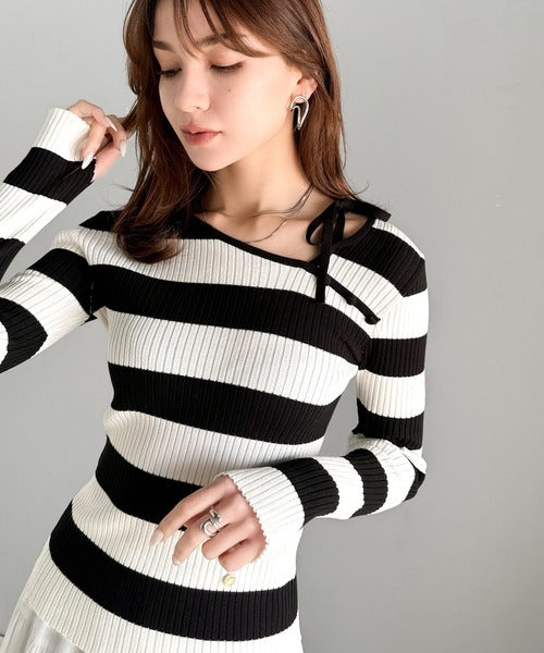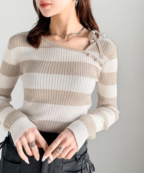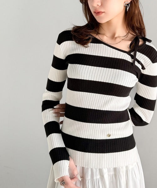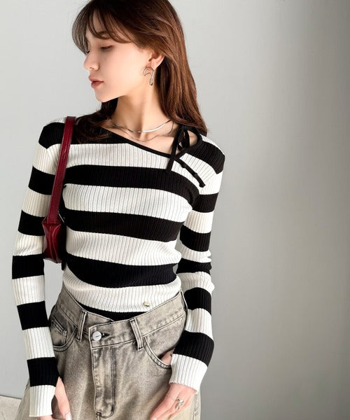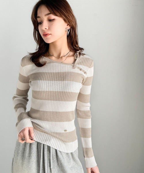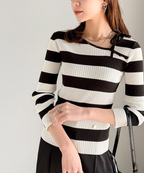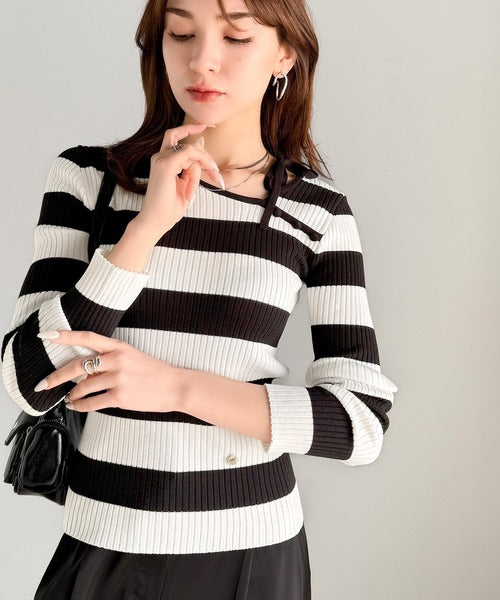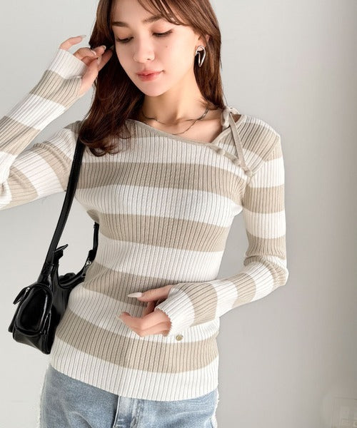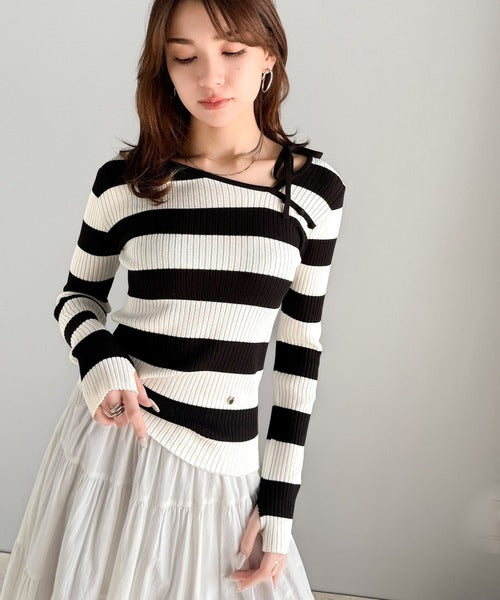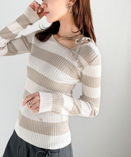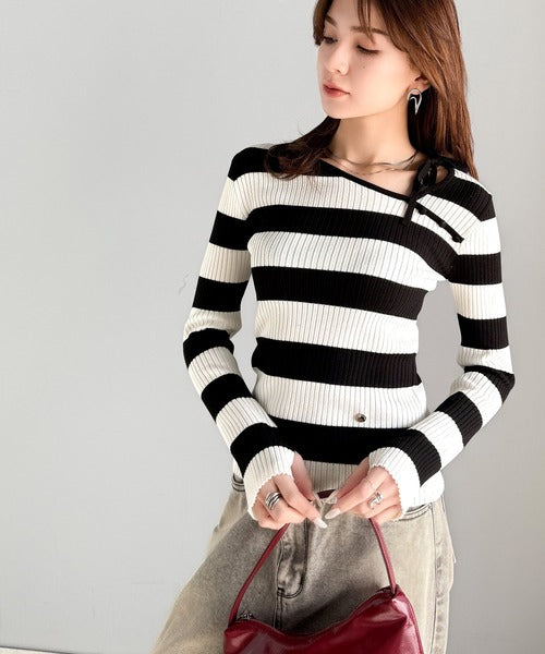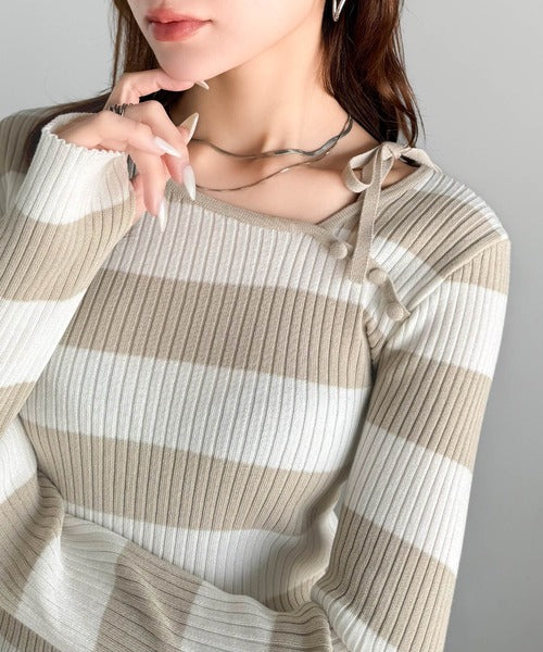 【mily bilet】春夏の新定番!くるみボタンアシンメトリーネックボーダーリブニット(長袖) mi1029111