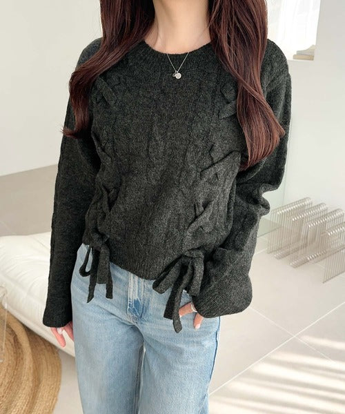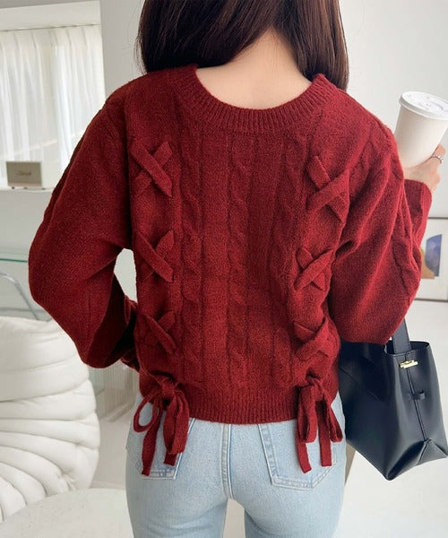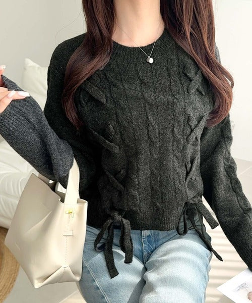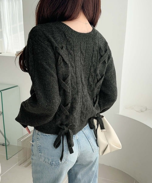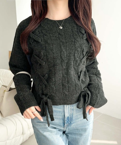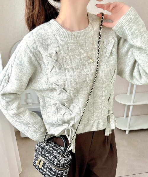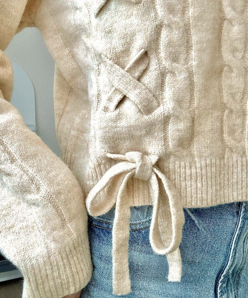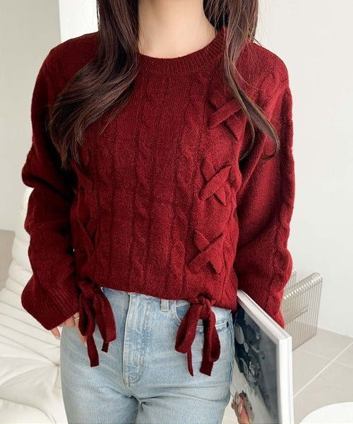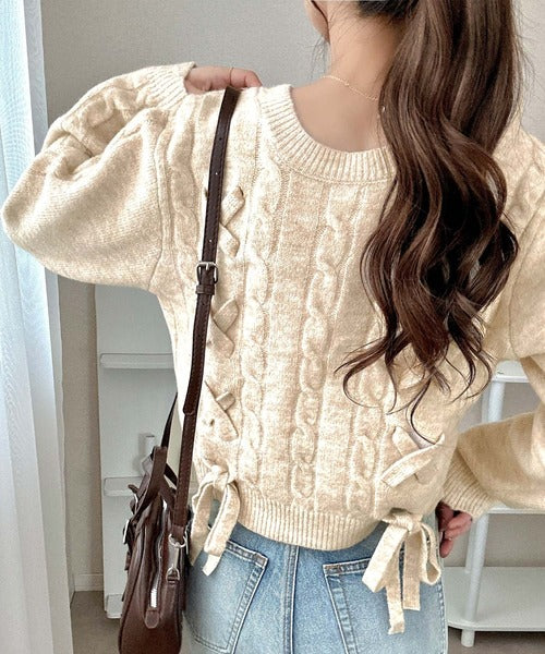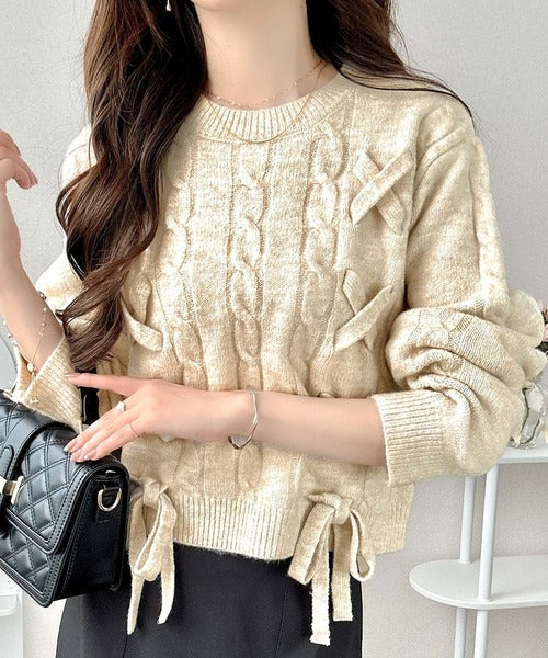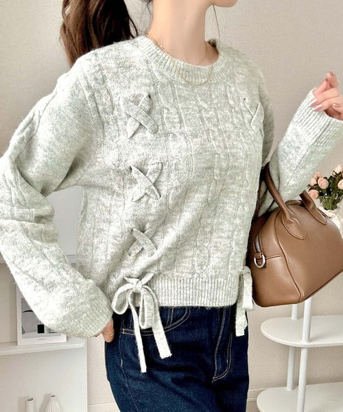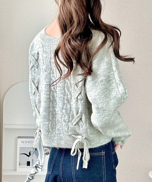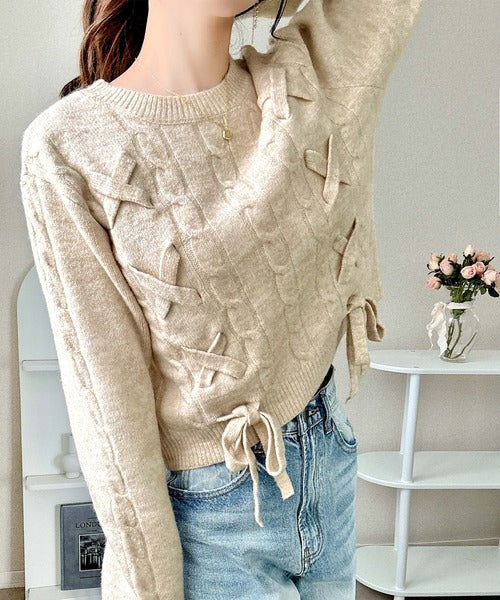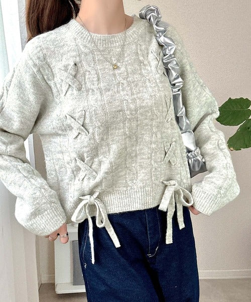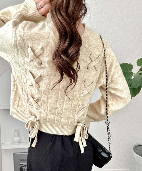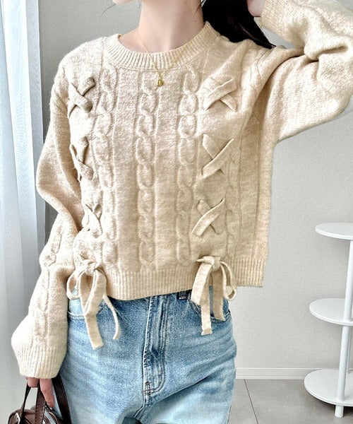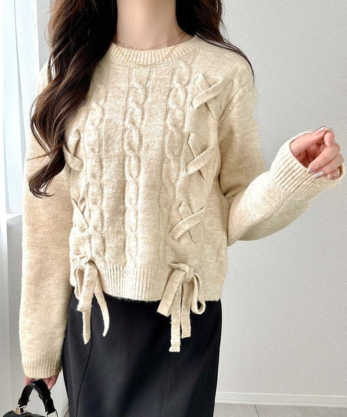 ケーブル編みにレースアップリボンをプラスした、華やかさと可愛らしさを兼ね備えたデザインニット。