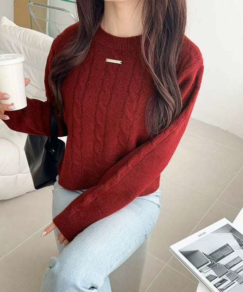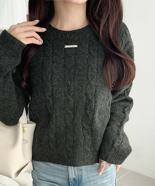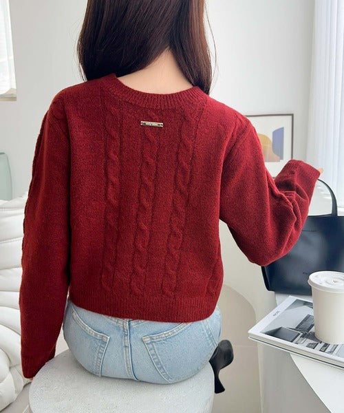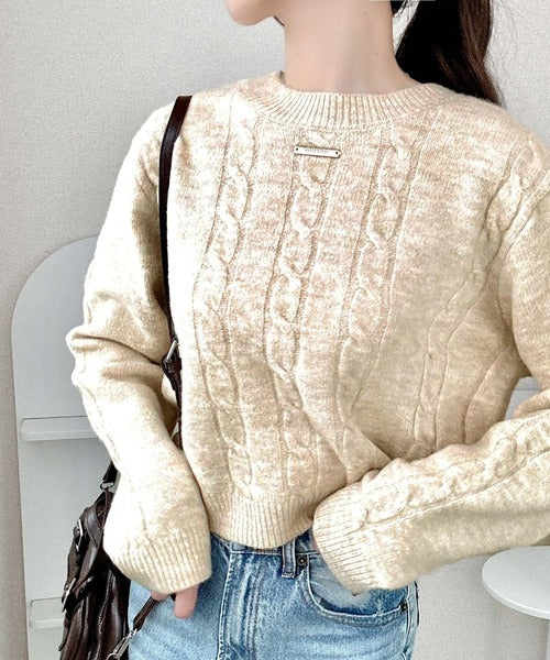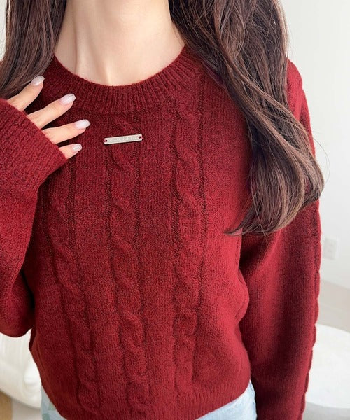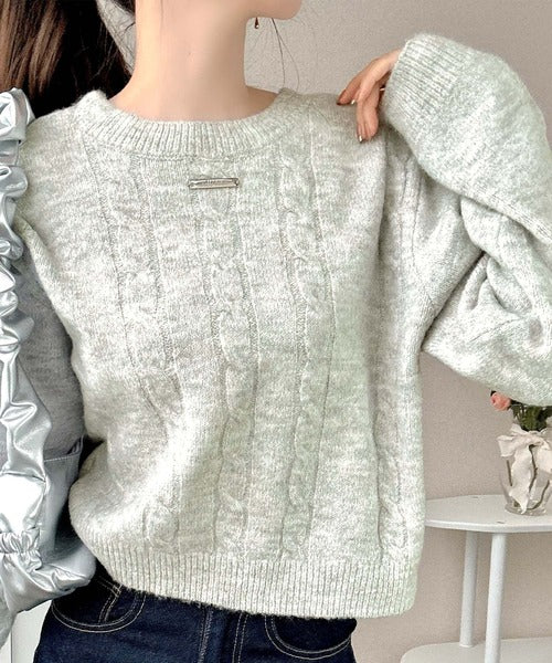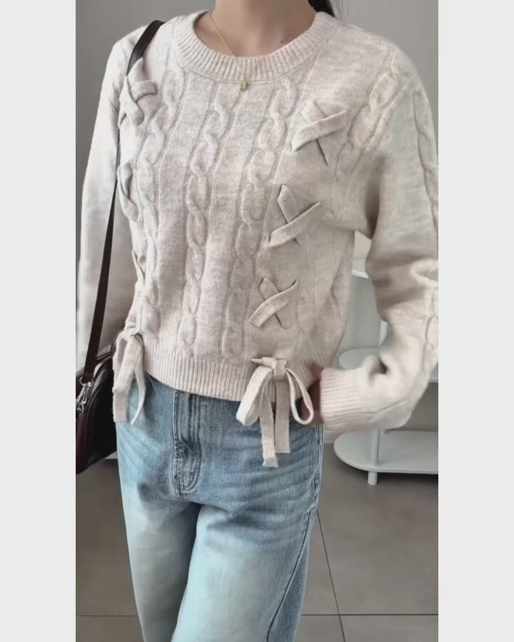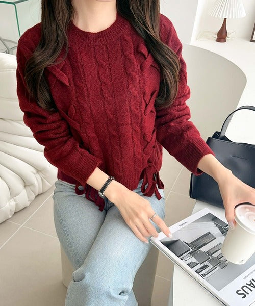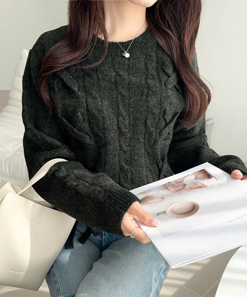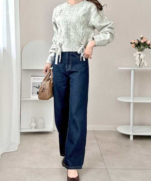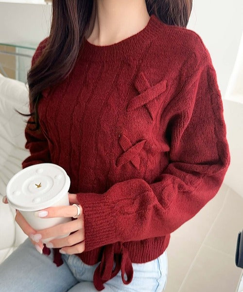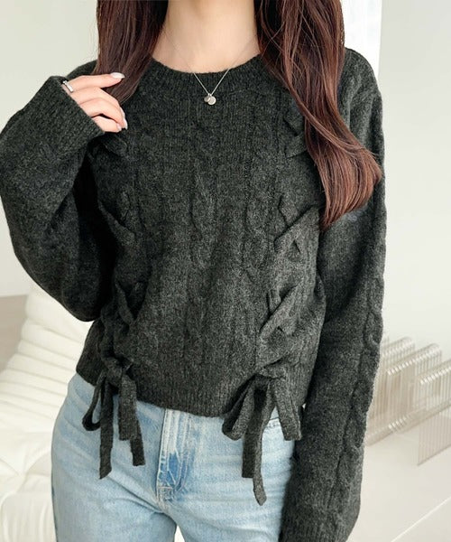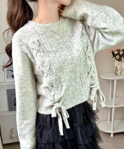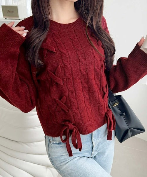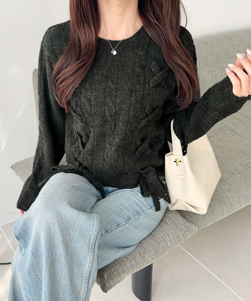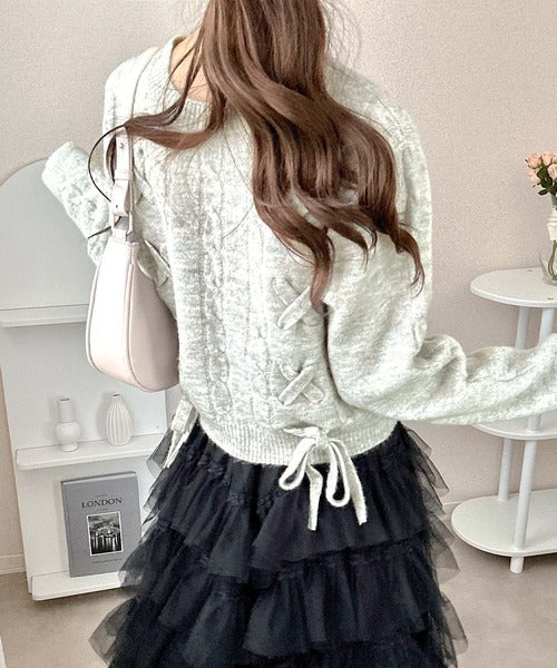 ケーブル編みにレースアップリボンをプラスした、華やかさと可愛らしさを兼ね備えたデザインニット。
