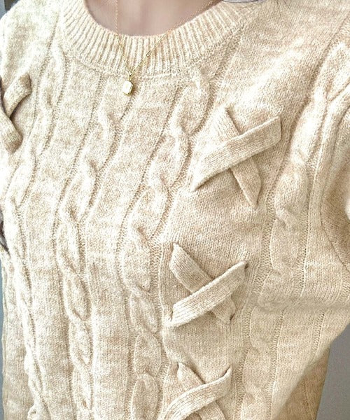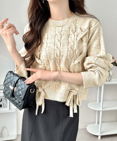 【mily bilet】前も後ろも可愛く映える、大人フェミニン。前後2WAYリボン使いケーブルニット mi1329039