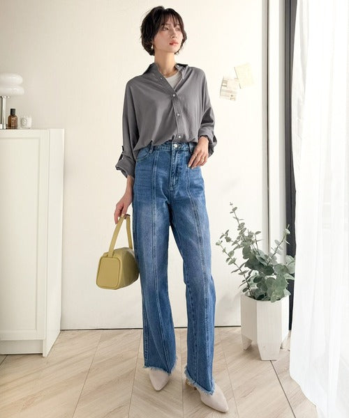カジュアルコーデを楽しむならデニムやフレアパンツにタックインして合わせるのがオススメ!