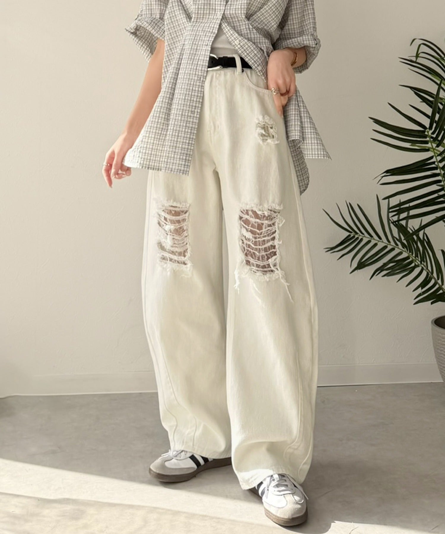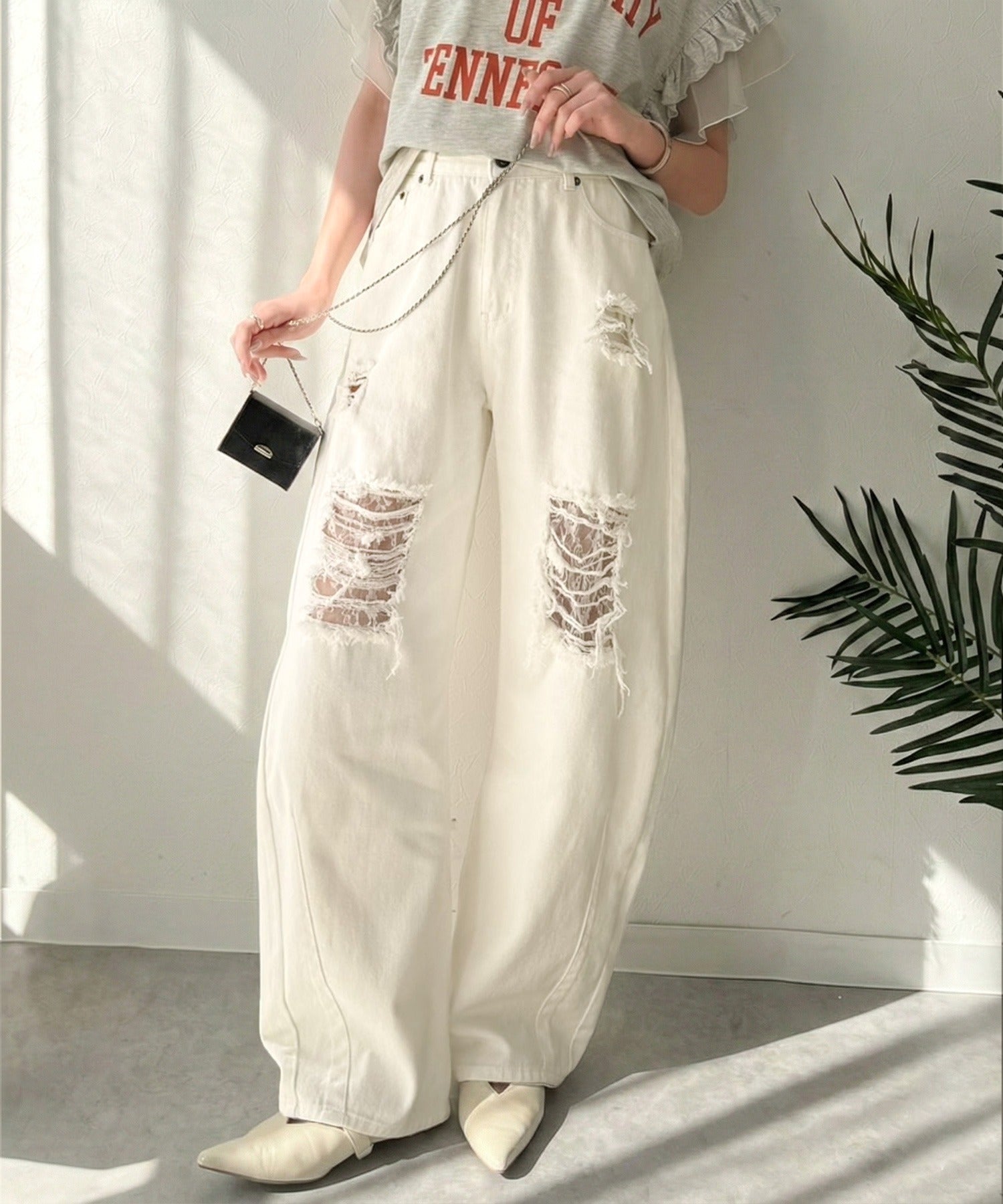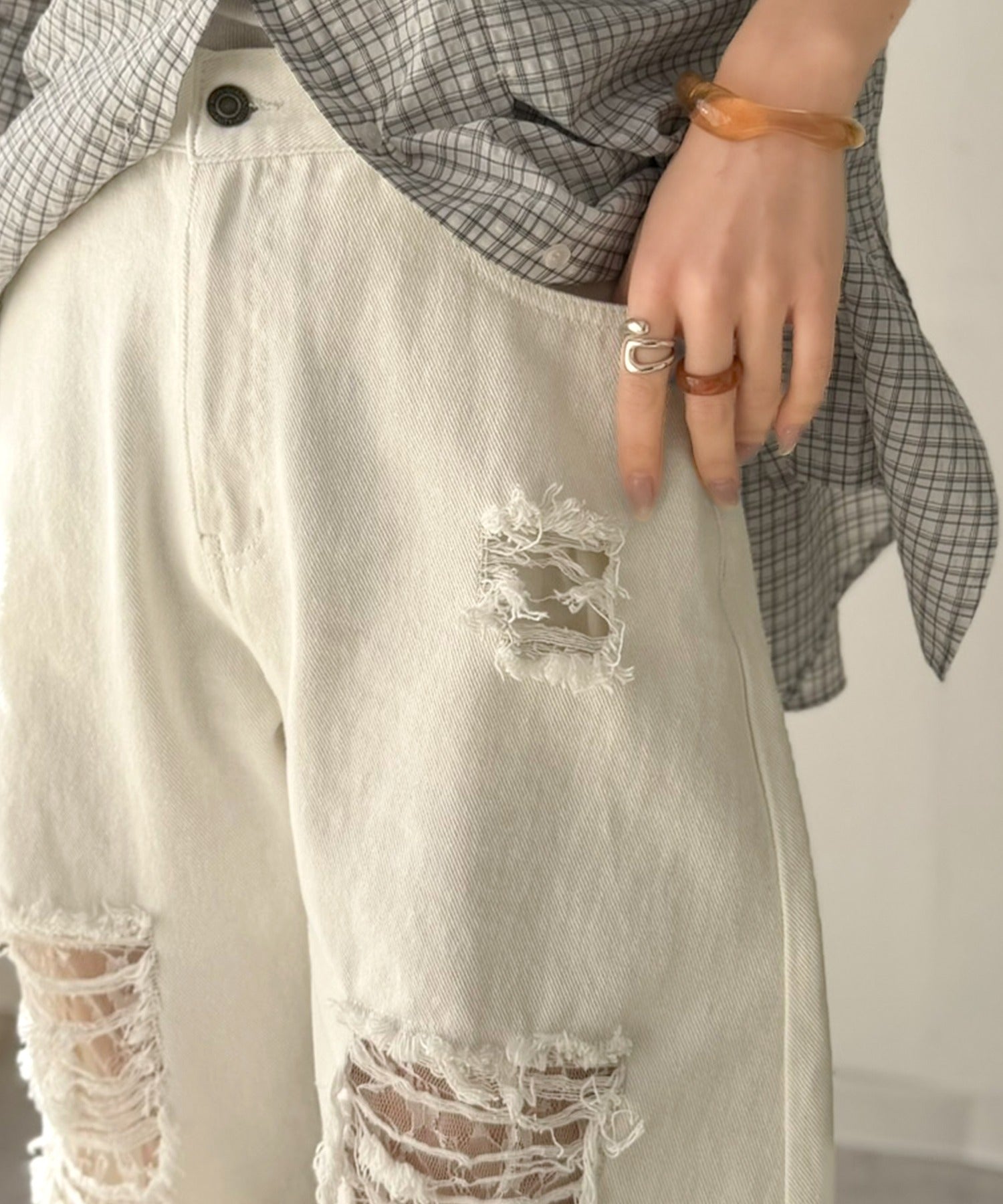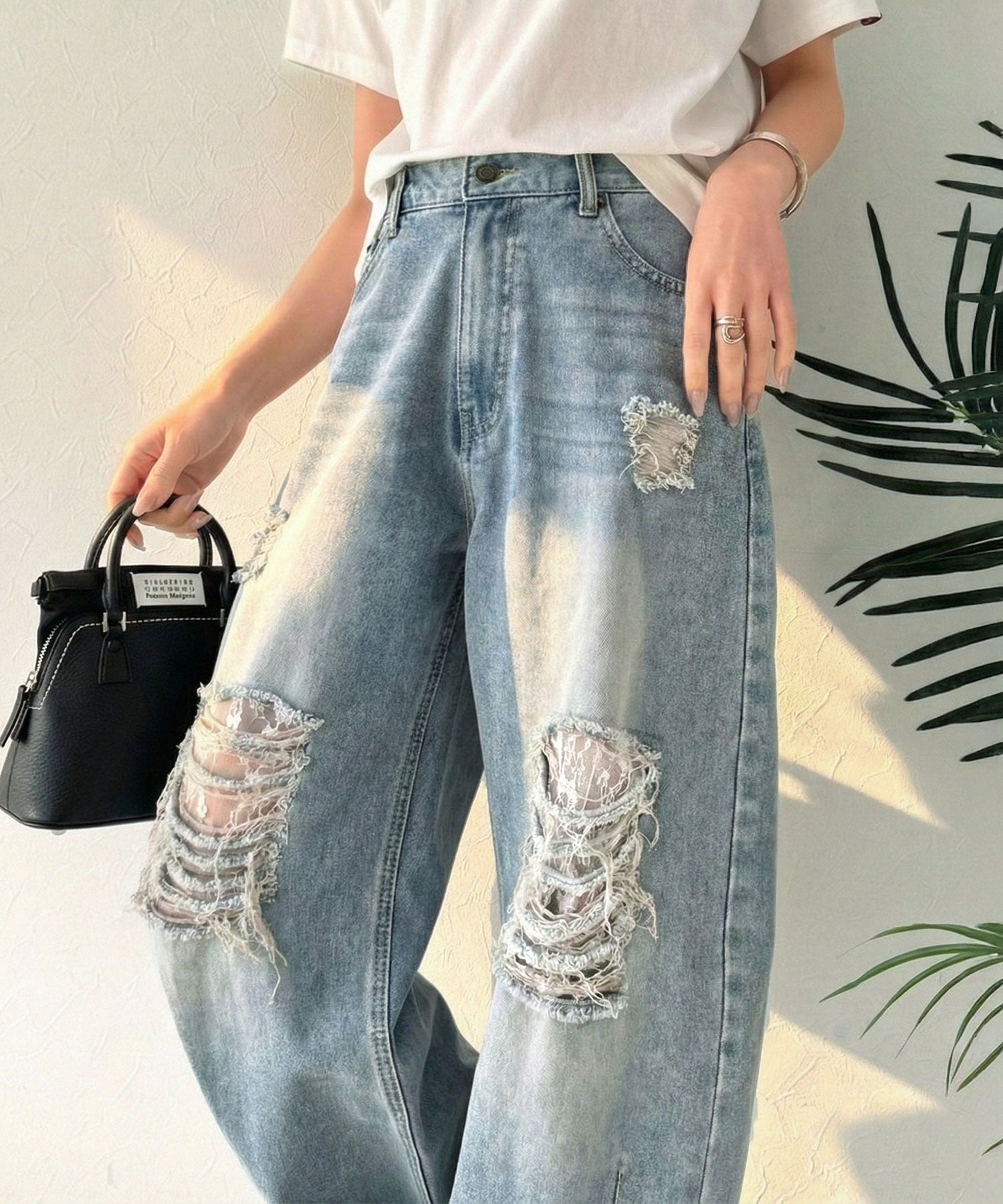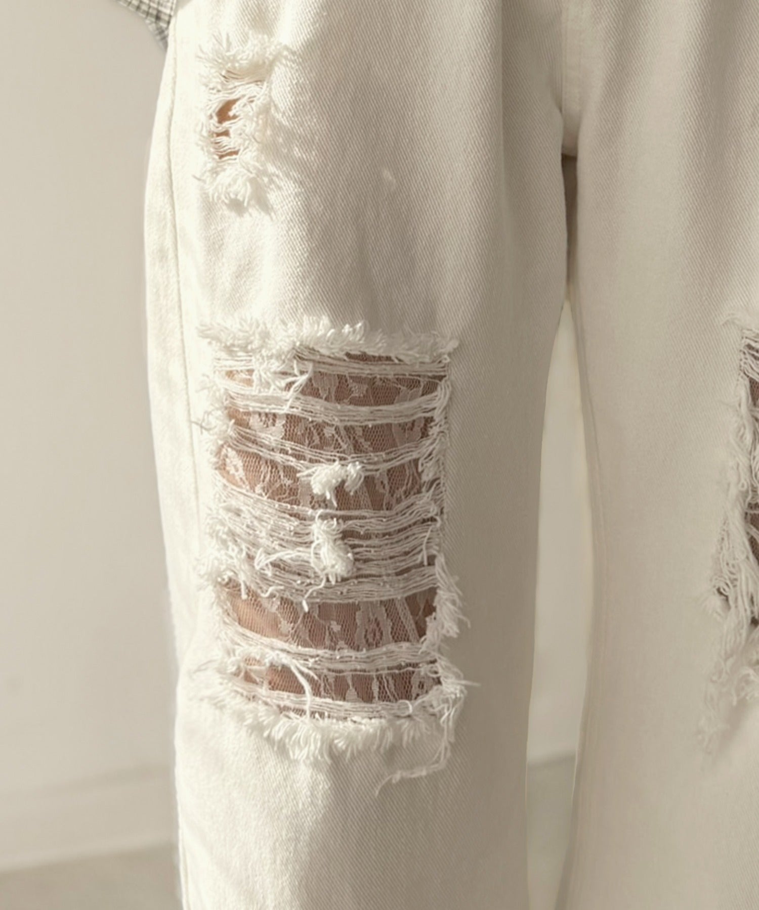 程よい厚みのデニムに、ダメージ部分は内側からレースを重ね、上品な肌見せを演出。