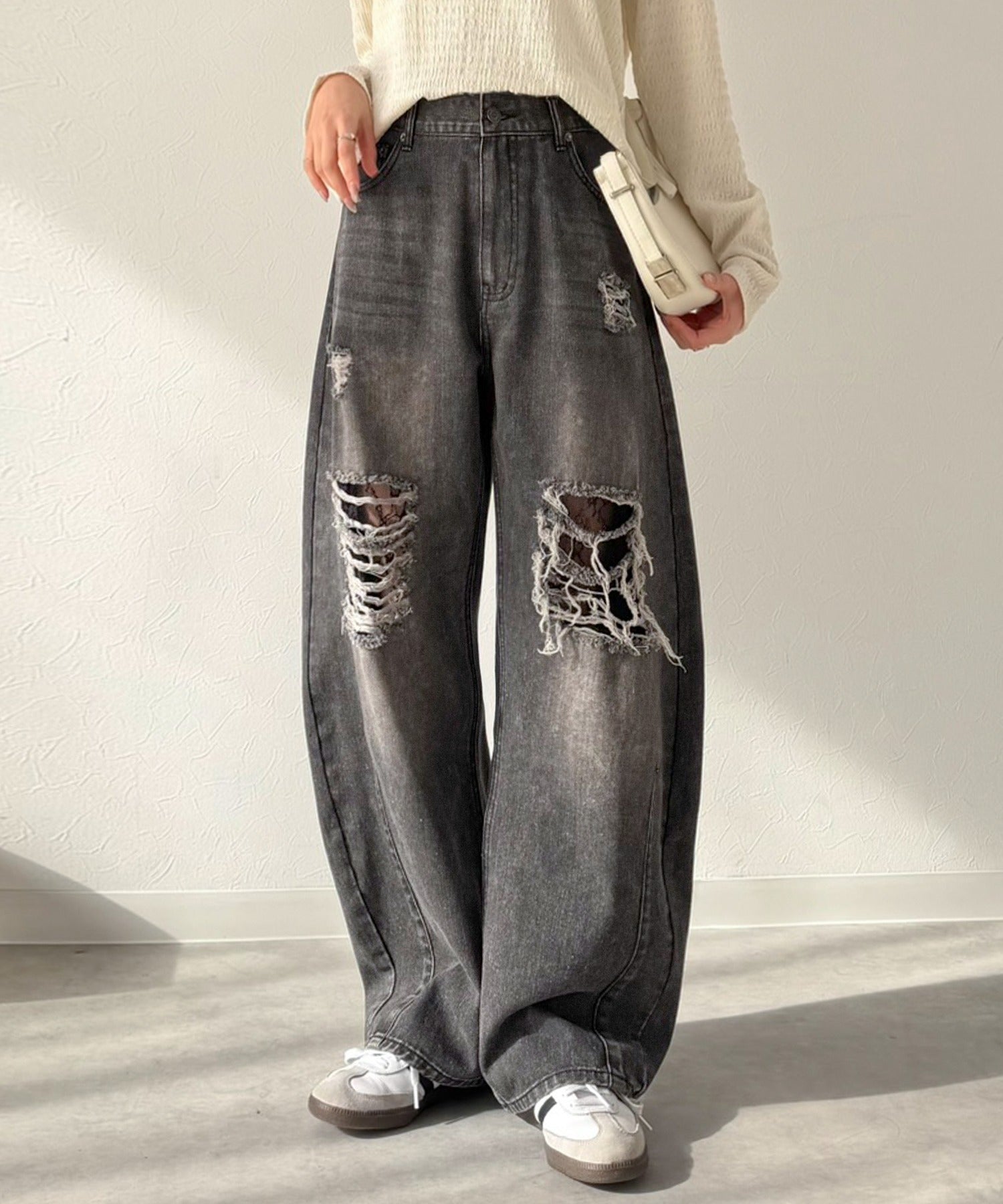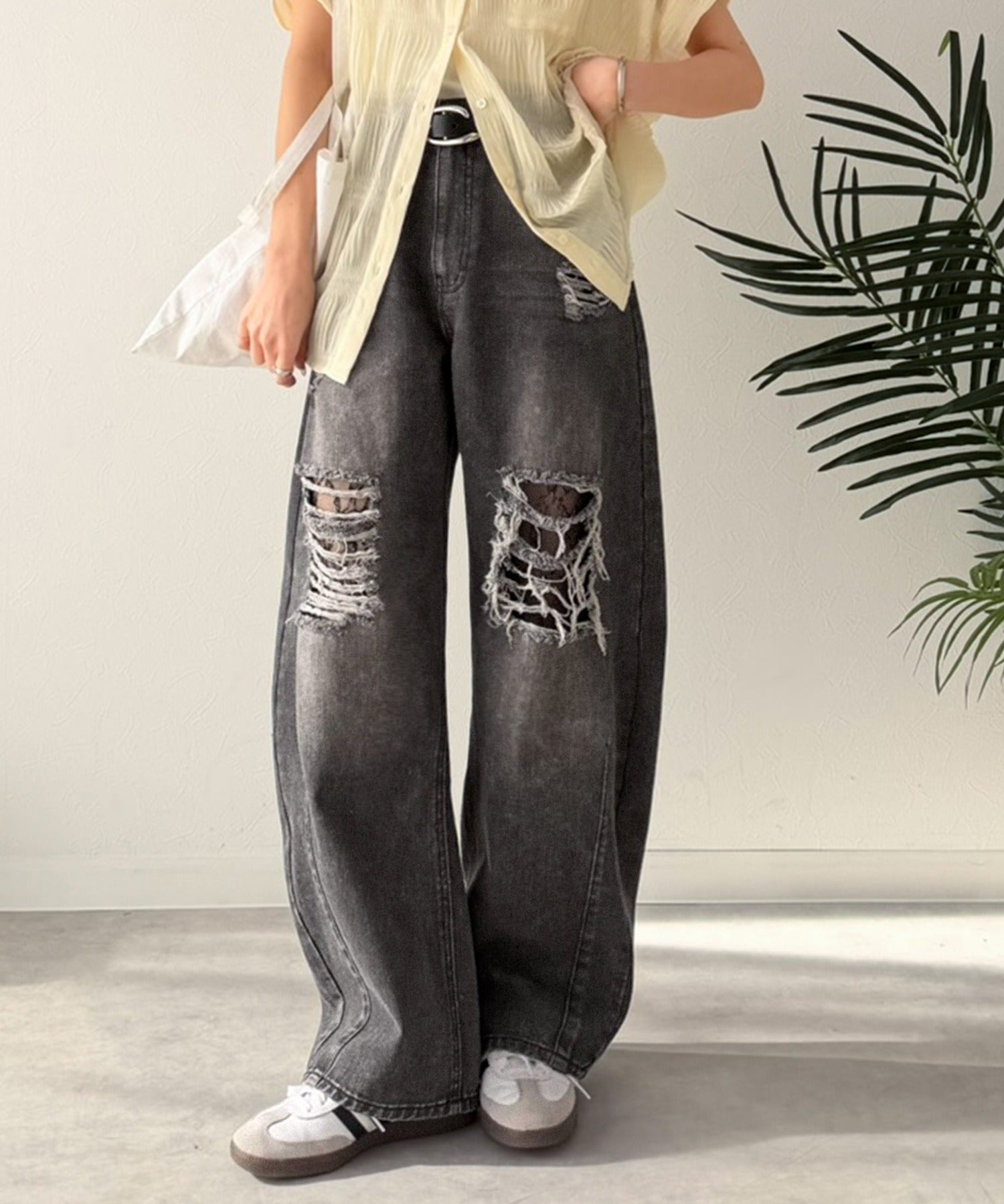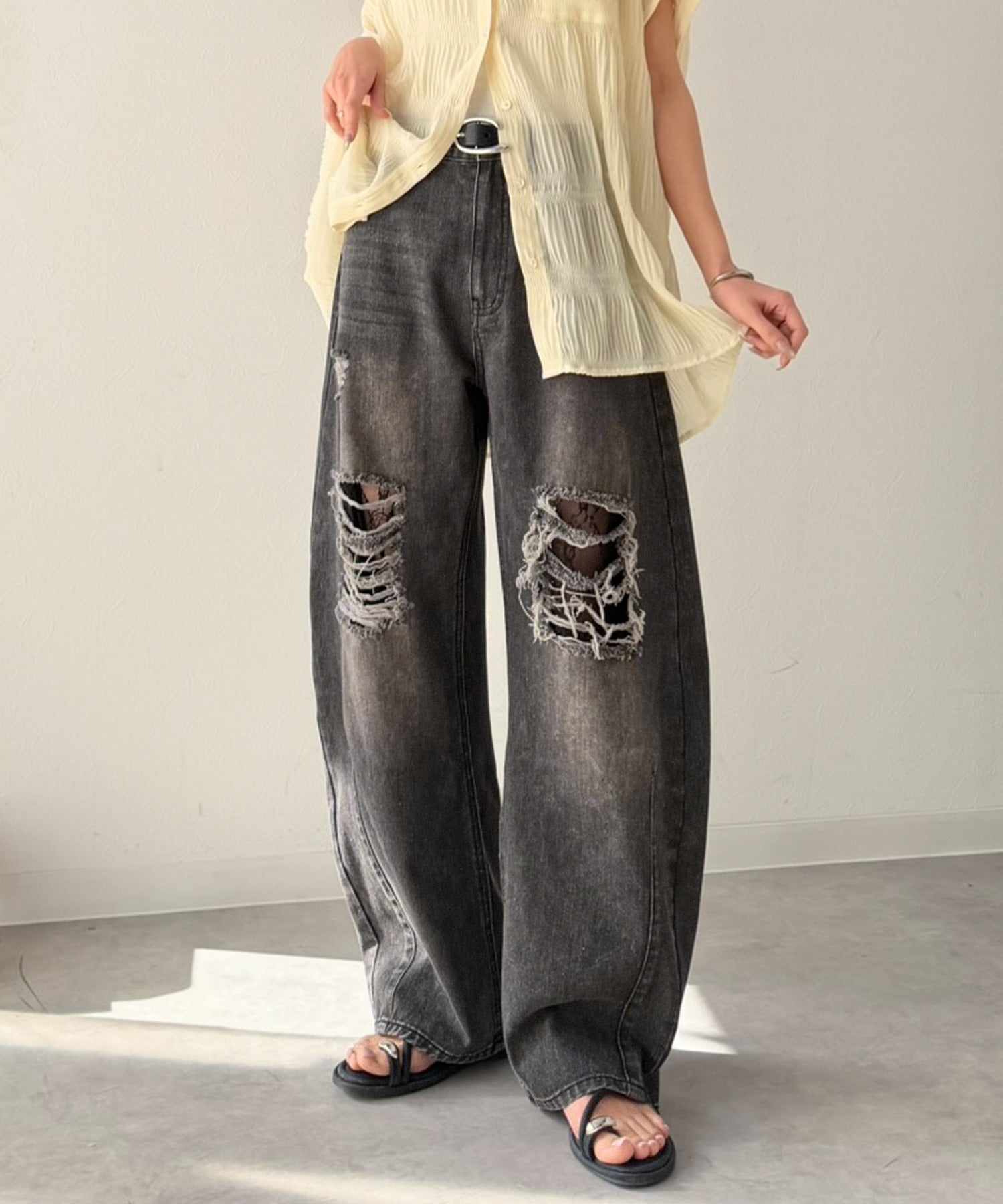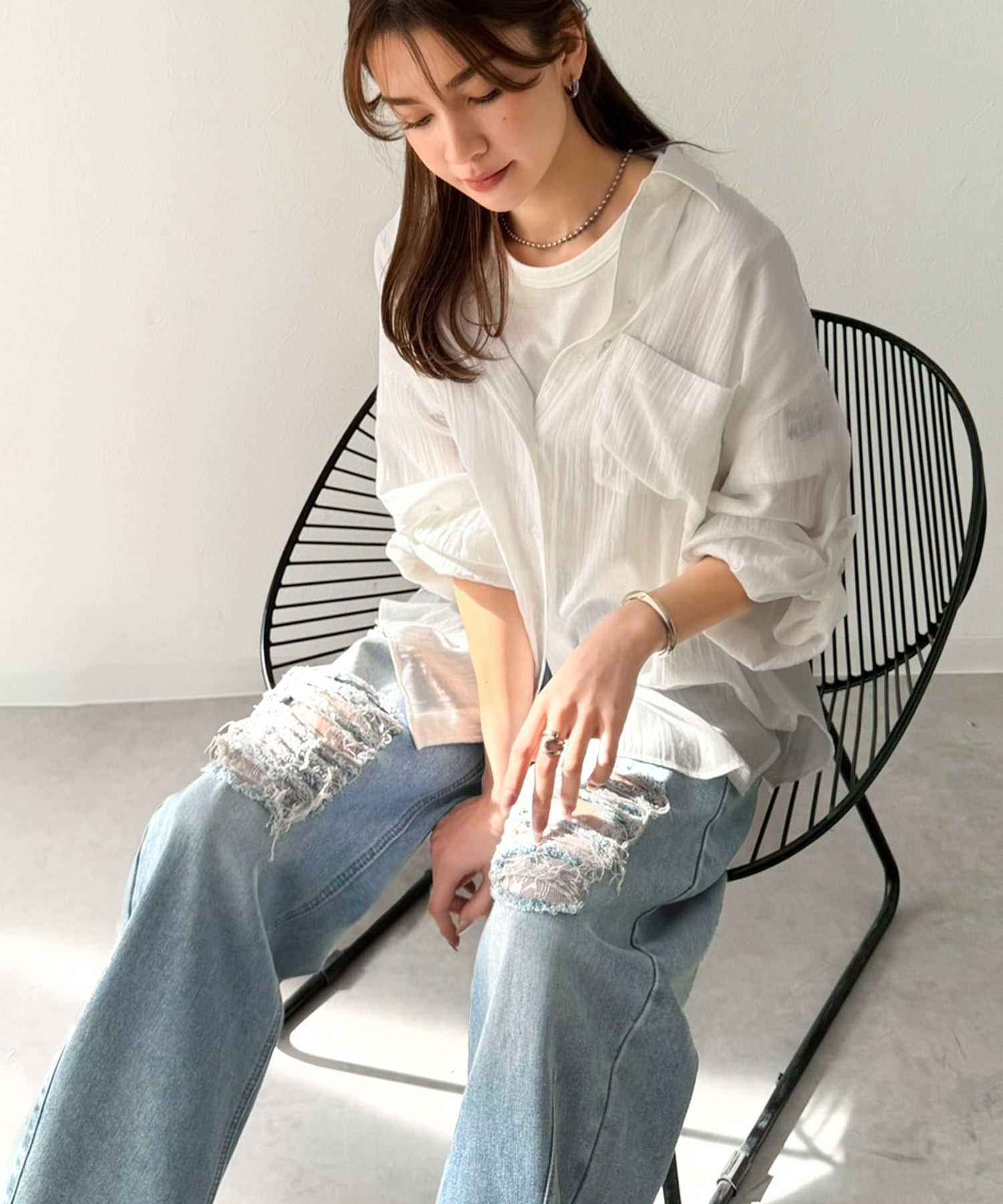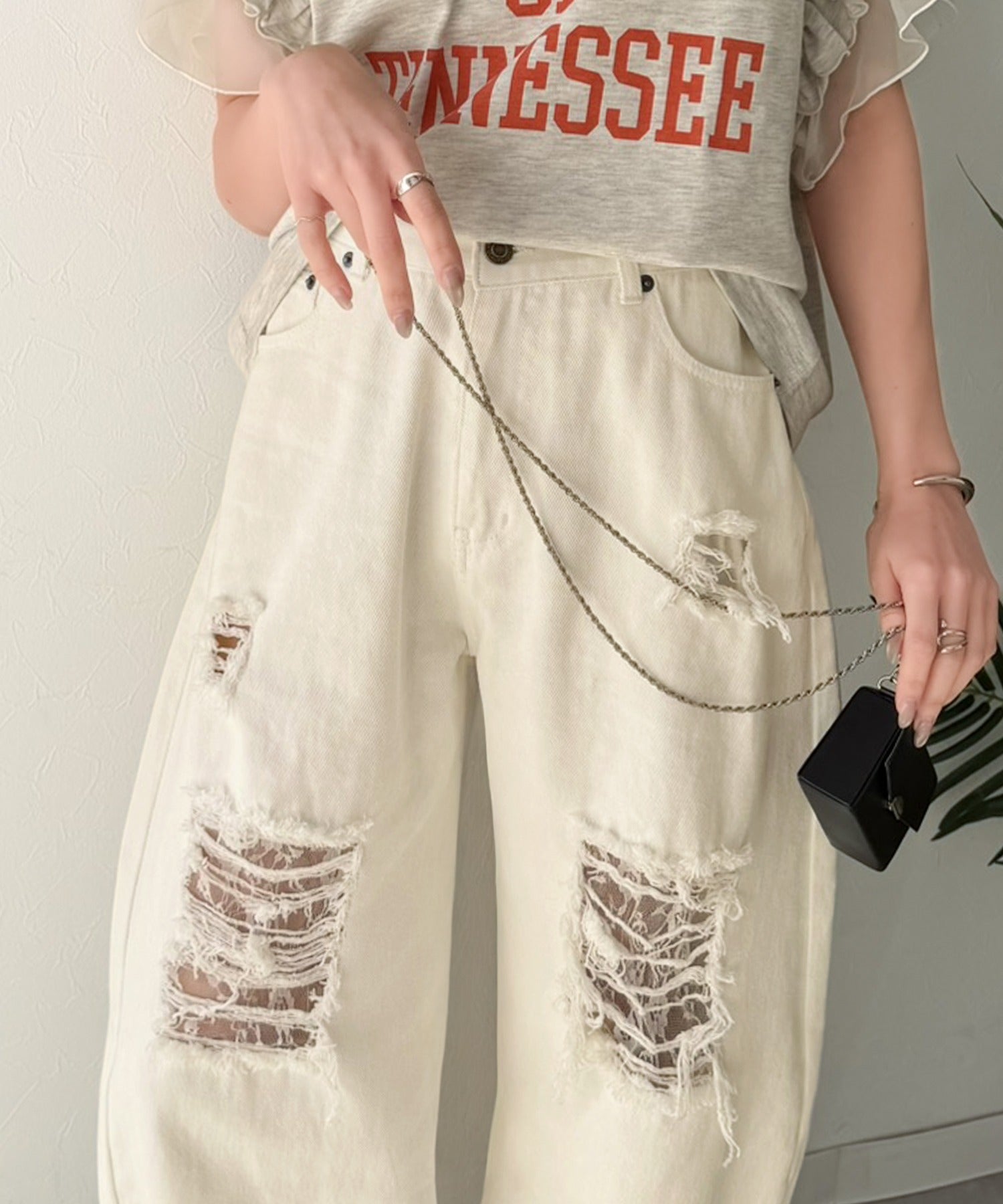 程よい厚みのデニムに、ダメージ部分は内側からレースを重ね、上品な肌見せを演出。