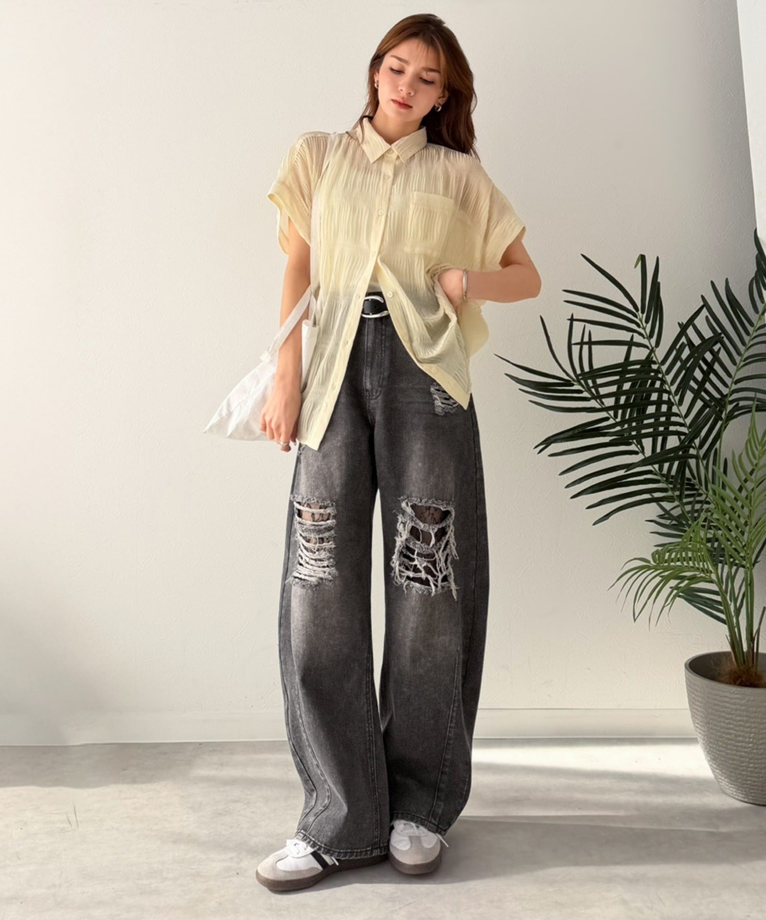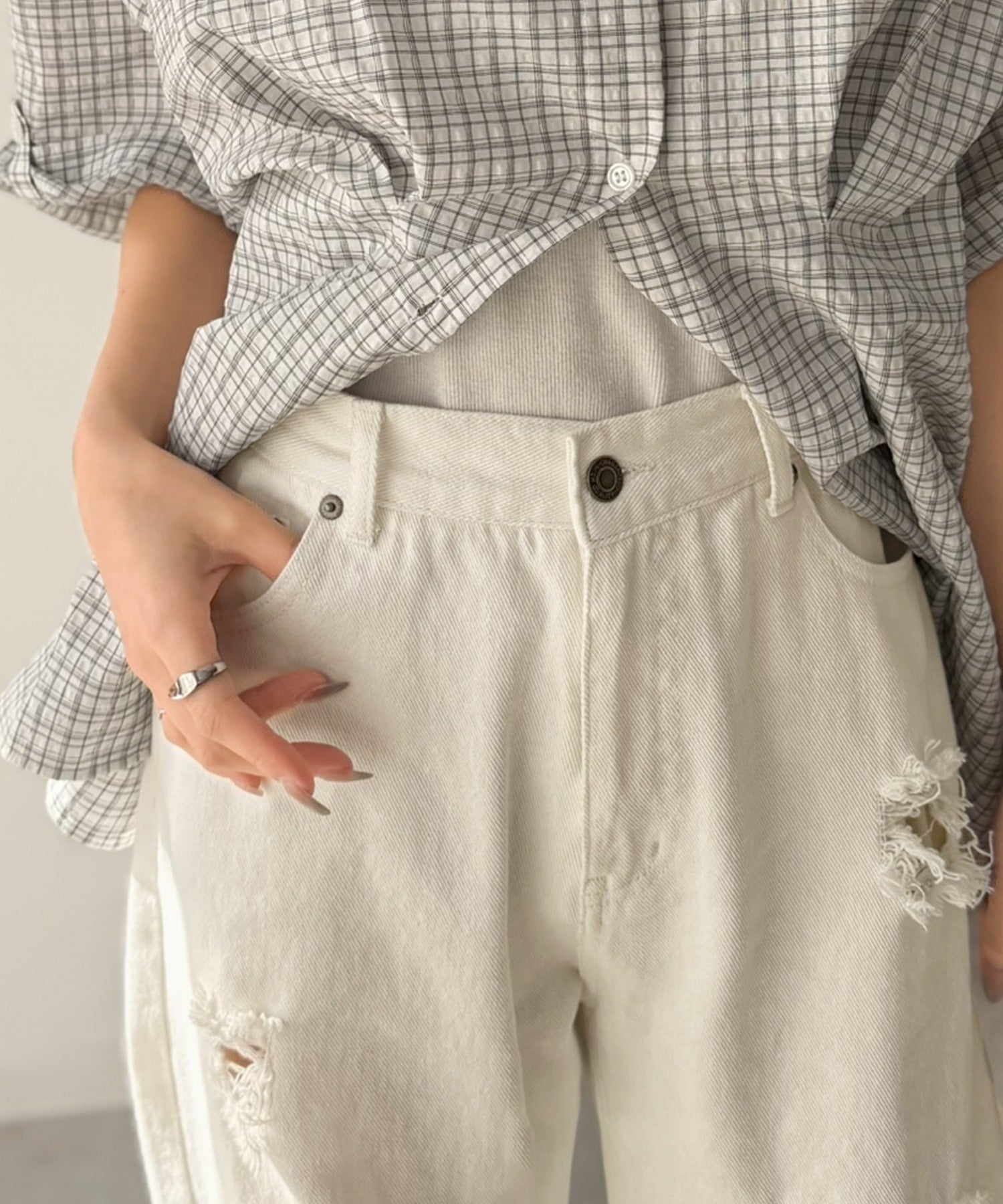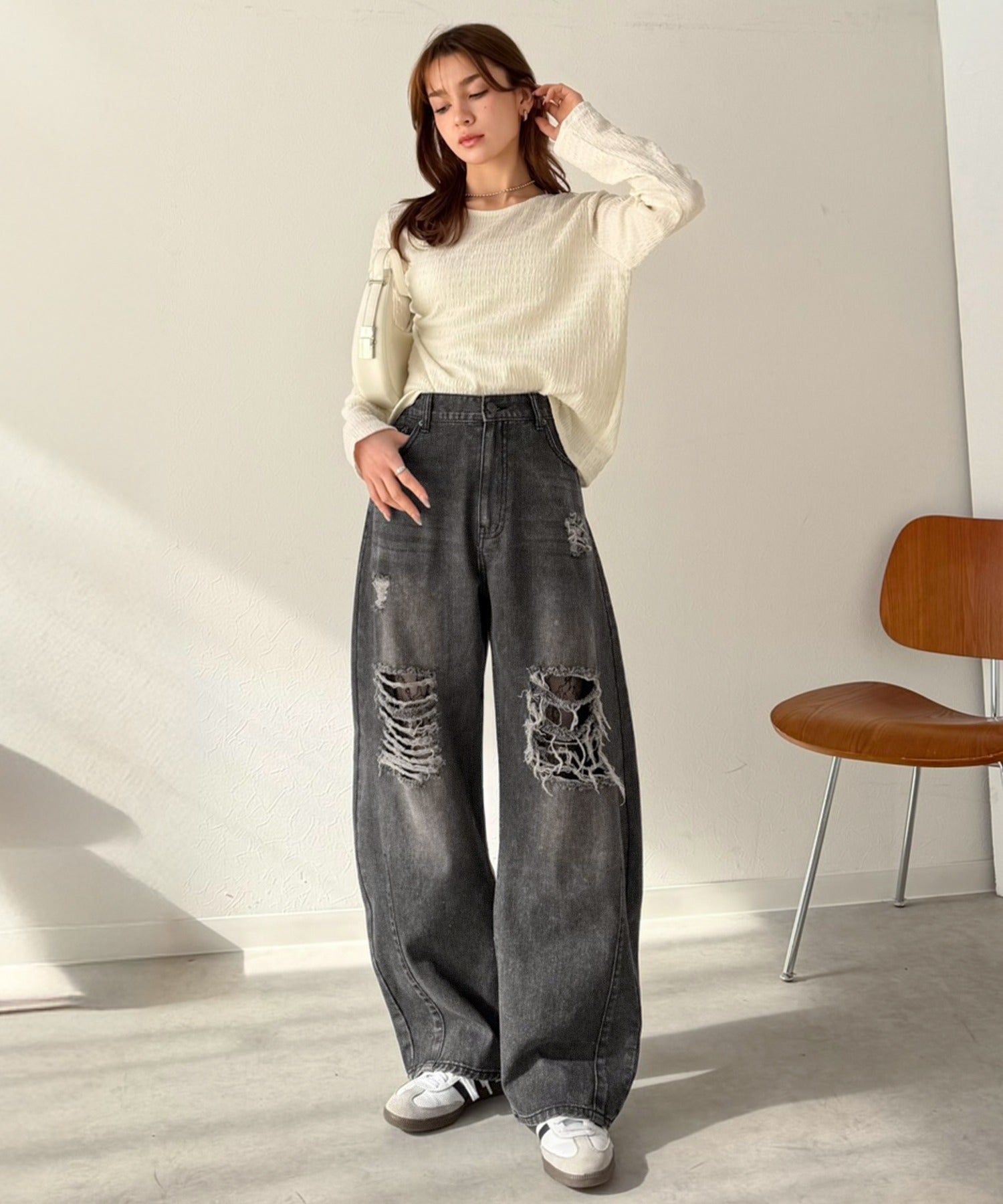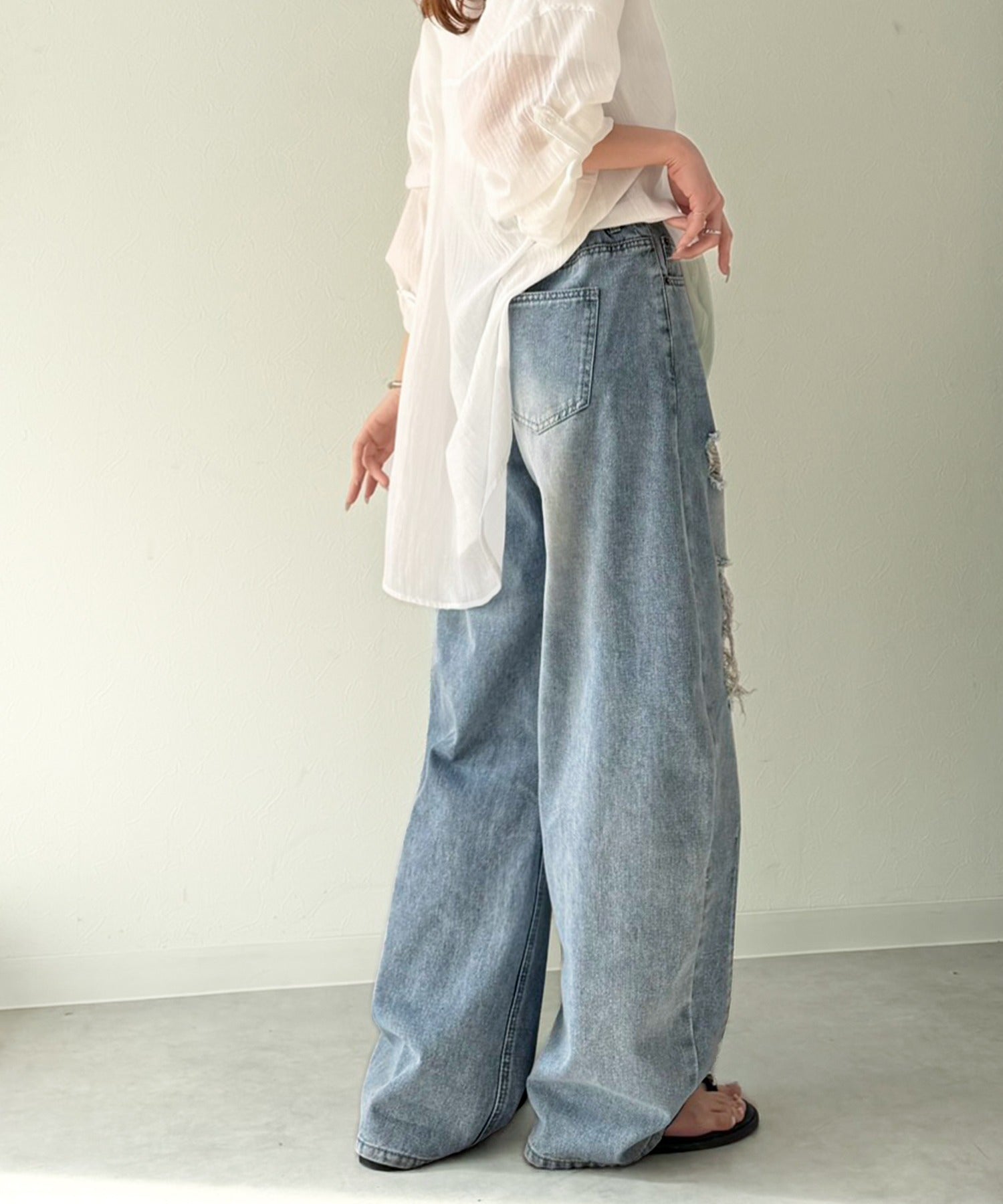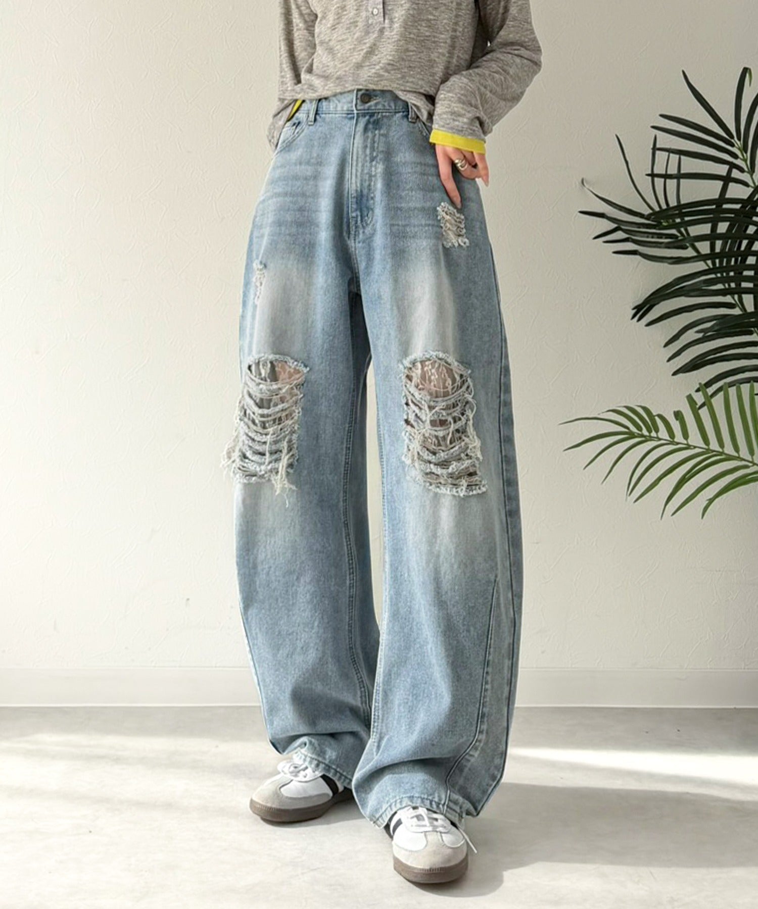 程よい厚みのデニムに、ダメージ部分は内側からレースを重ね、上品な肌見せを演出。