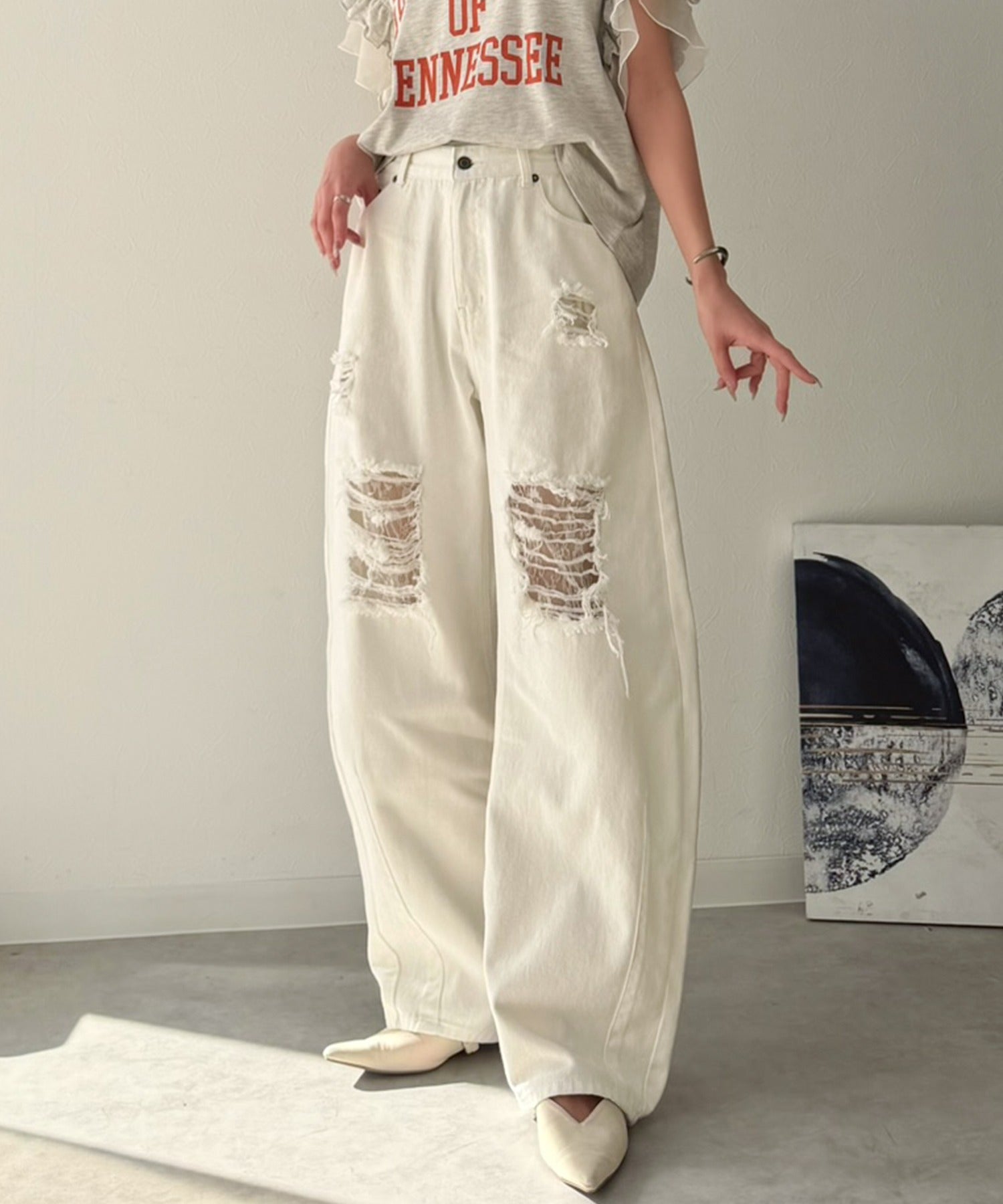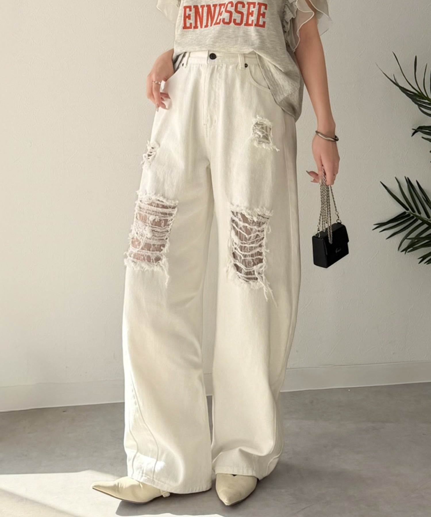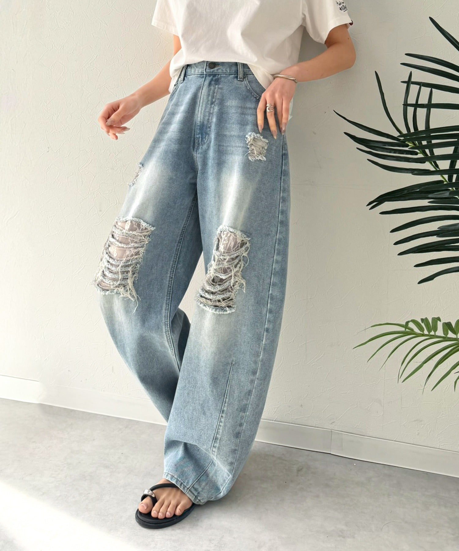 レースと曲線美で魅せる大人仕様の上品ダメージデニム。