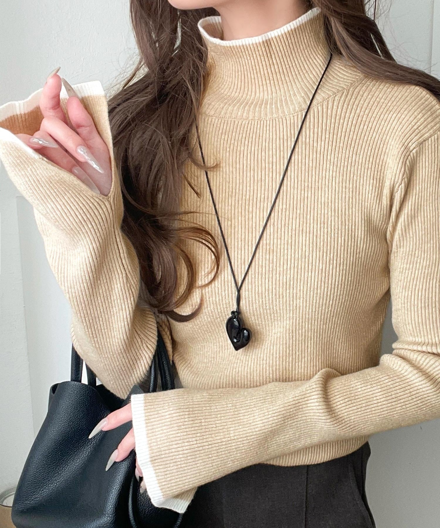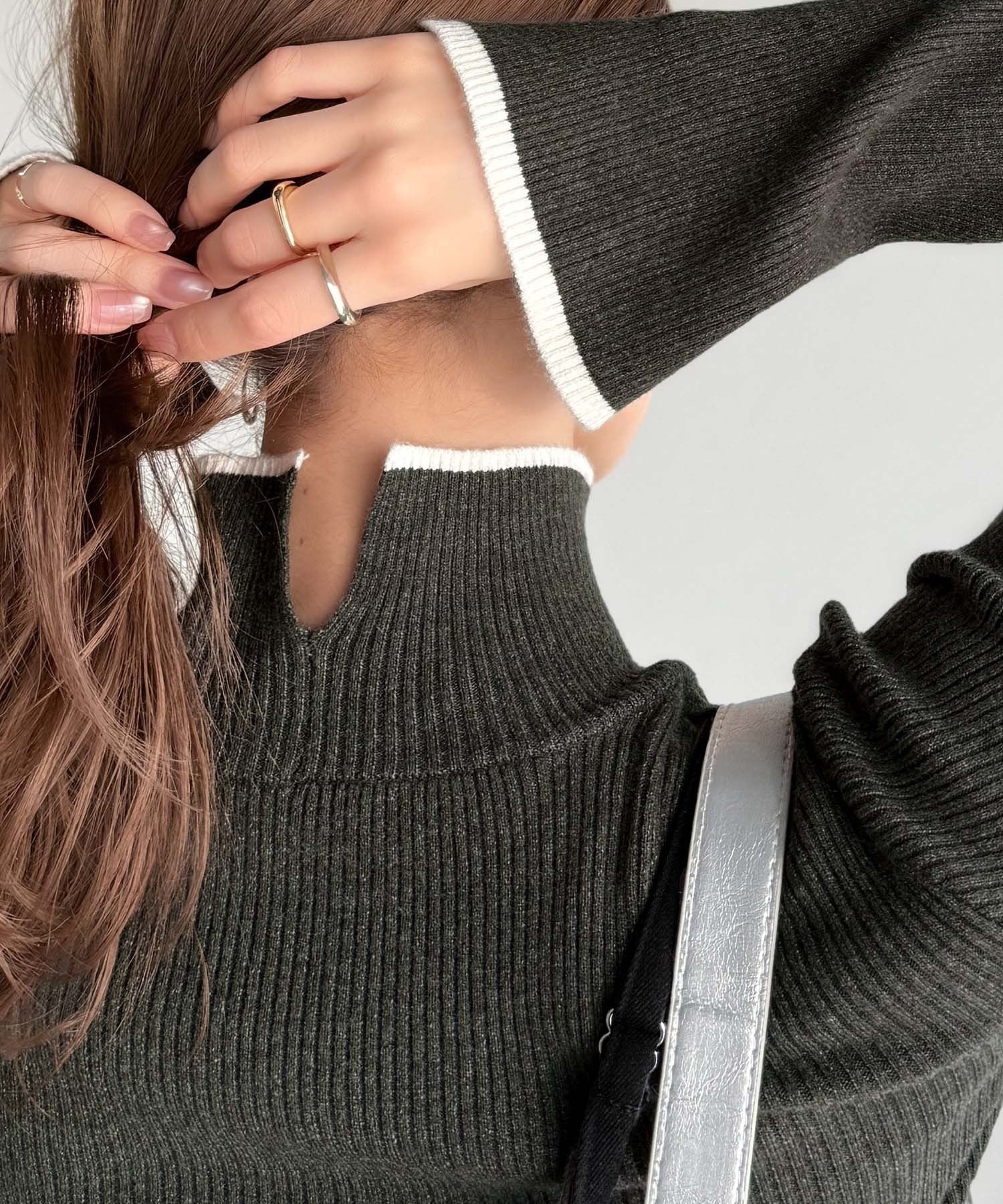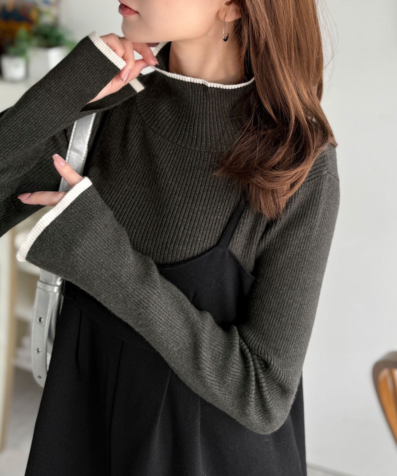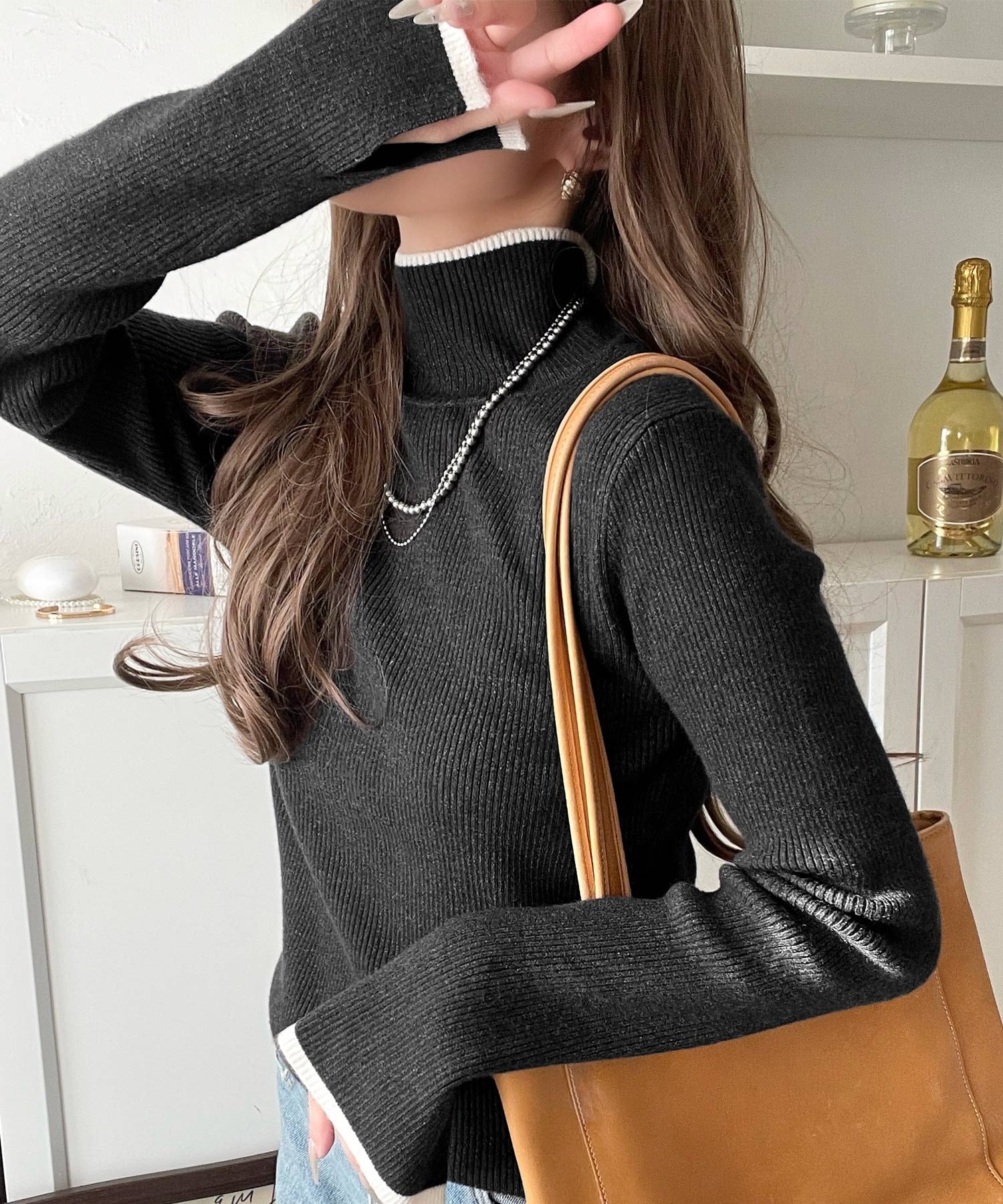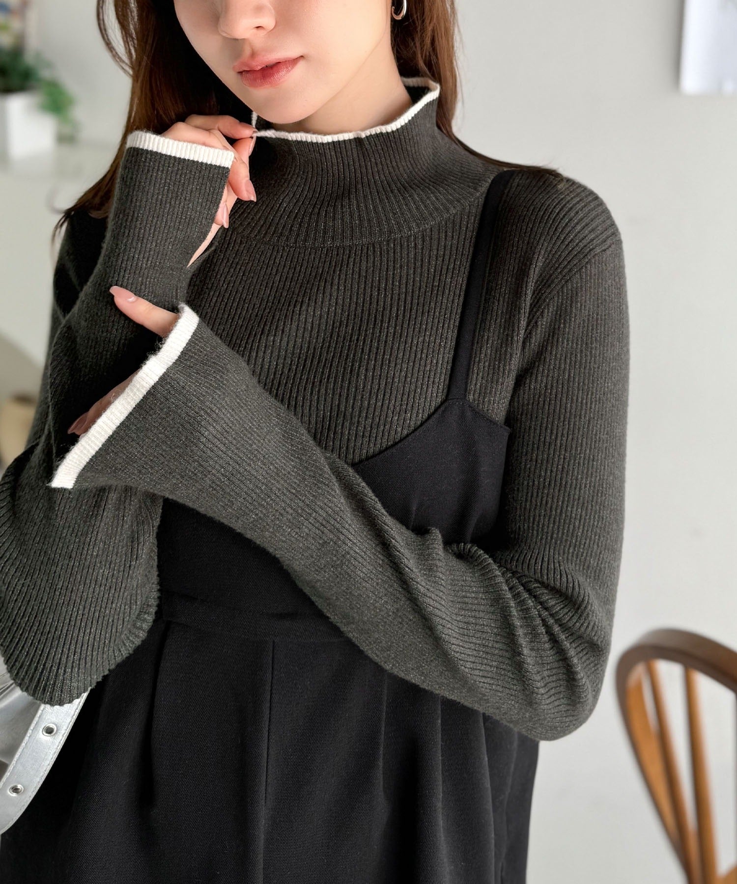 衿と袖口の配色ラインが、顔まわりを華やかに引き立てるハイネックリブニット。