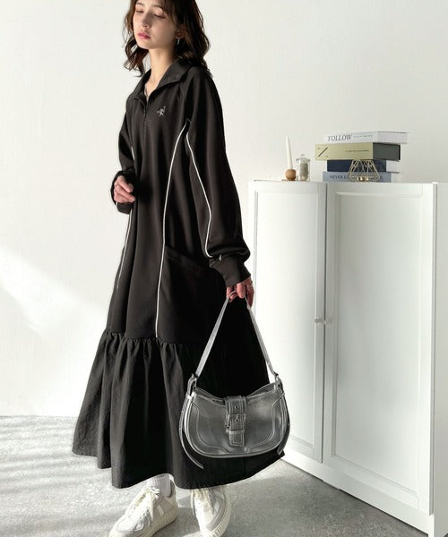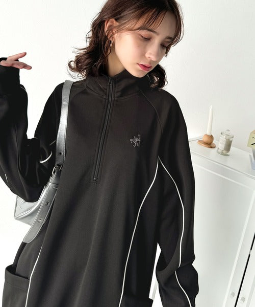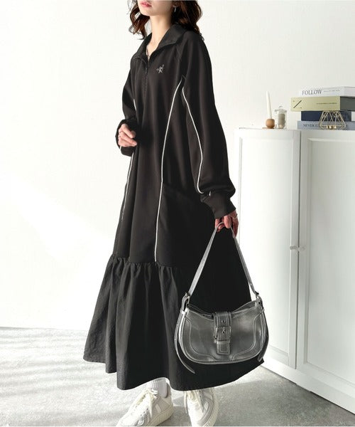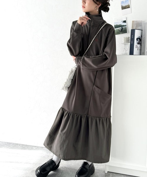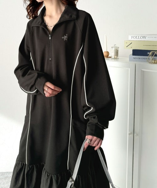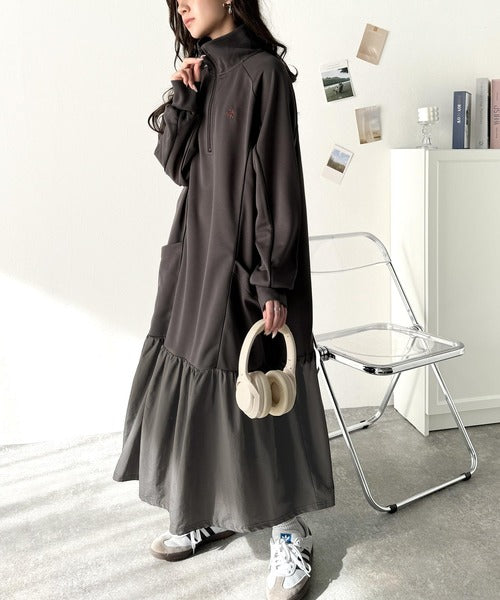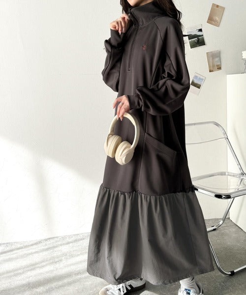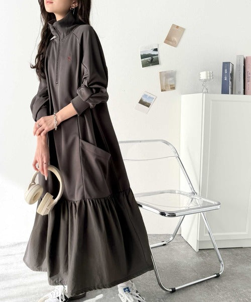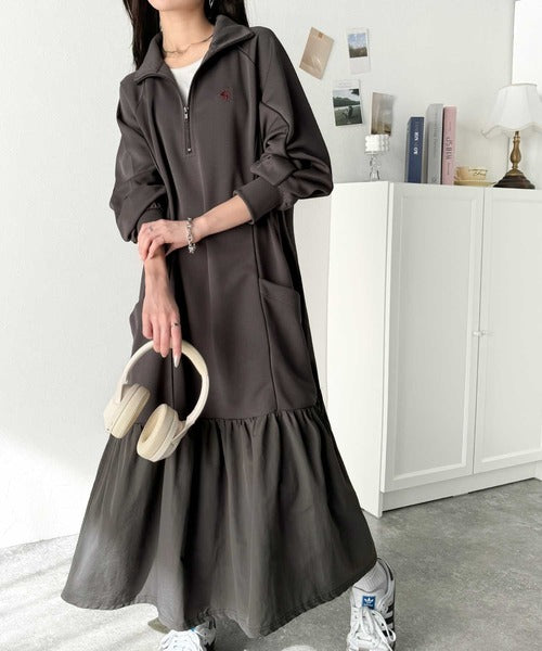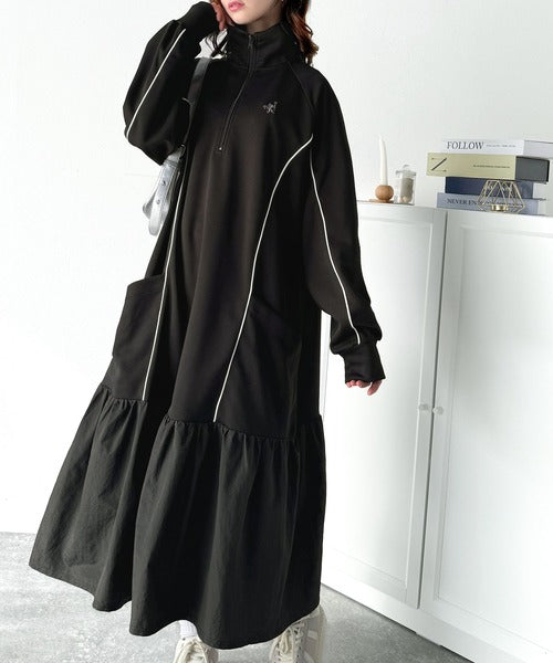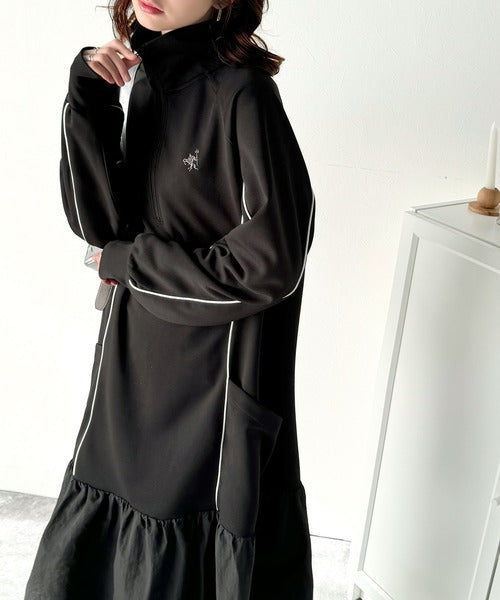 スポーツMIIX!胸元刺繍入り異素材ドッキングハーフジップパイピングジャージワンピース(ロング丈) ce1010366