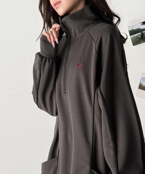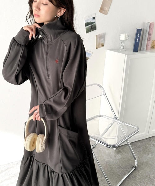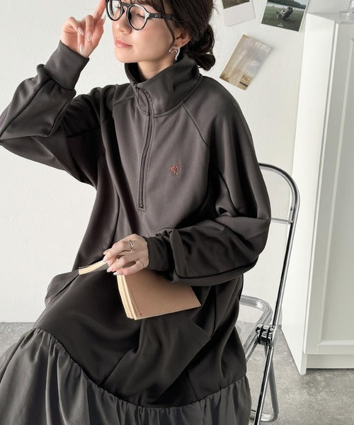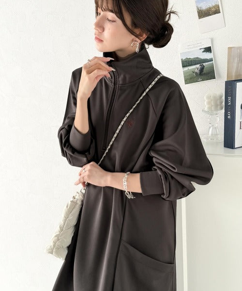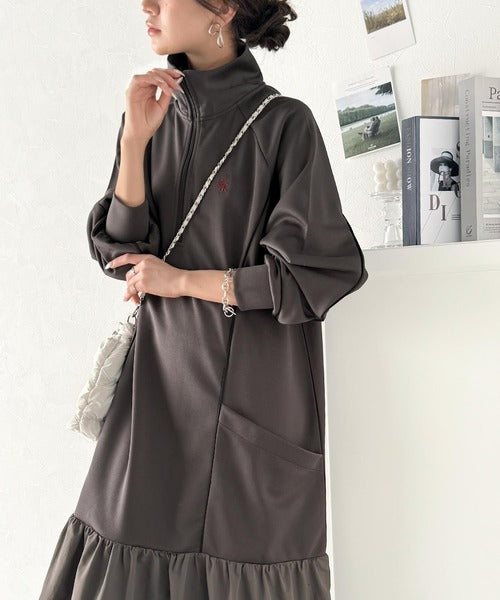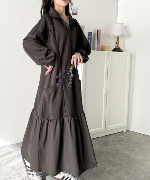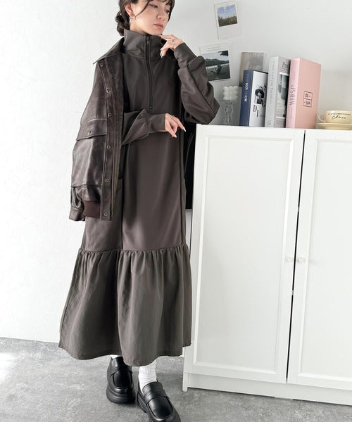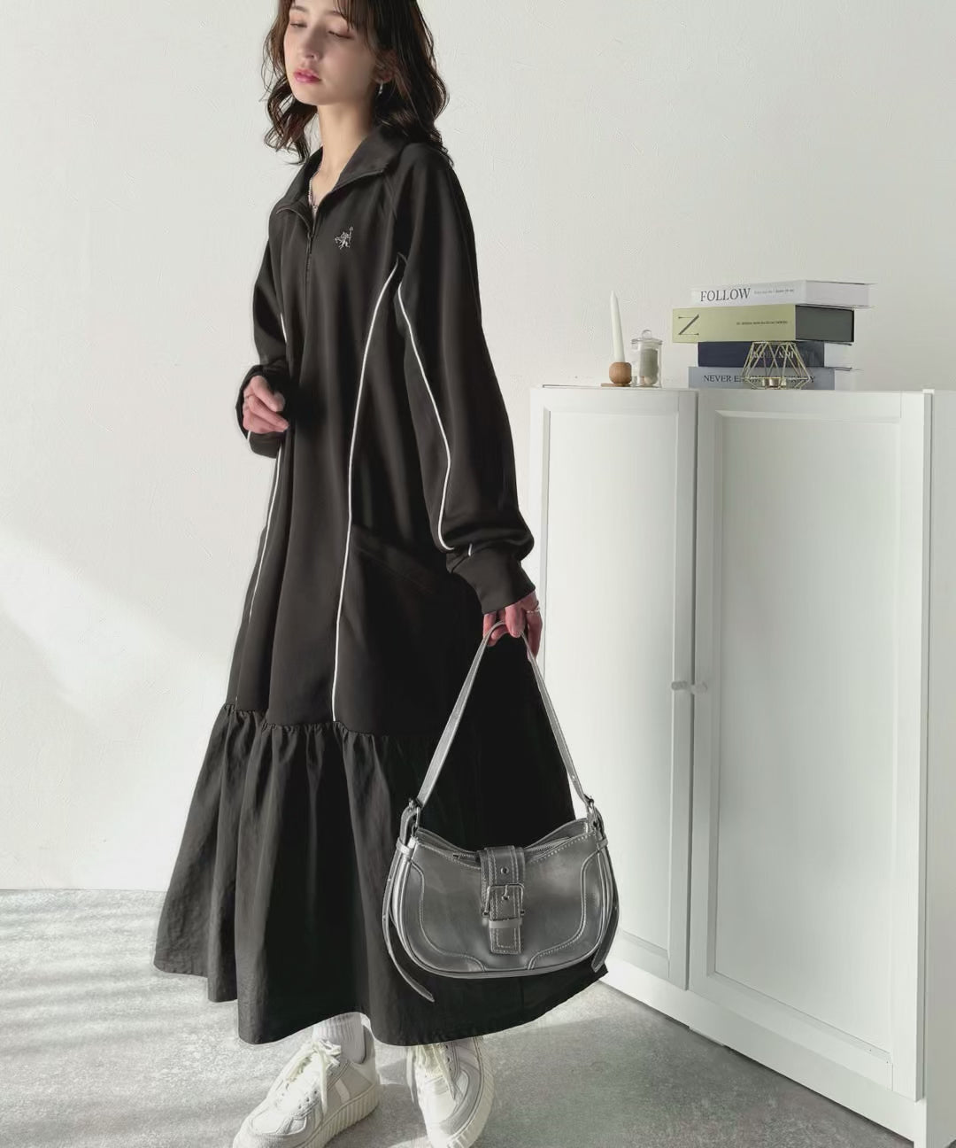スポーツMIIX!胸元刺繍入り異素材ドッキングハーフジップパイピングジャージワンピース(ロング丈) ce1010366