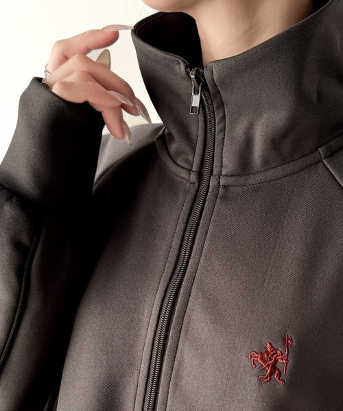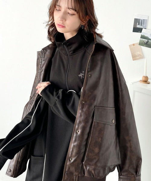 ジャージ素材との組み合わせがスタイリッシュな印象。