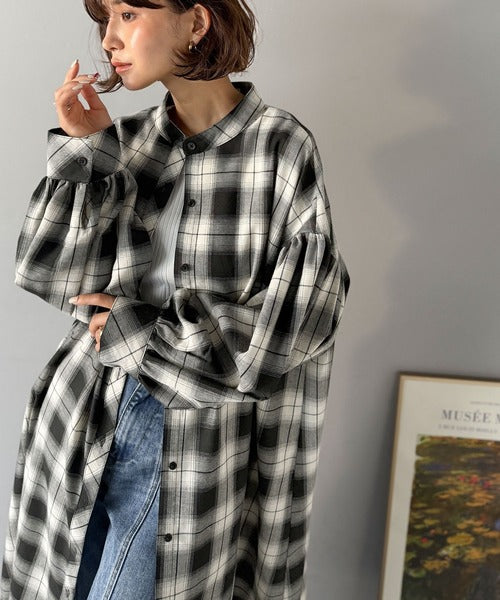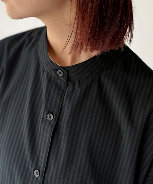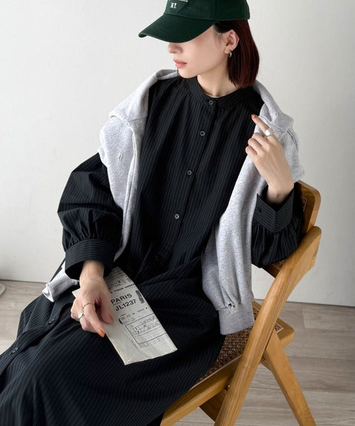 首元はすっきりとしたバンドカラー仕様で、全体にたっぷりギャザーを施したボリューム感のあるシャツワンピース。
