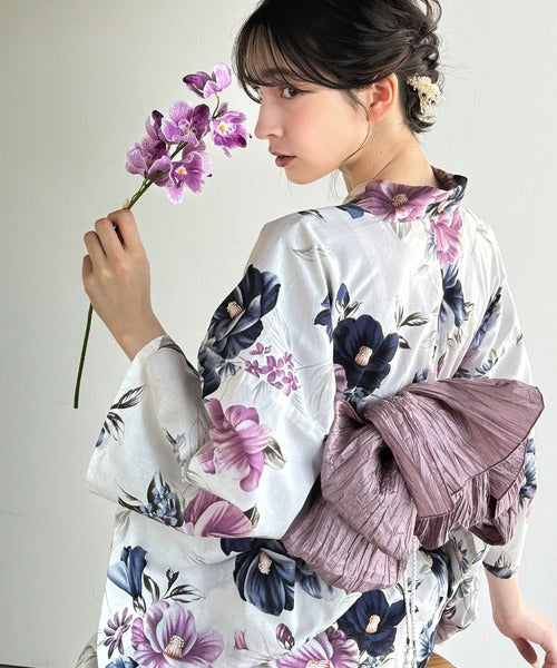 アイボリーベース×薄紫と濃紺の花柄(帯は薄紫色)