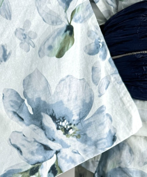 アイボリーベース×水色の花柄(帯は紺色)