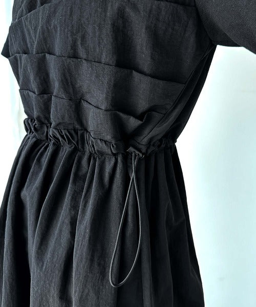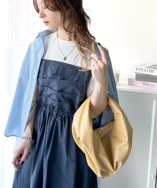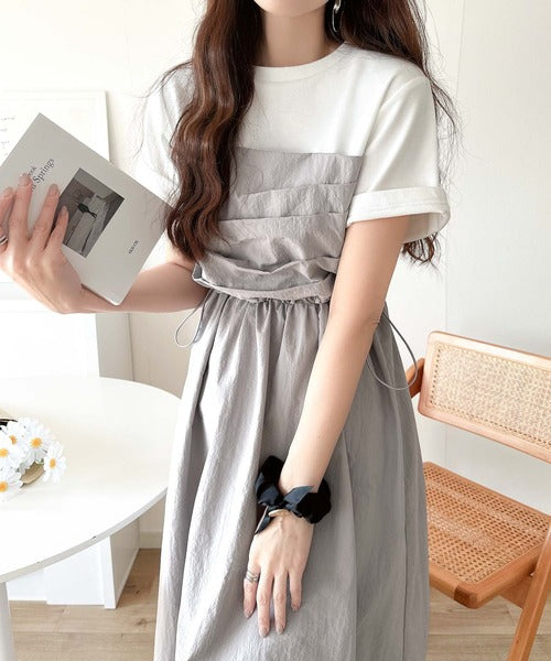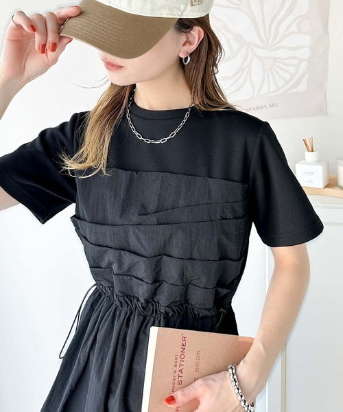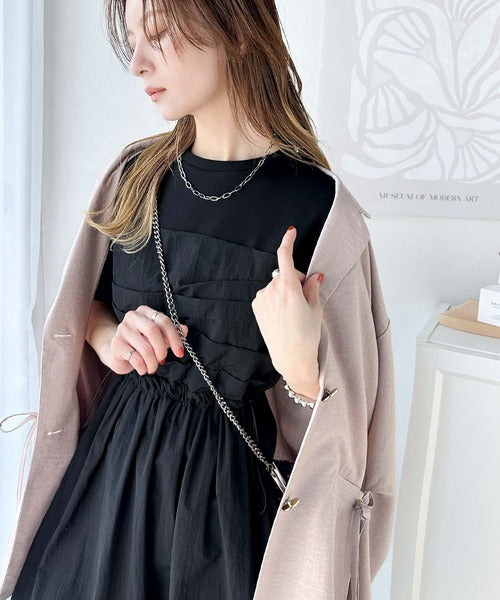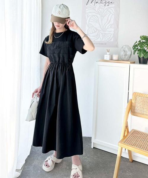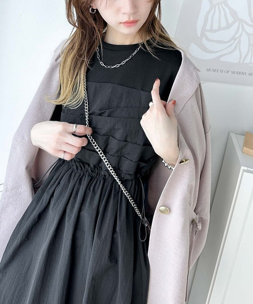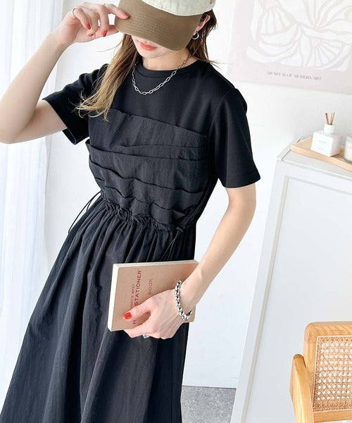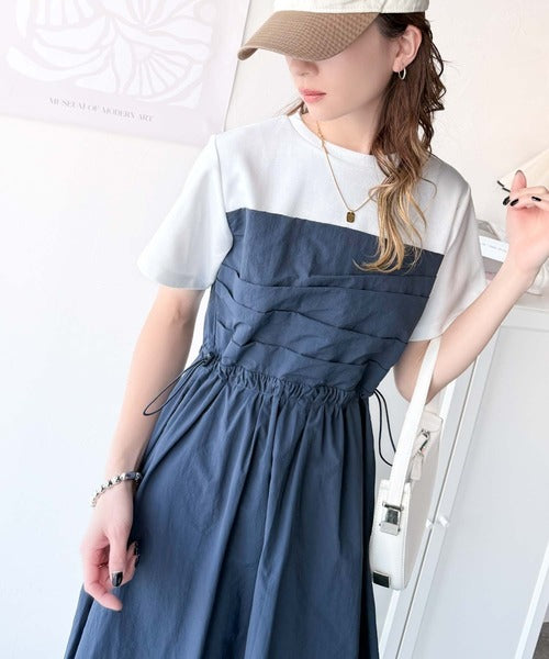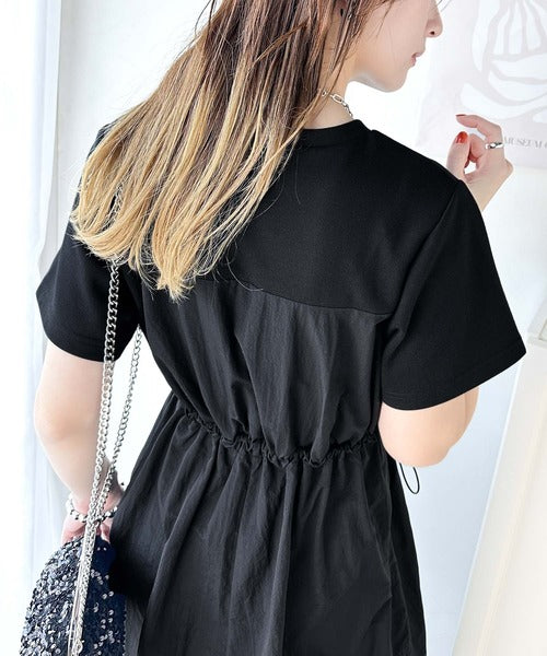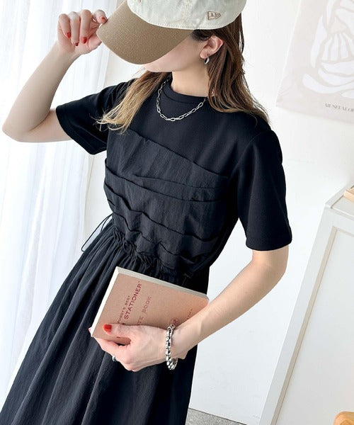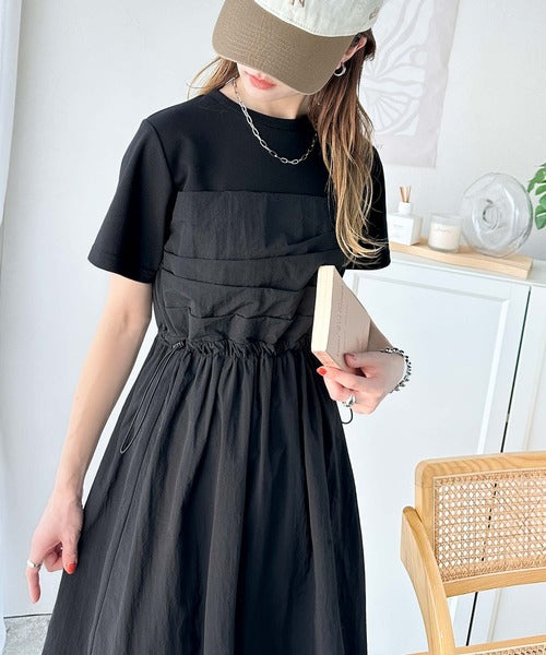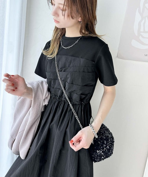 異素材コンビの1枚で決まるカジュアルワンピ。
