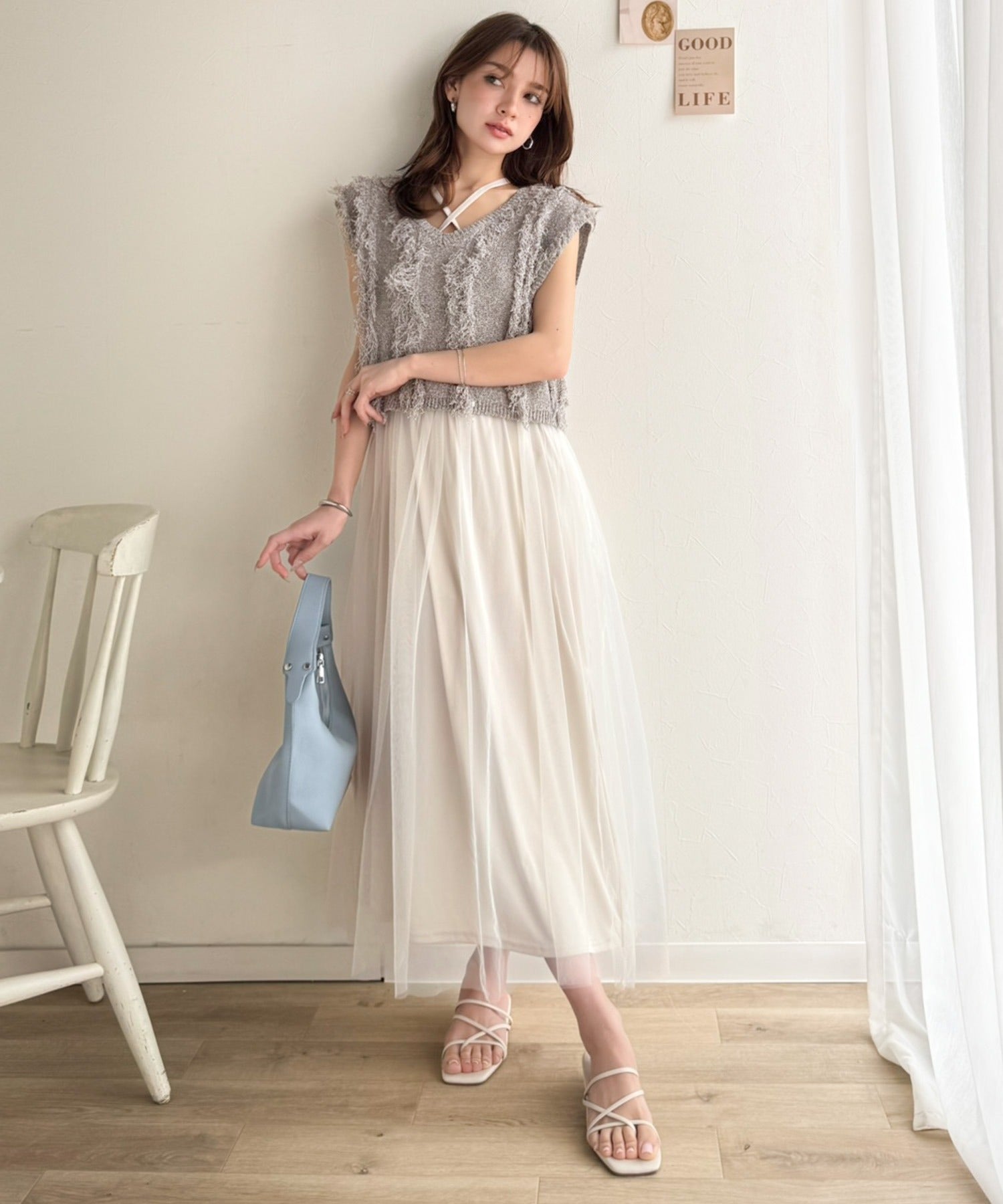 ヘルシーな肌見せが叶うフリンジニットと愛らしいチュールワンピースのセット。