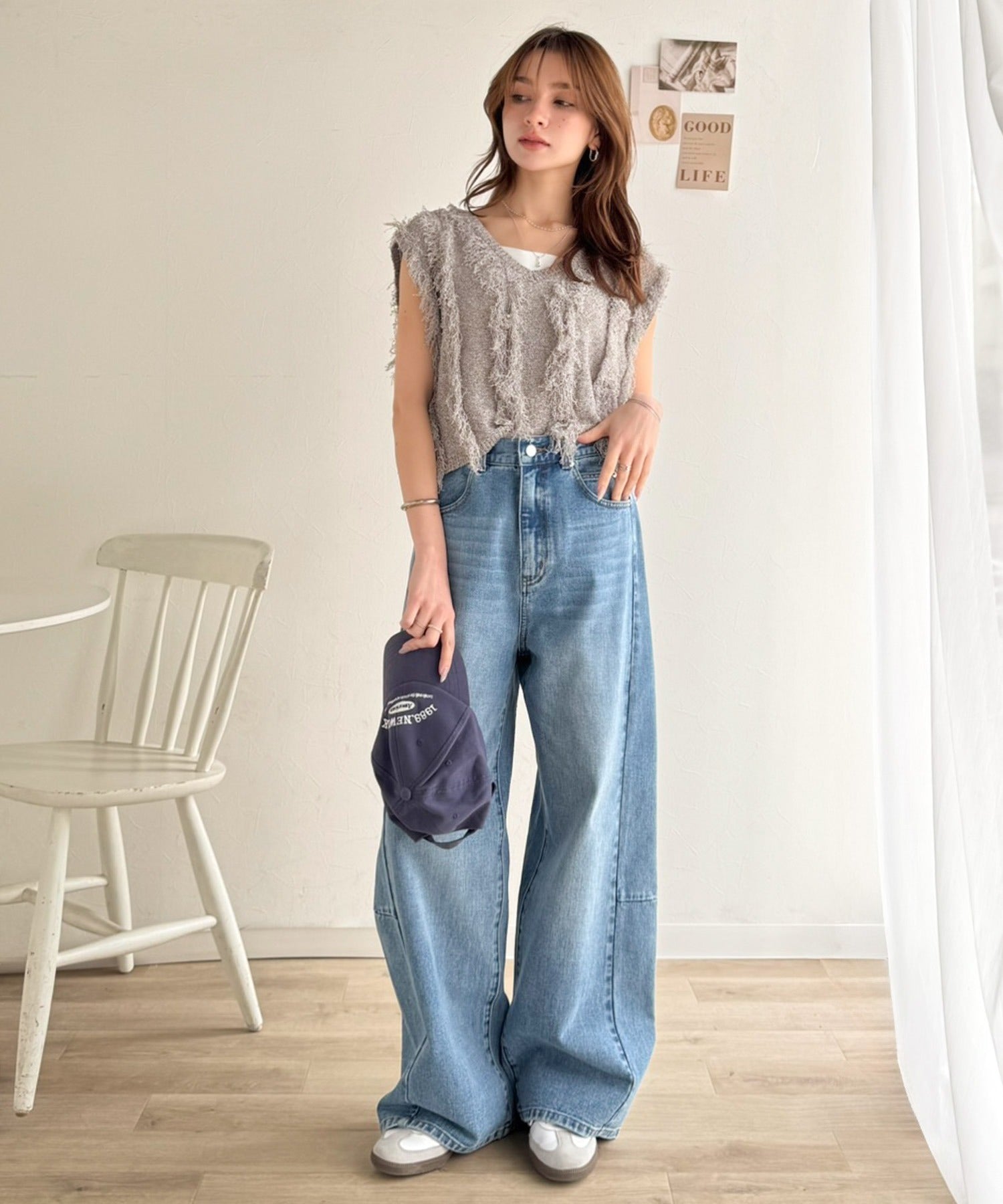 ニットベストにはデニムやワイドパンツを合わせればトレンドコーデに☆