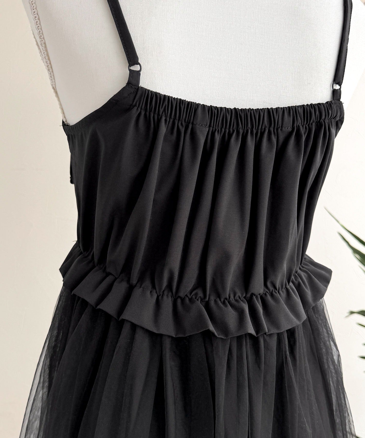 ワンピース:適度に張りのあるタフタ生地と柔らかくて落ち感のあるチュール生地のコンビ素材。