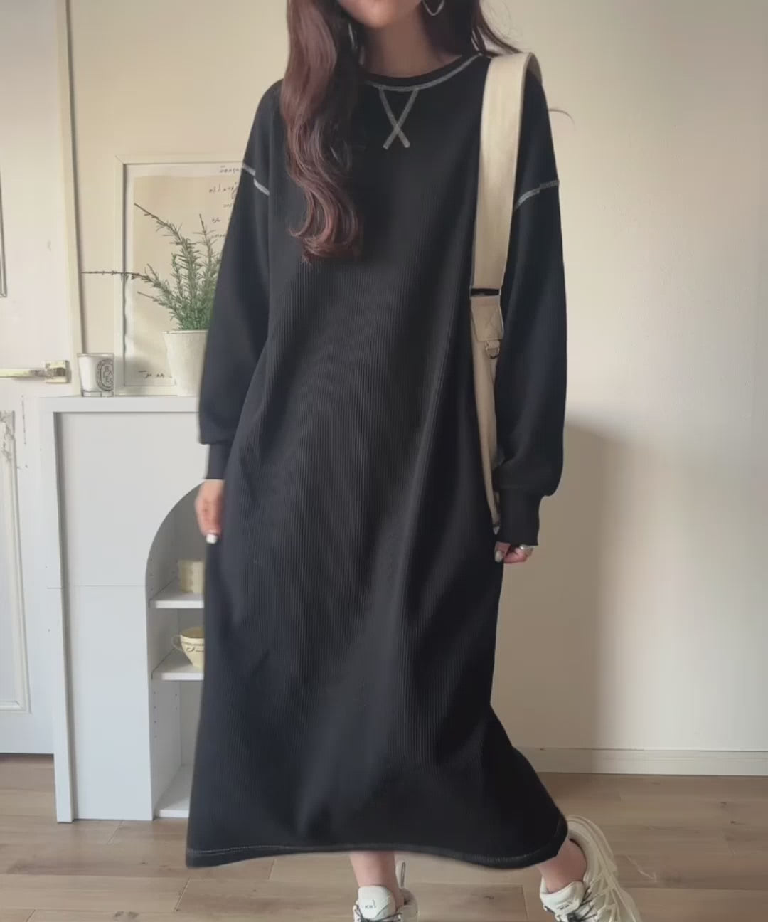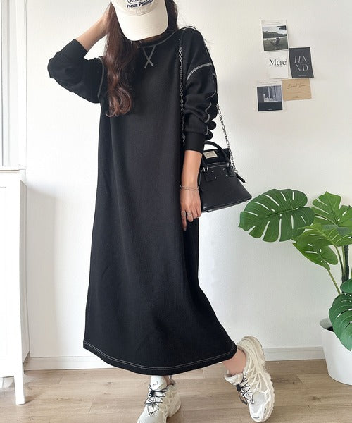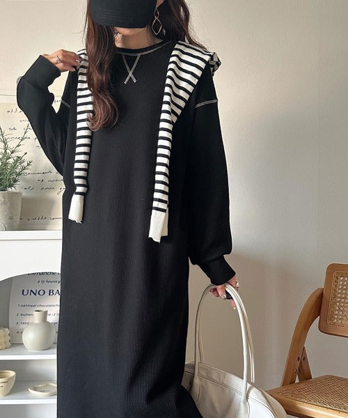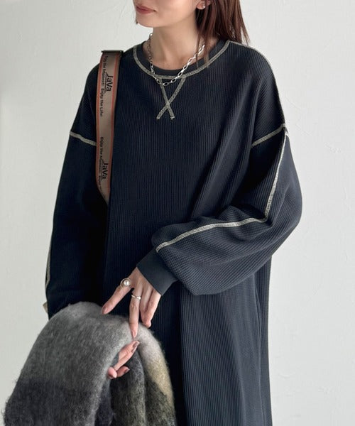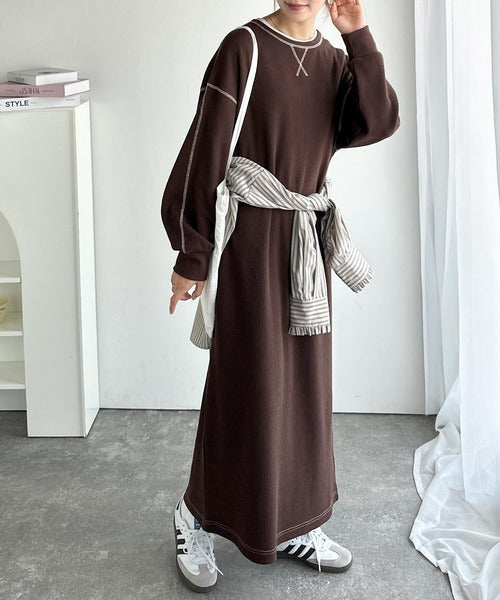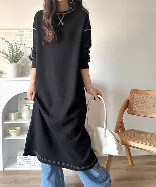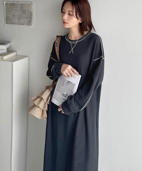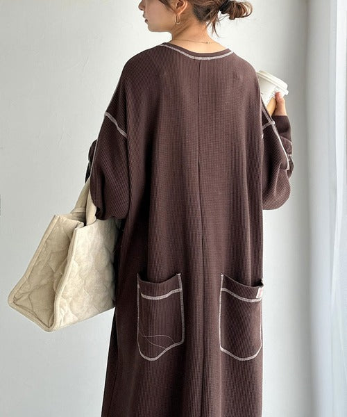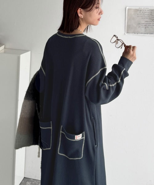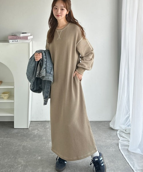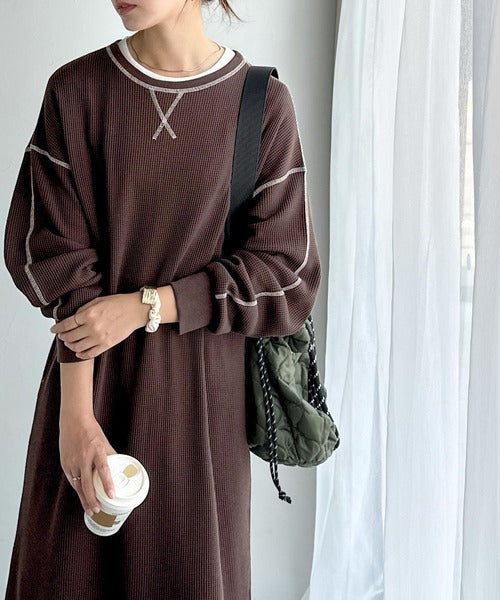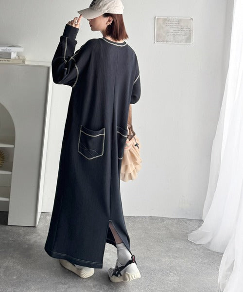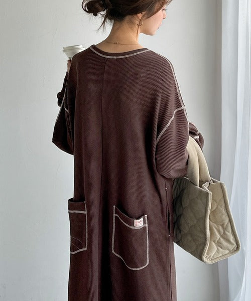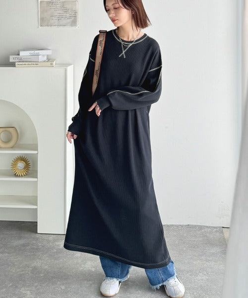 《JaVaジャバコラボ》後姿が可愛い◎配色ステッチワッフルロングワンピース(長袖) jv1260504