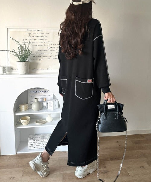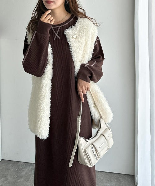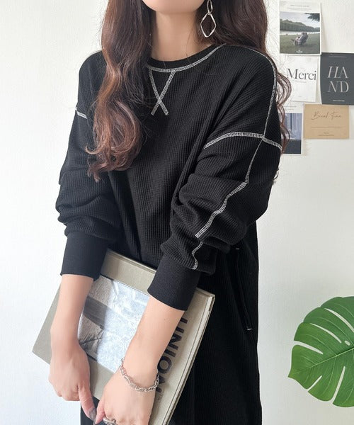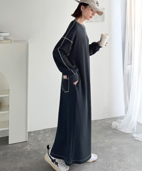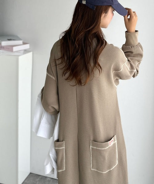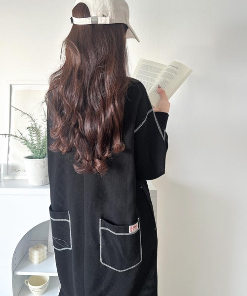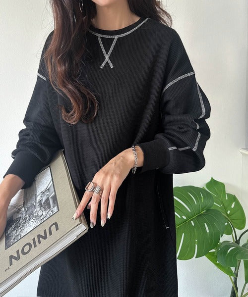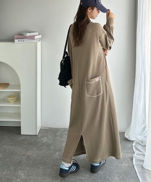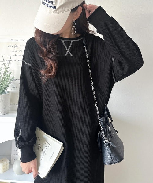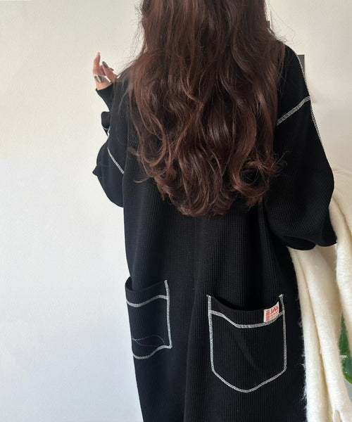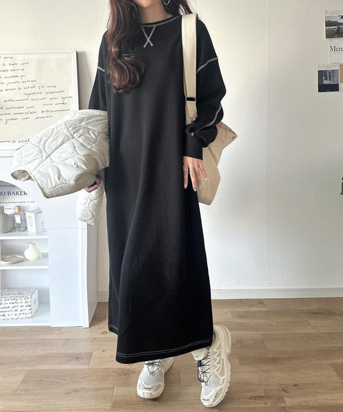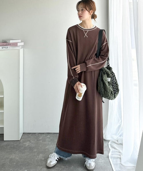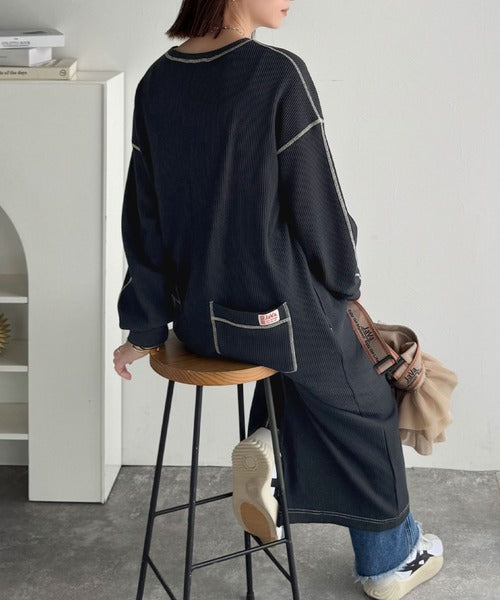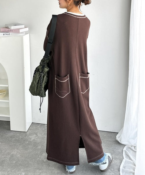 《JaVaジャバコラボ》後姿が可愛い◎配色ステッチワッフルロングワンピース(長袖) jv1260504