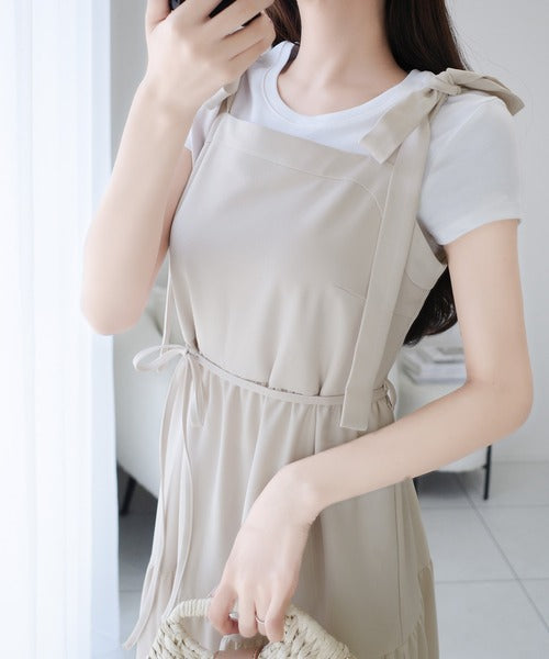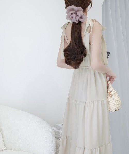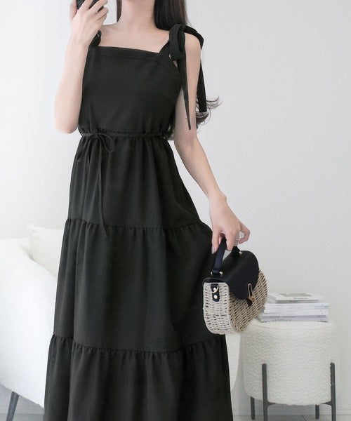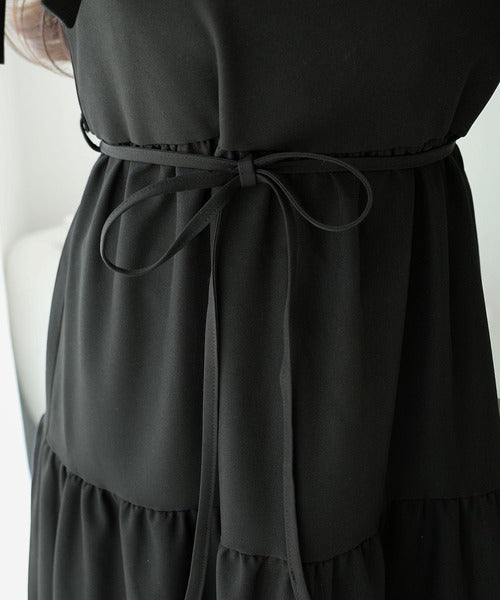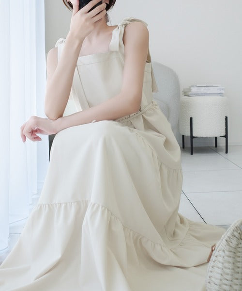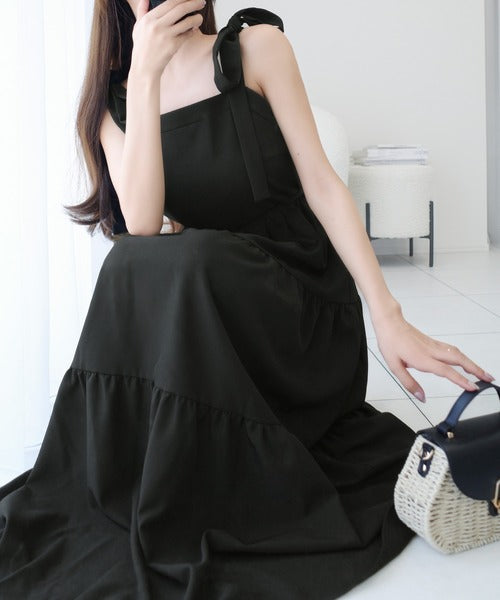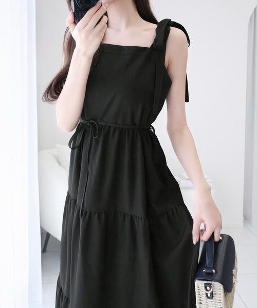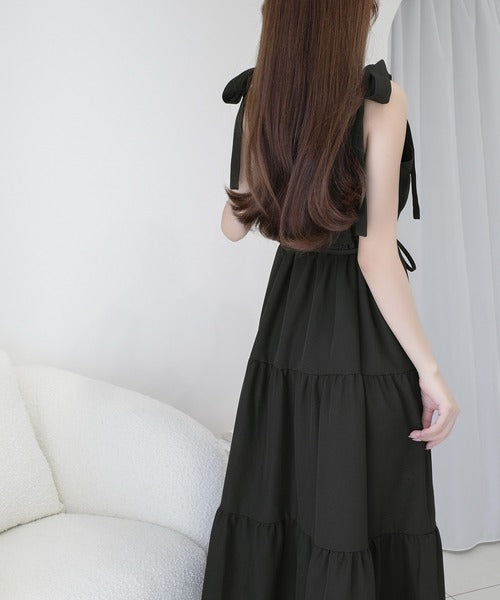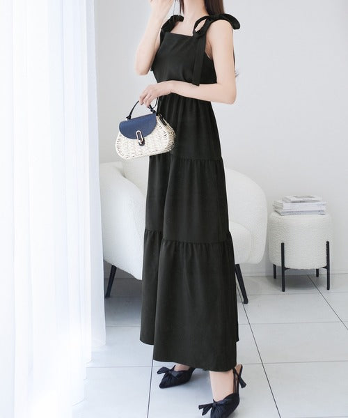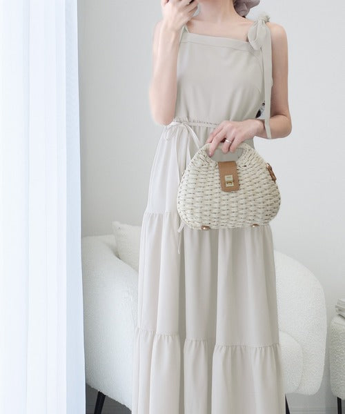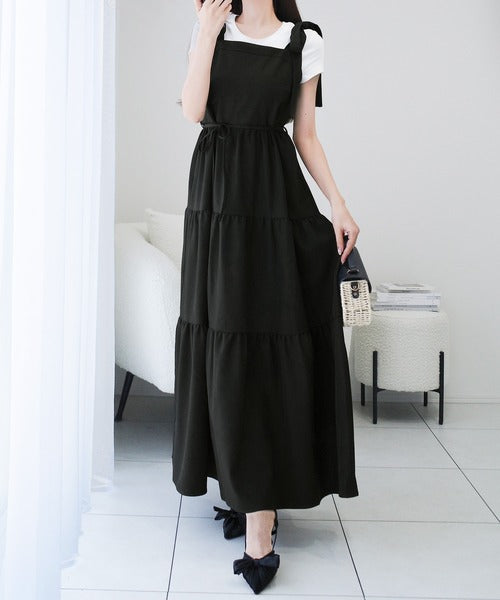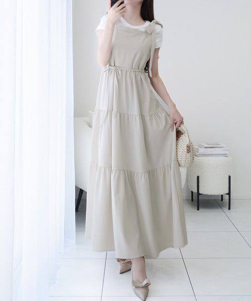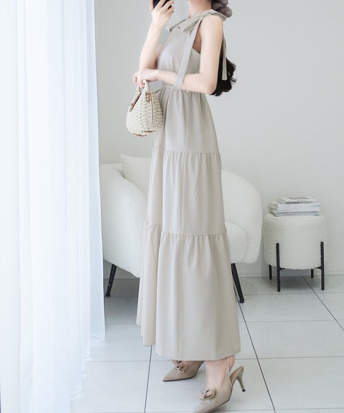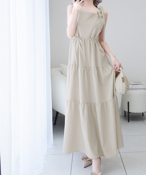 【mily bilet】上品な大人の甘さ惹き立てる、麻ライクなリボン使いキャミティアードワンピース(ロング) mi0789008