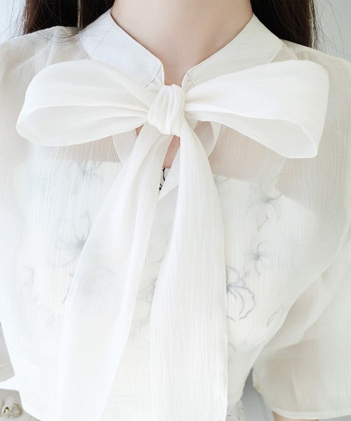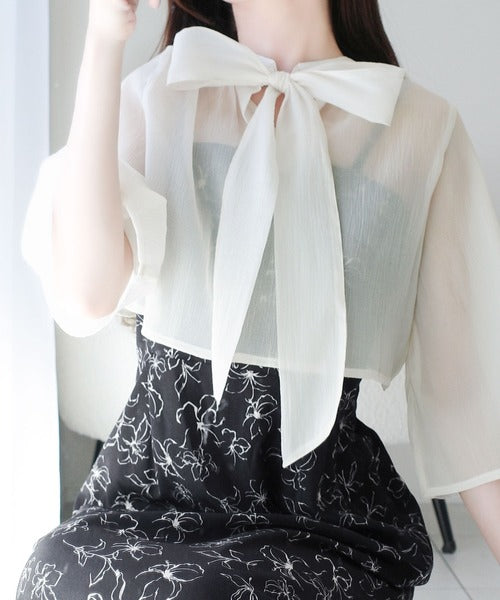 優しいアイボリー色のブラウスは、前でリボンを結べば清楚な印象に。