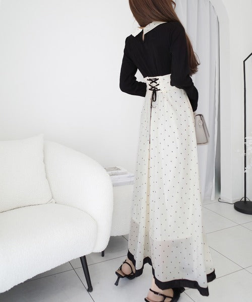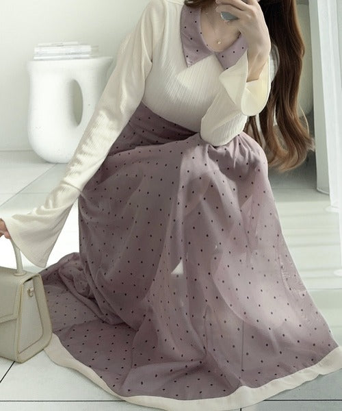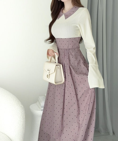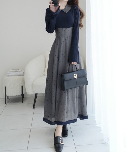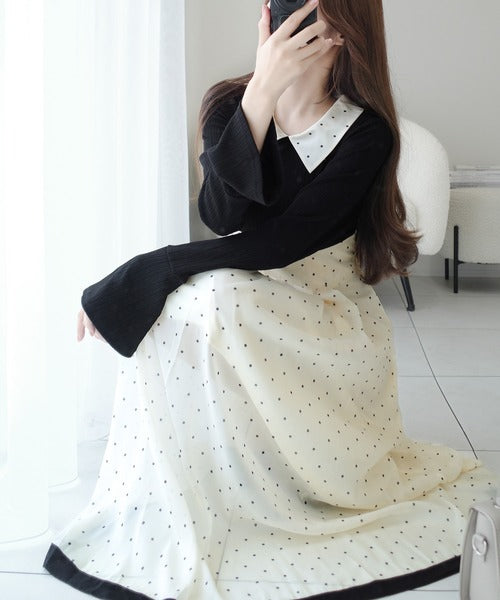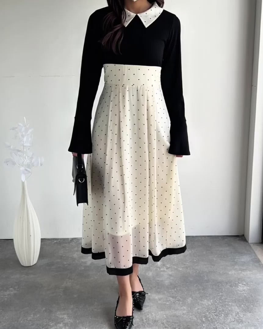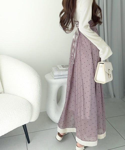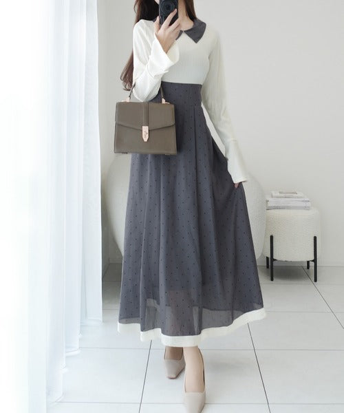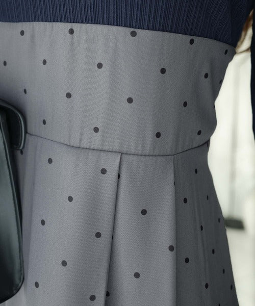 小さなドット柄がトレンド感を演出し、裾の無地切り替えが清楚な印象を与えます♪
