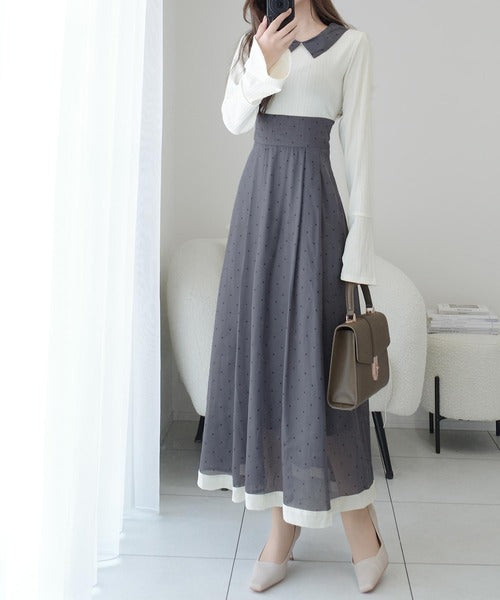 【mily bilet】清楚見えする切り替え配色フレア袖ドッキングワンピース(ロング丈) mi1139094