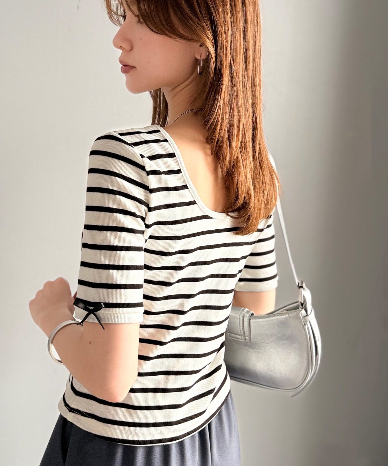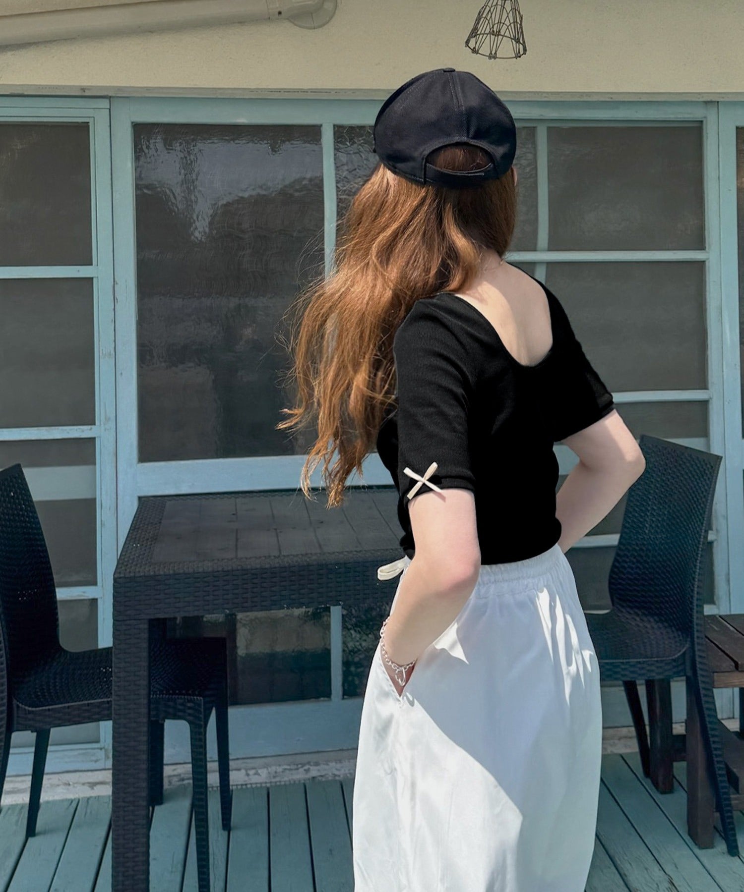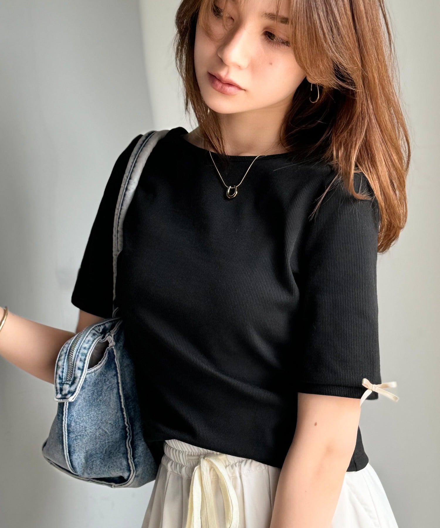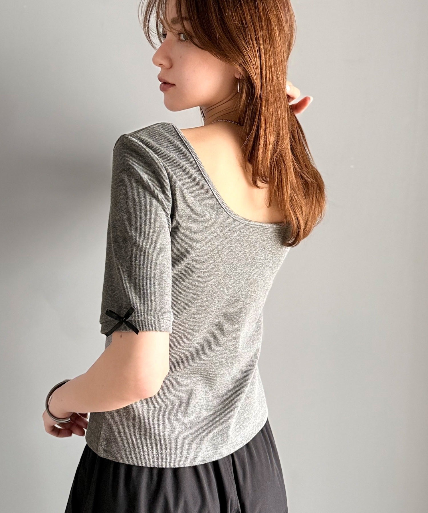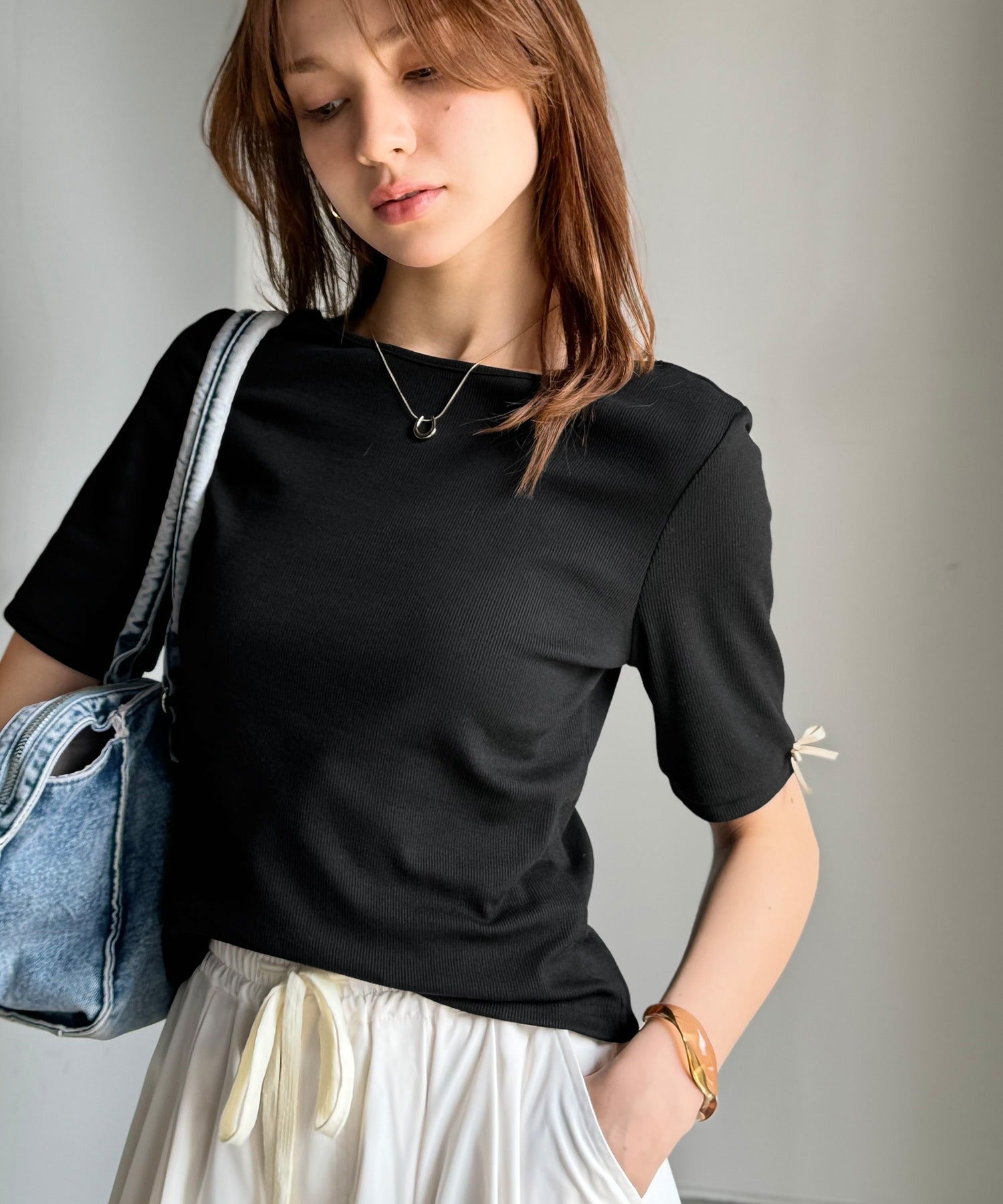 背中開き×袖リボンのフェミニンなアクセントが魅力のリブトップス。