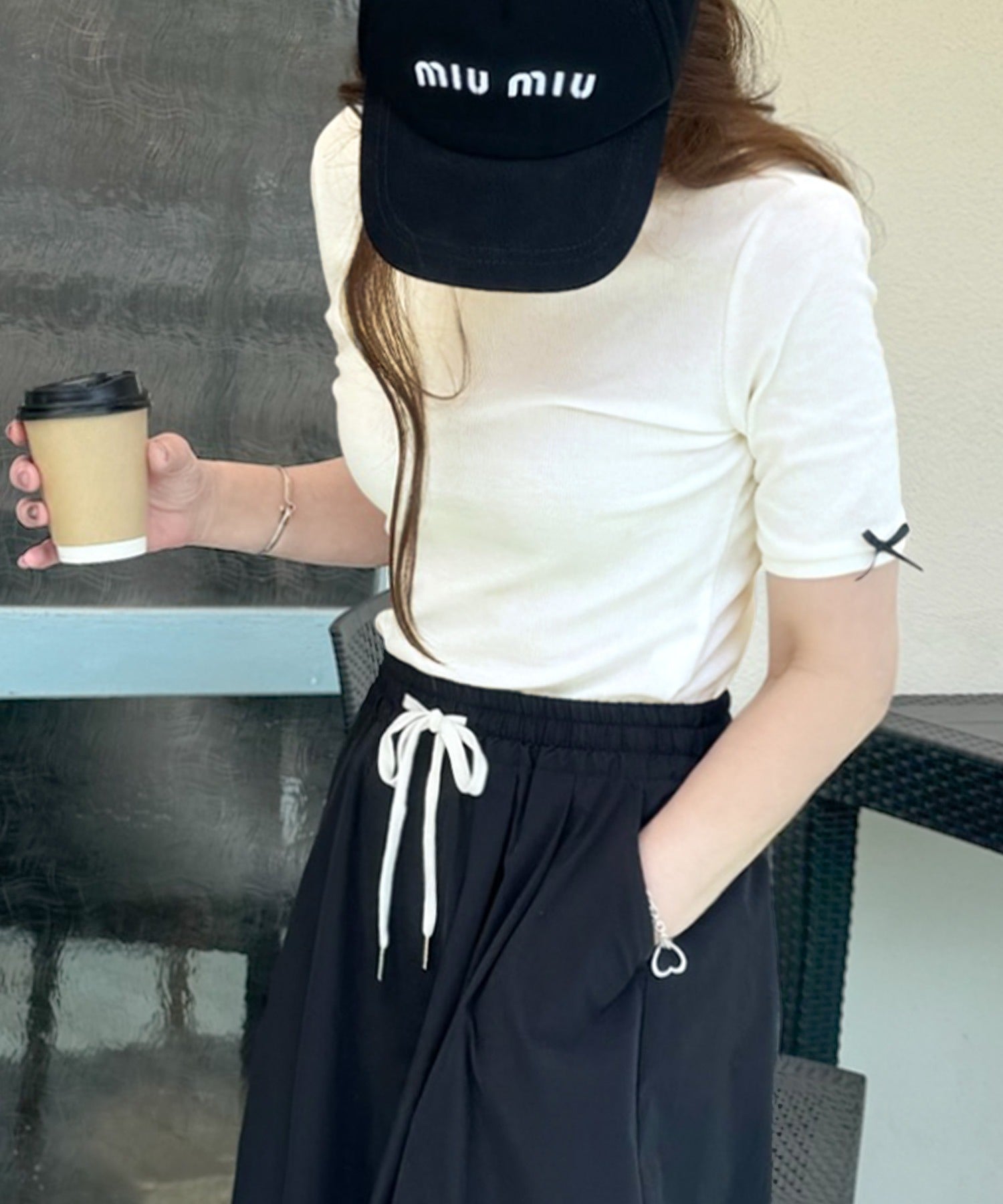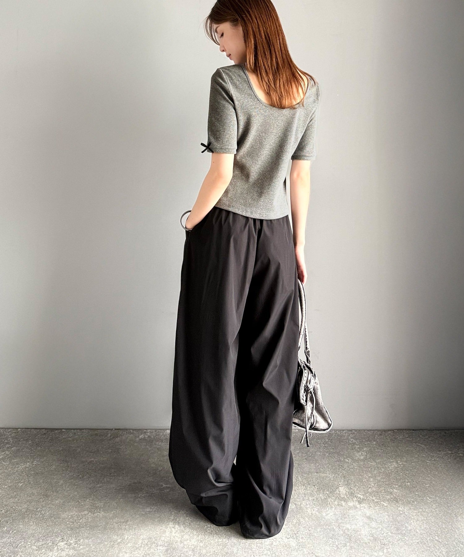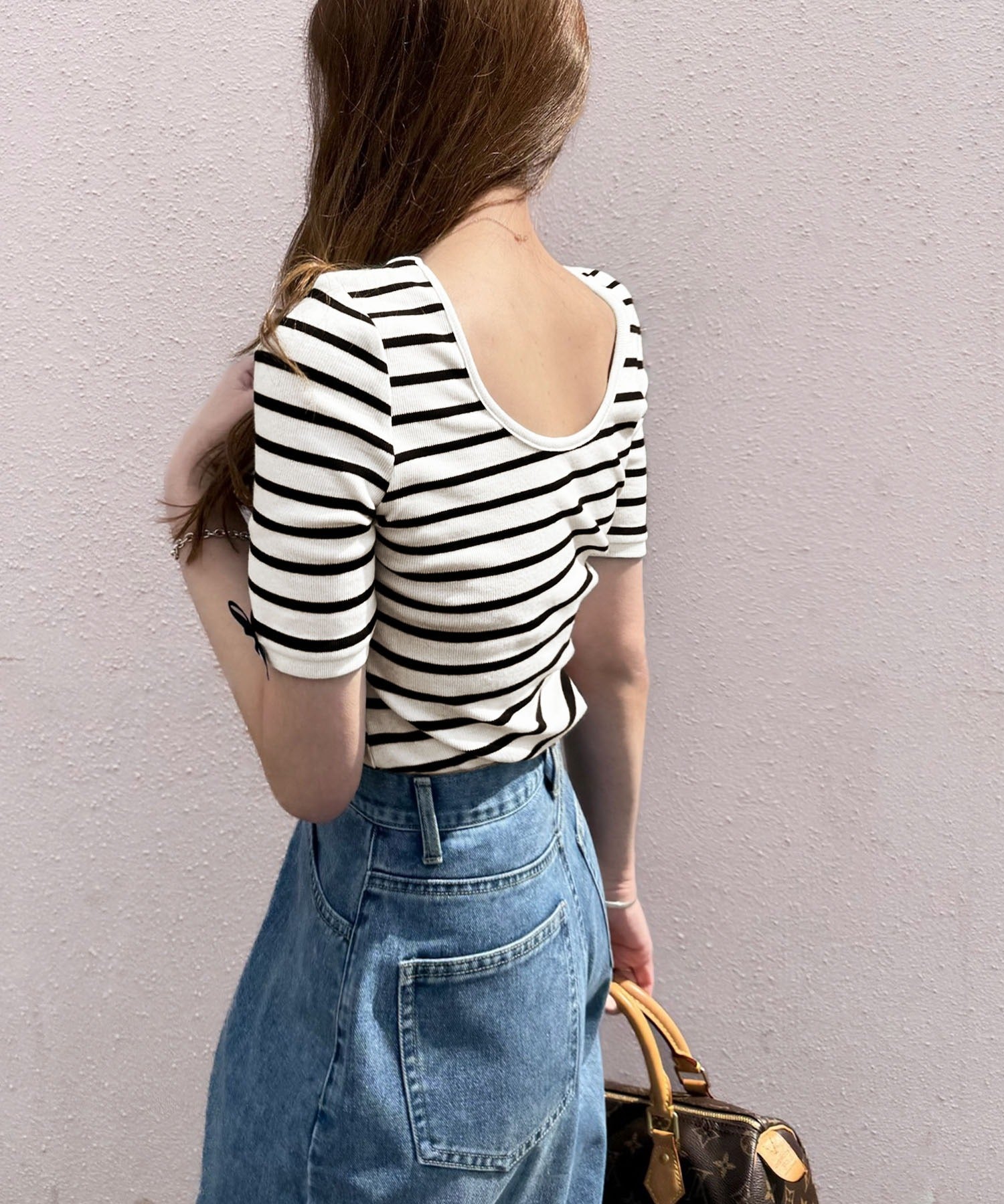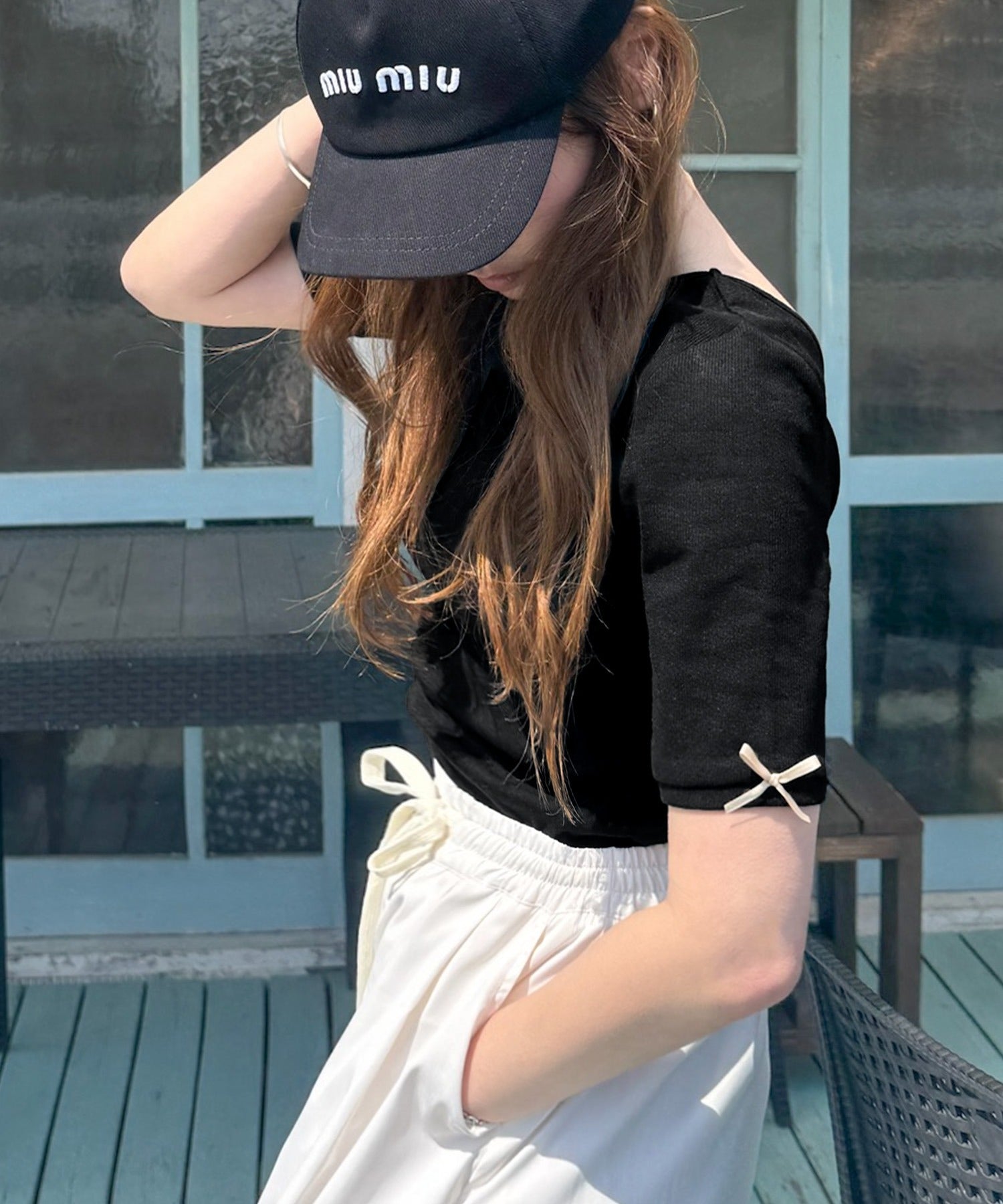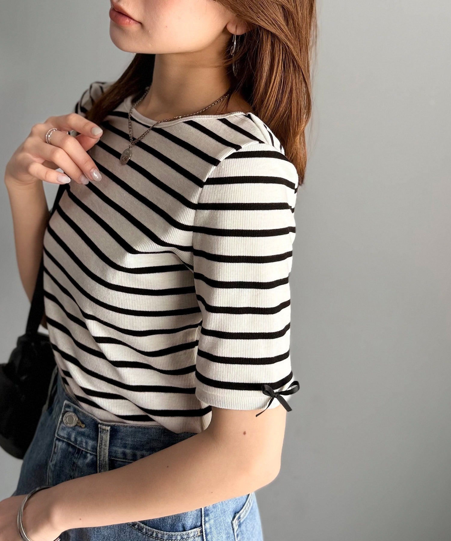 背中開き×袖リボンのフェミニンなアクセントが魅力のリブトップス。