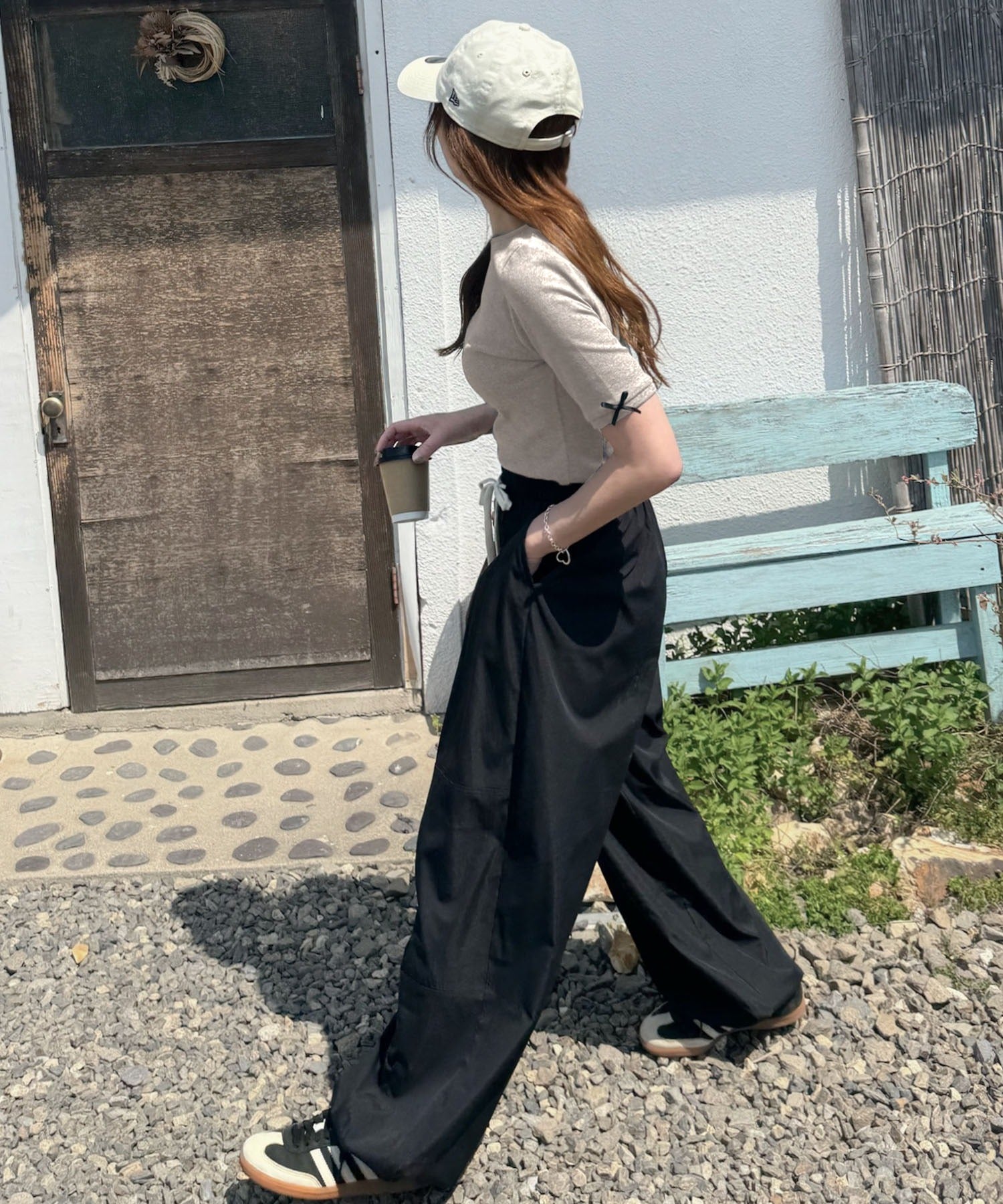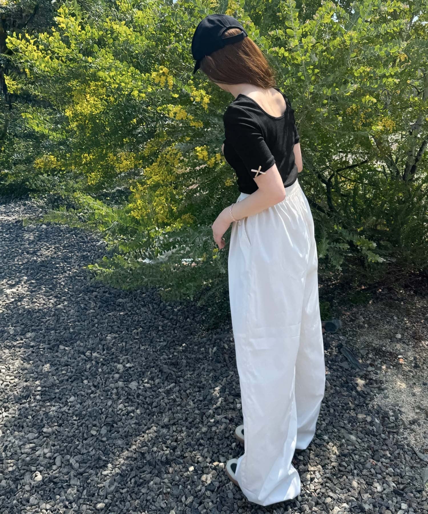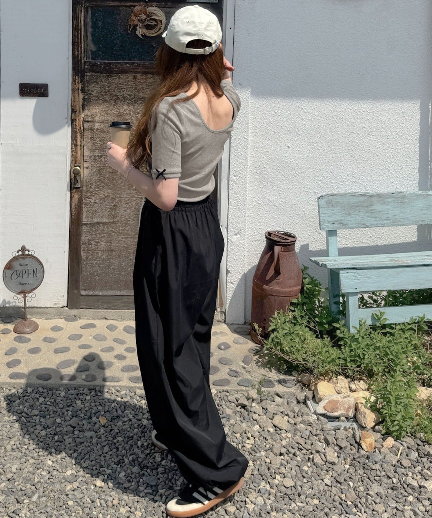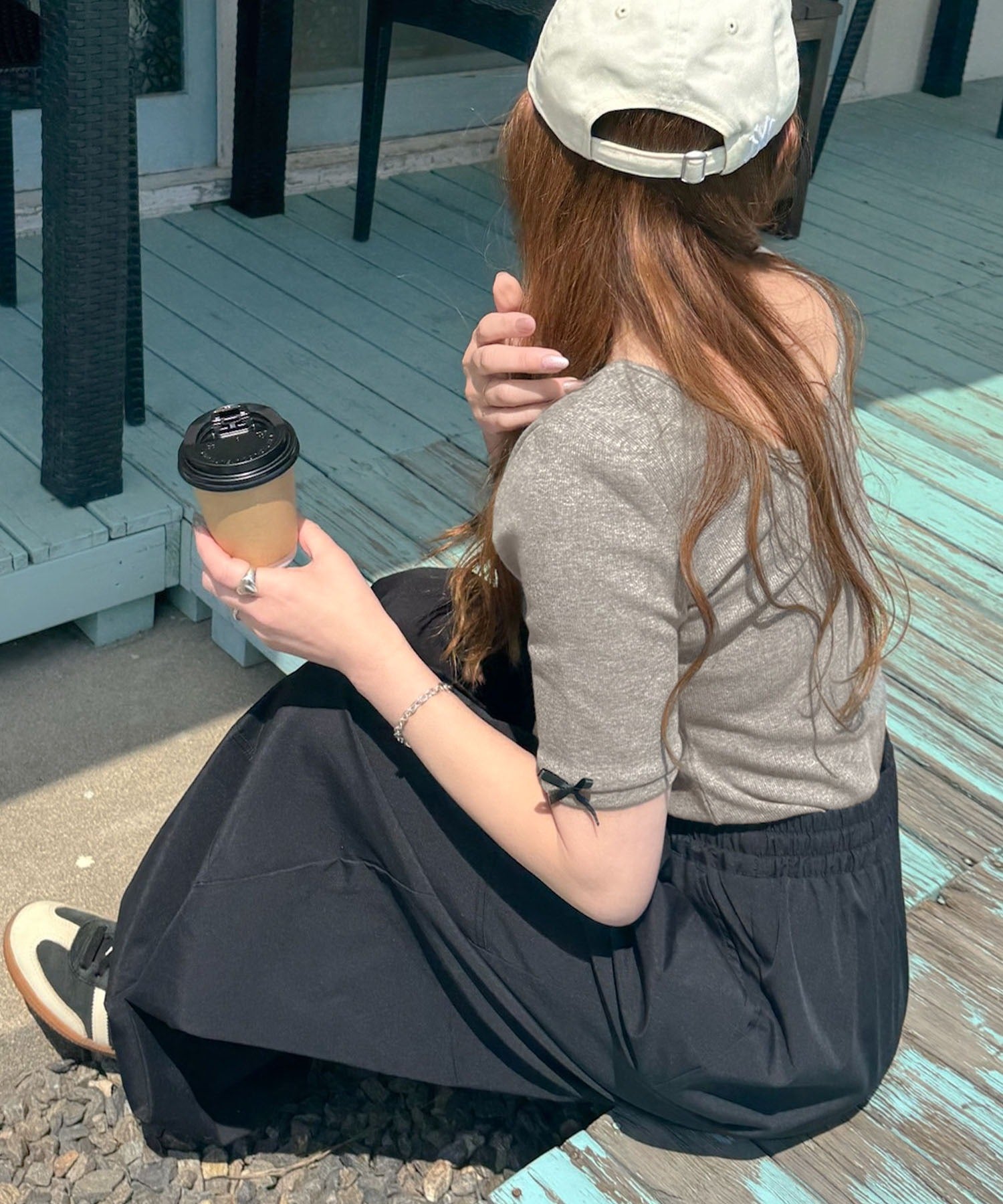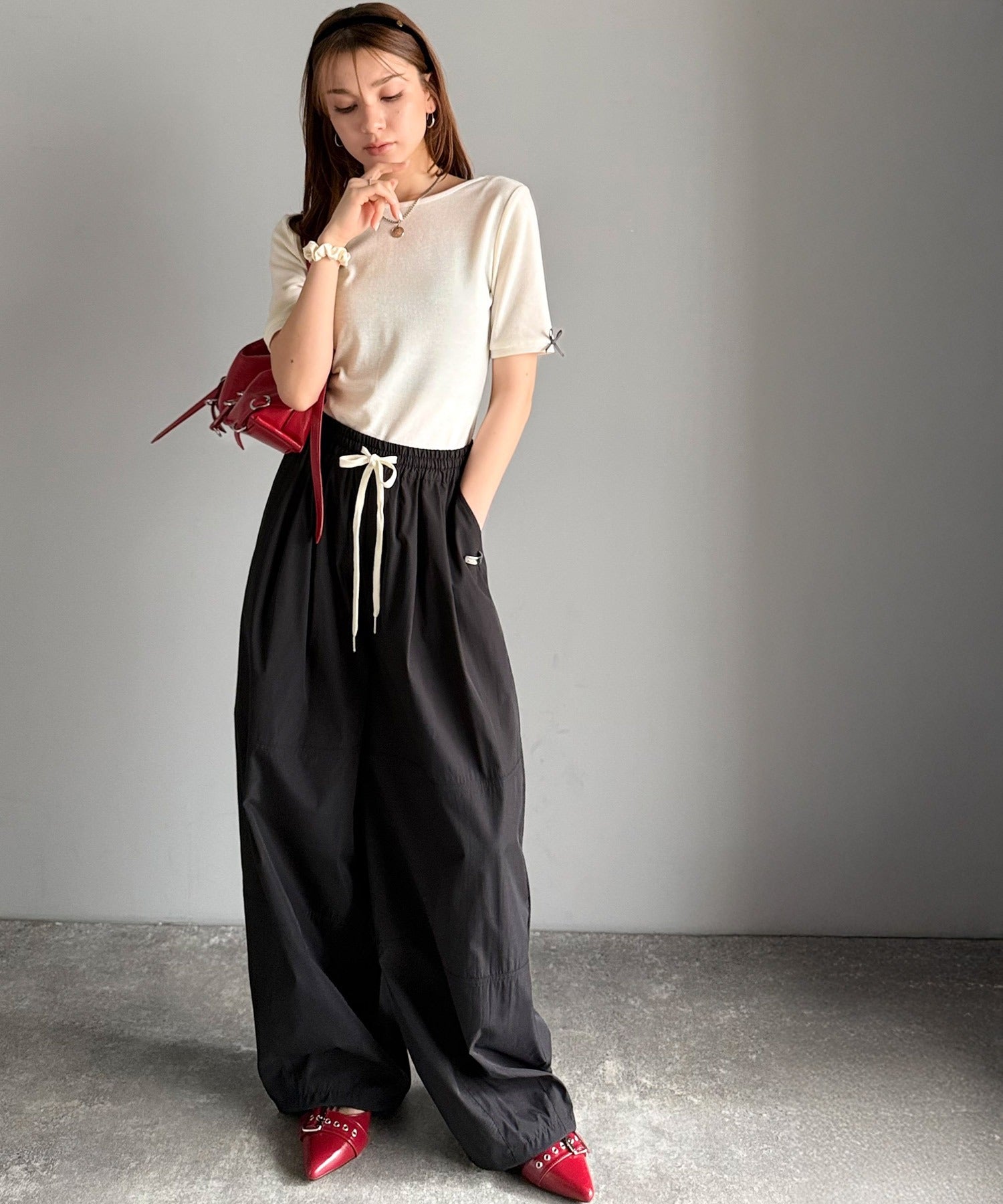 背中開き×袖リボンのフェミニンなアクセントが魅力のリブトップス。
