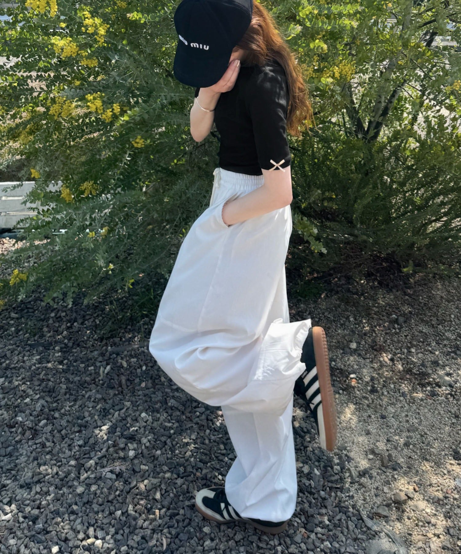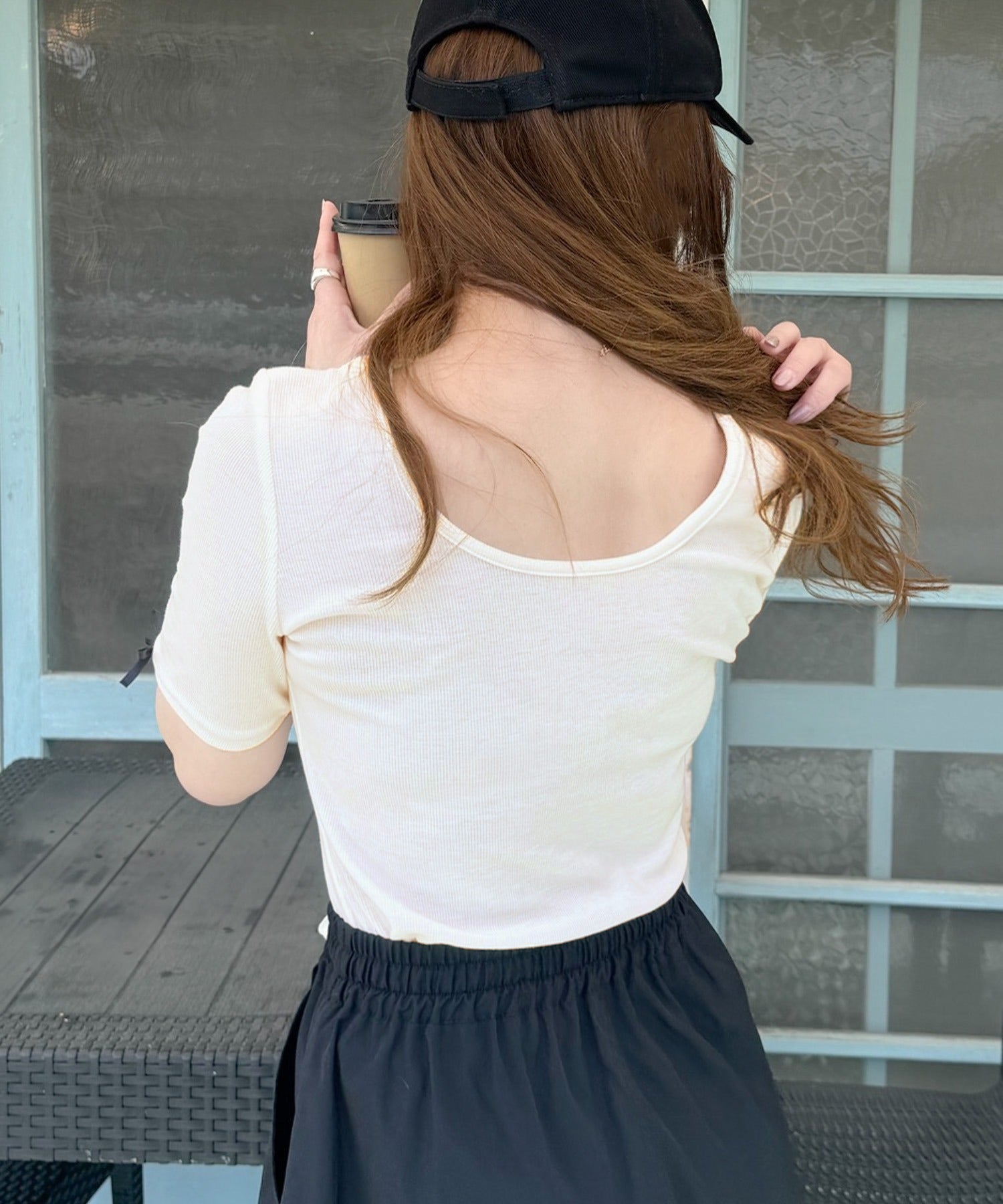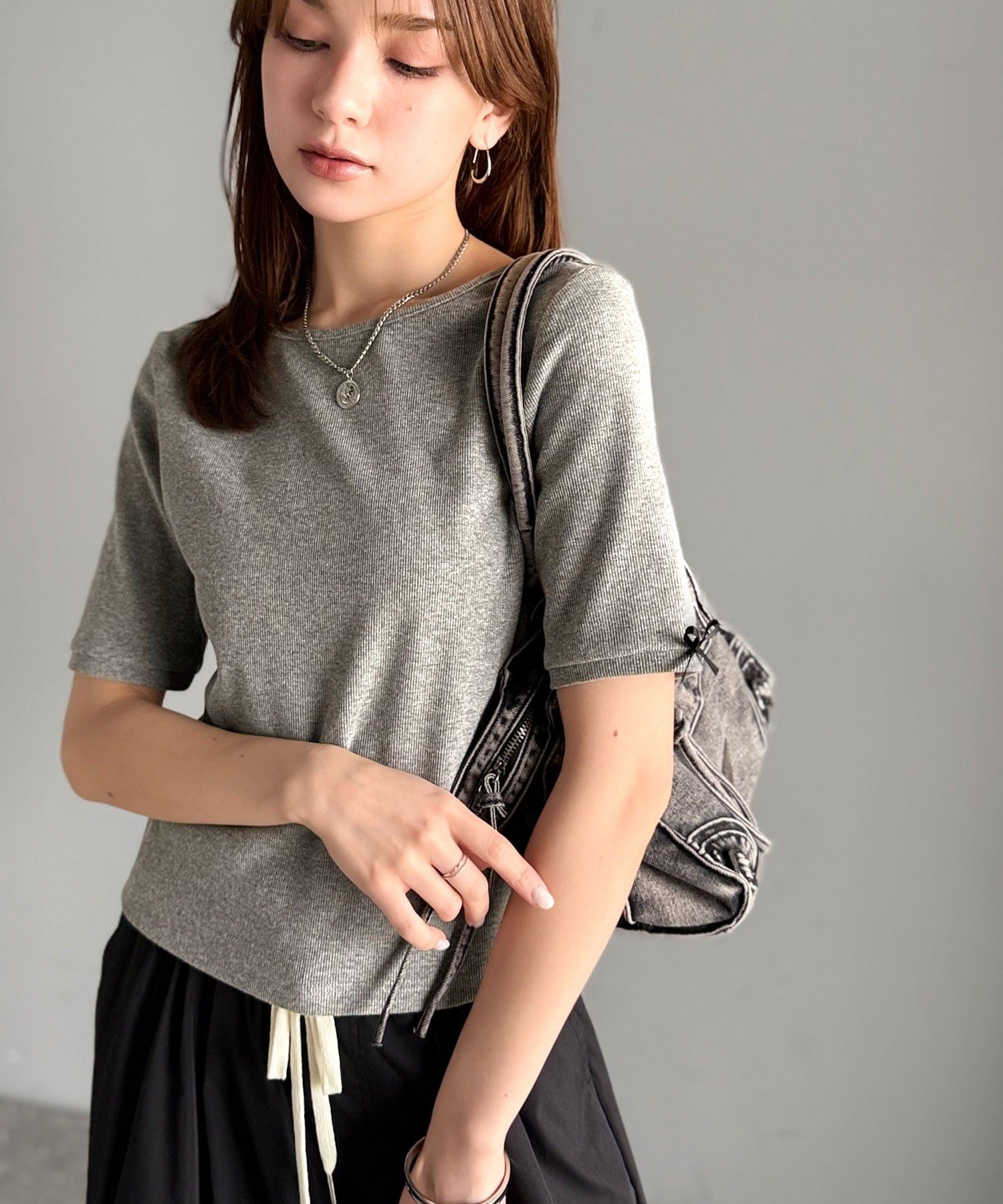 トレンドを取り入れた高級感漂うデザインの半袖リブトップス。