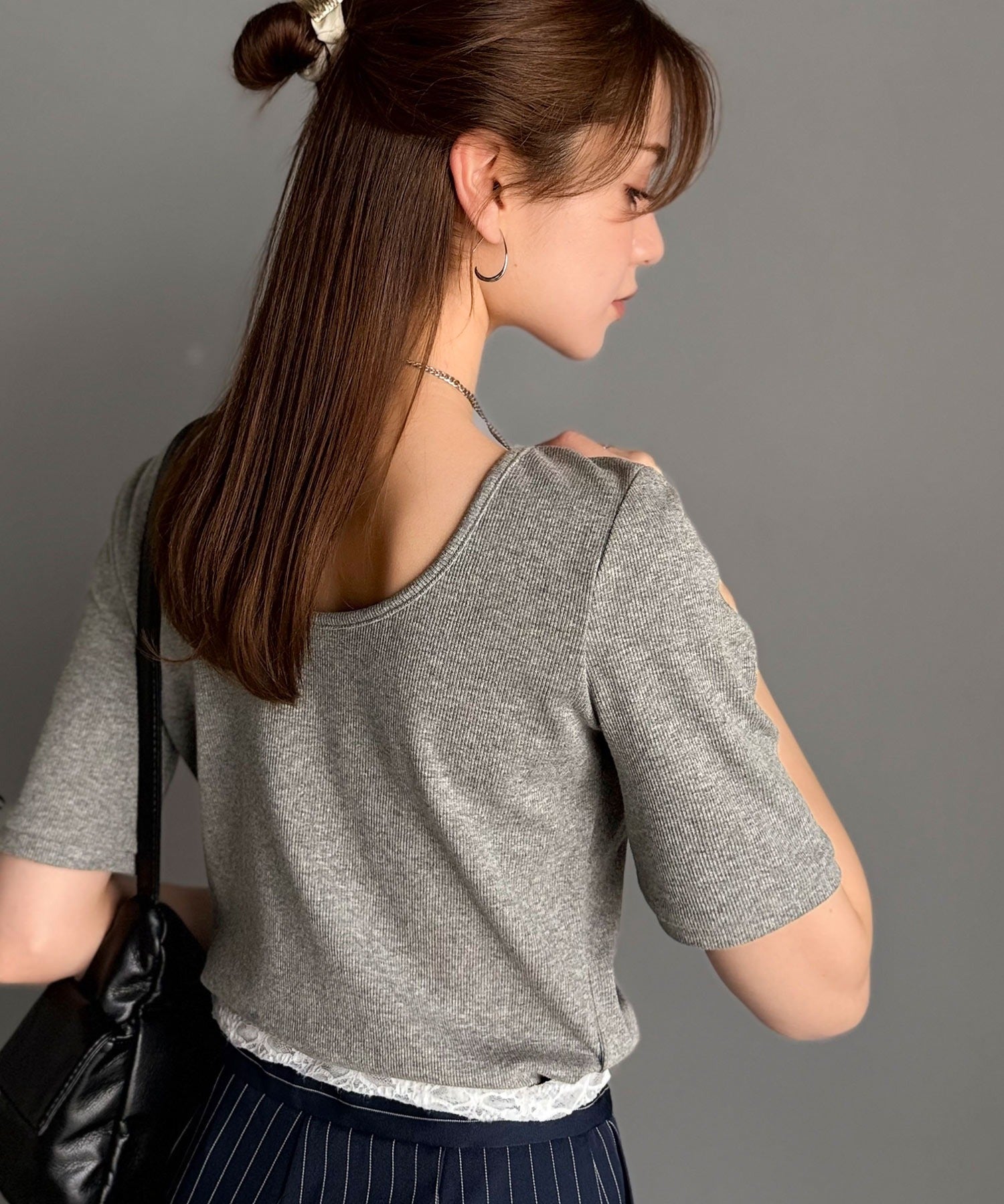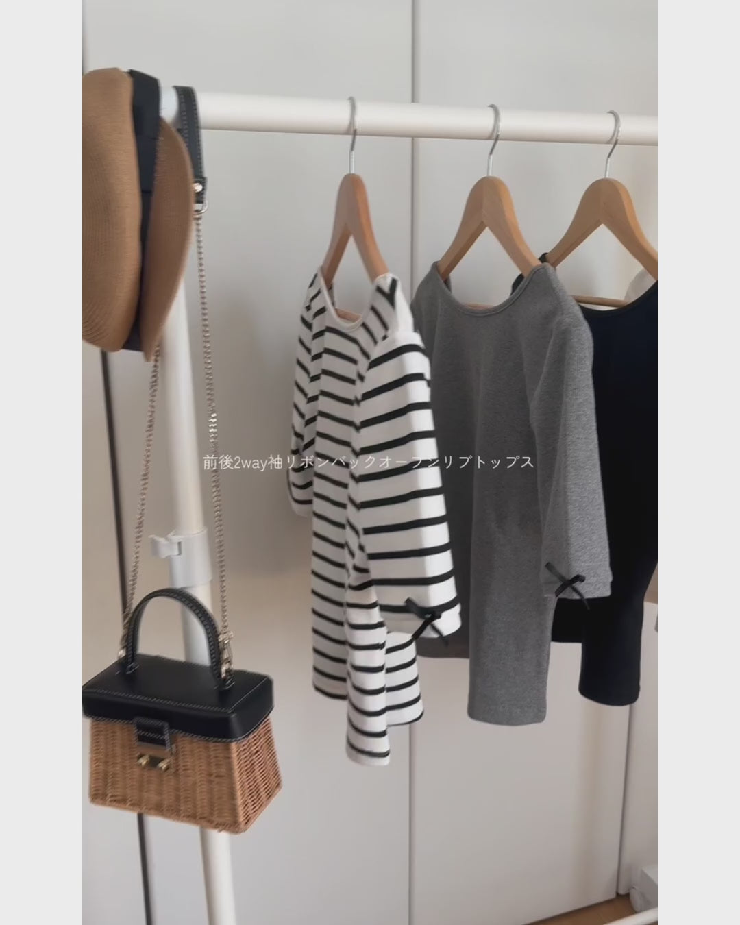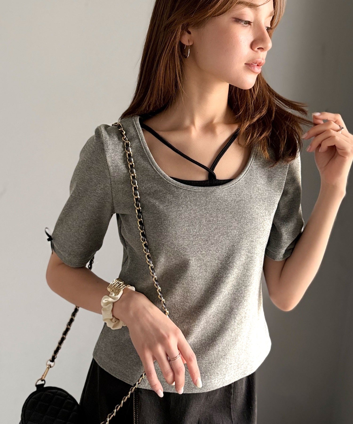 《AYA×クラシカルエルフコラボ》大人可愛いを叶える。前後2way袖リボンバックオープンリブトップス(半袖) ce1010432