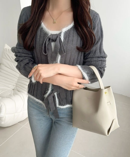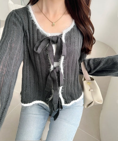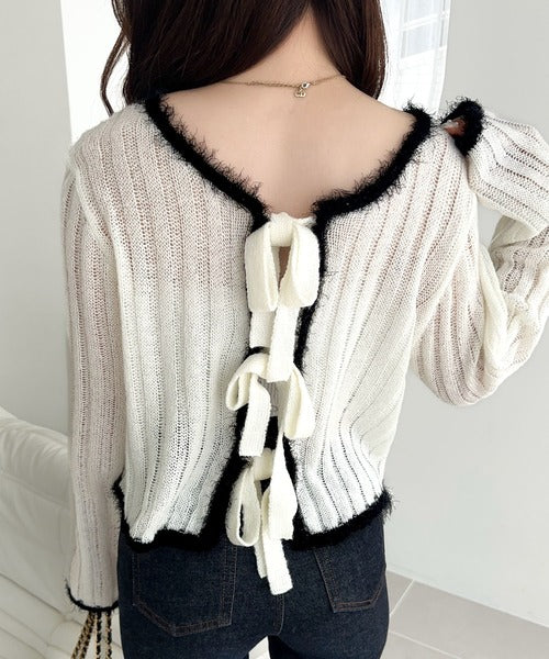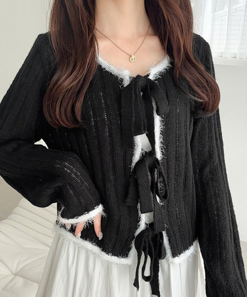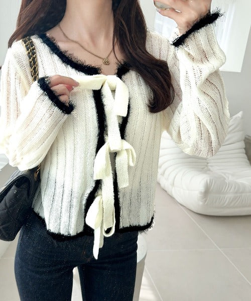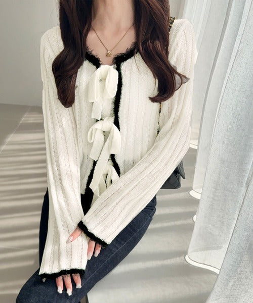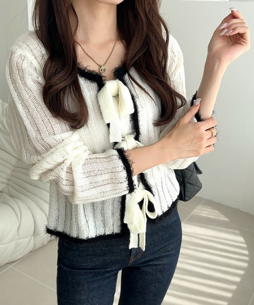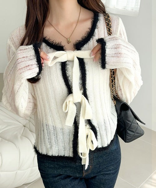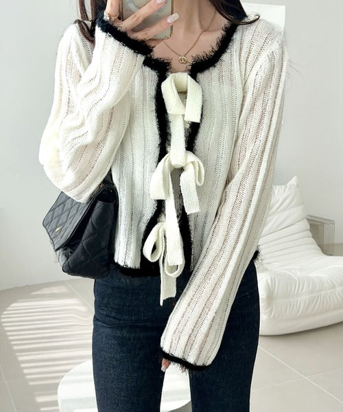軽やかな透かし編みデザインと、フェミニンなリボンディテールが魅力のカーディガン。