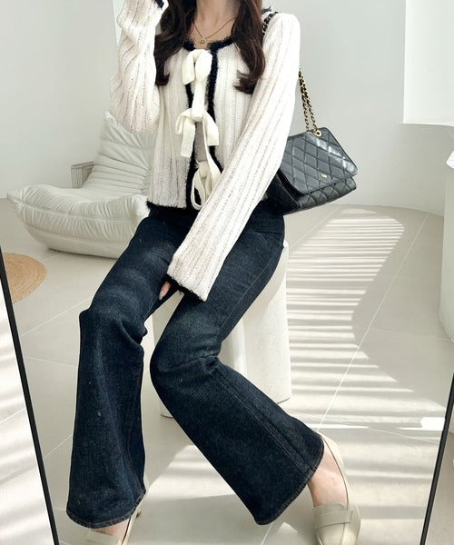 細身のデニムを合わせることで、カーディガンのショート丈が脚長効果を発揮します。