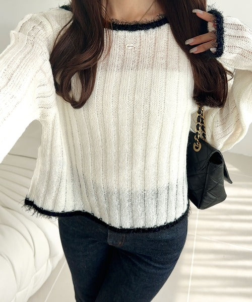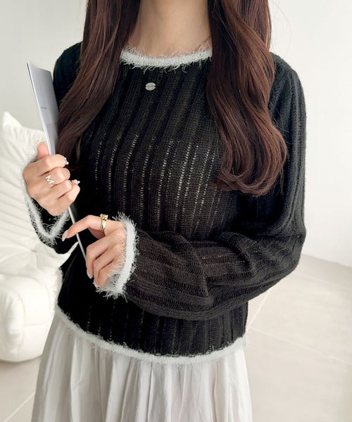 配色にフェザーニット素材をあしらい、ほんのり甘い大人フェミニンな印象をプラス。