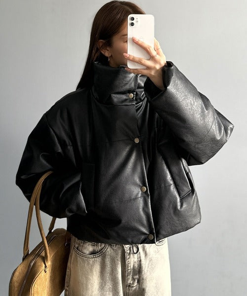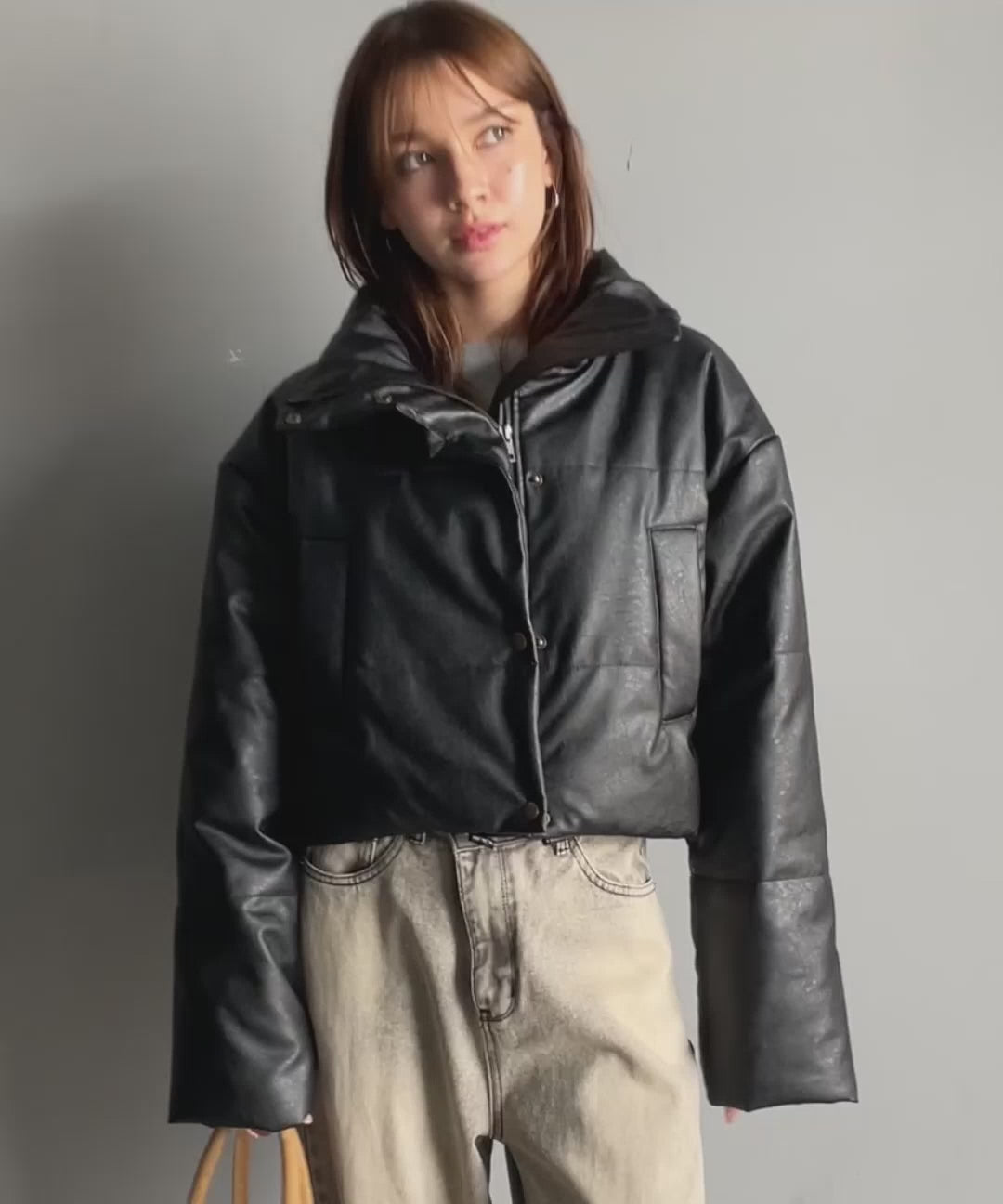 ヴィンテージライクなフェイクレザーのクロップド中綿コート。