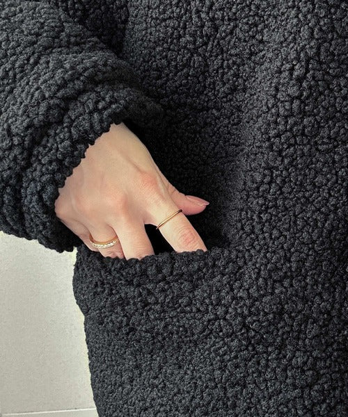 ふんわりとしたボア生地が季節感を高め、羽織るだけで華やかなスタイルに仕上がります。