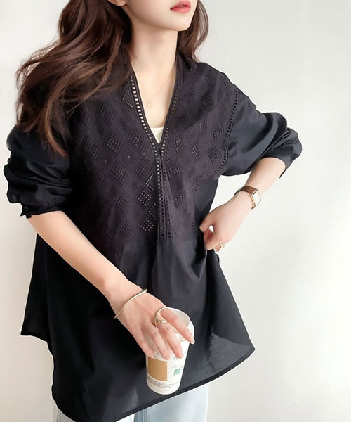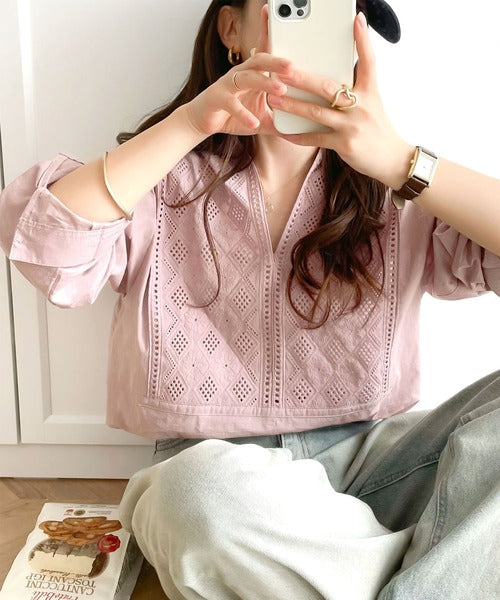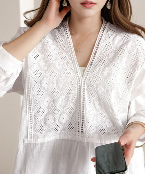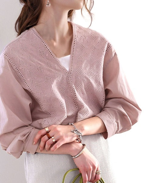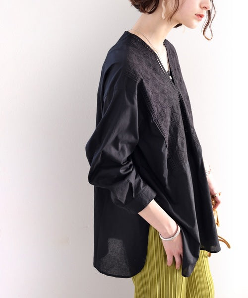 胸元を刺繍生地に切り替えた、エンブロイダリーブラウス。