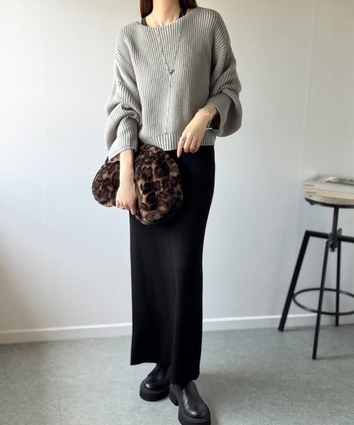 ゆるやかな首元の抜け感と短め丈が、旬のバランスを演出します。