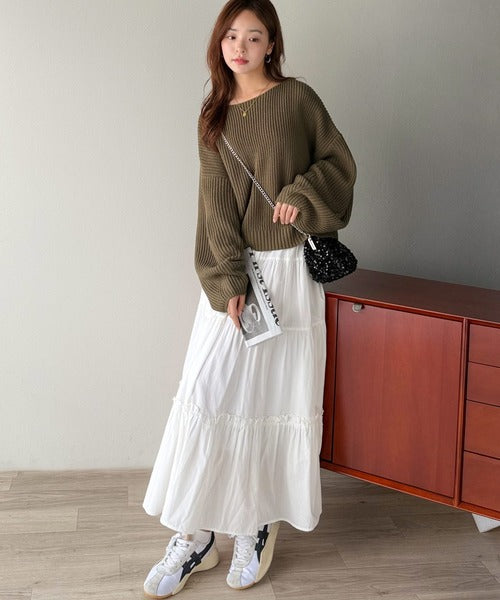 程よく肉厚な畦編みは、着るだけで立体的なシルエットをつくり、ふんわりとした袖が女性らしい柔らかさをプラスします。