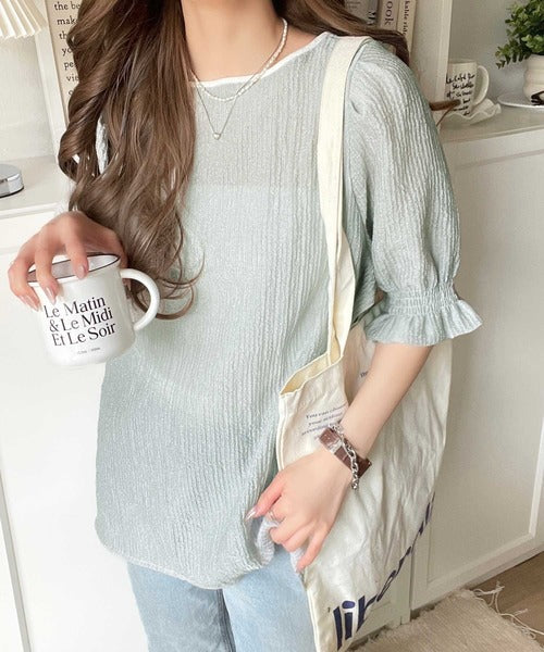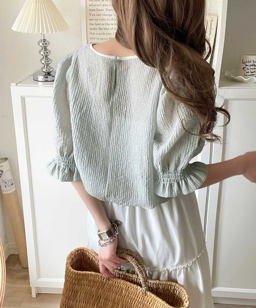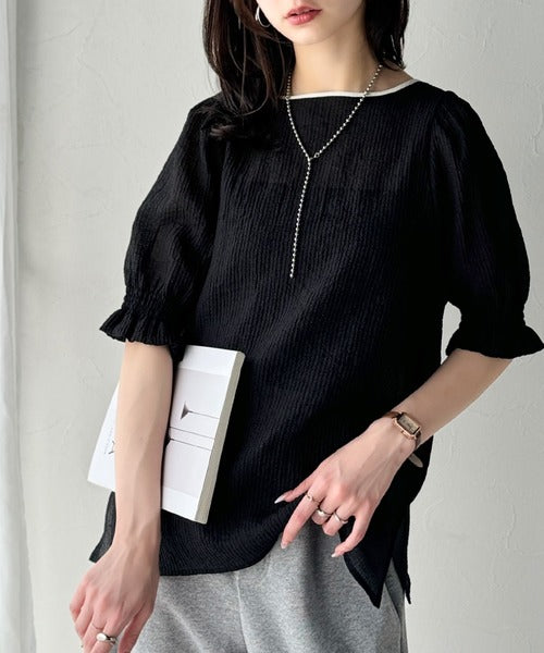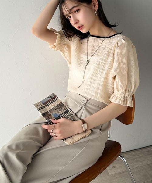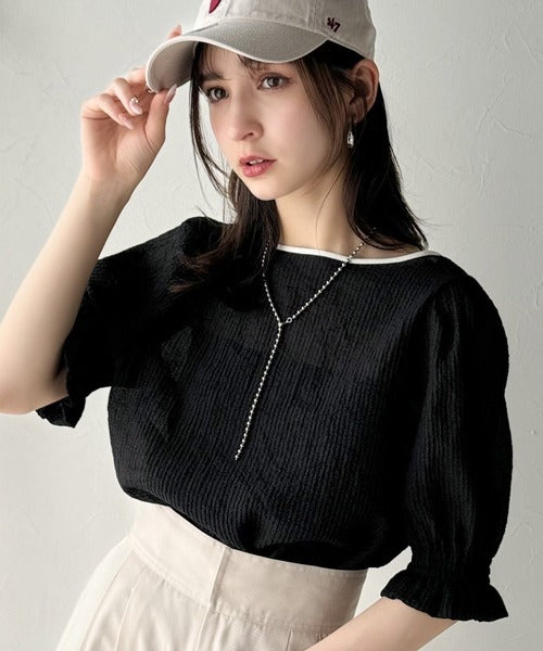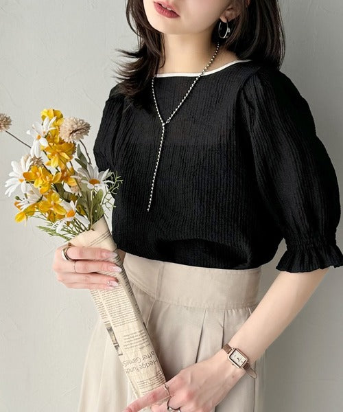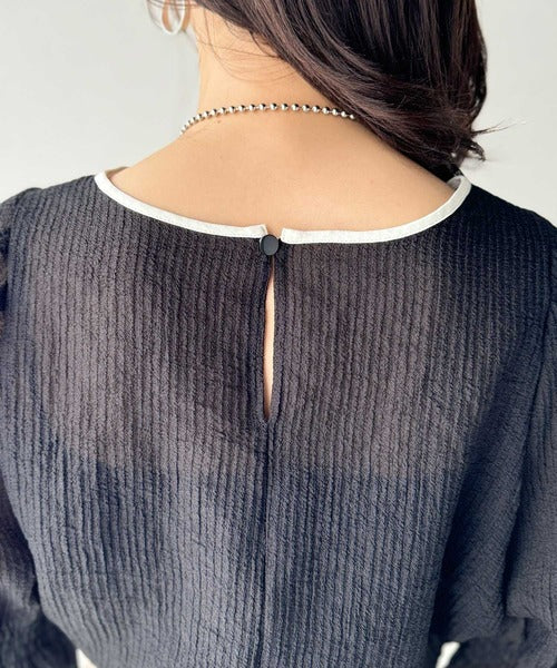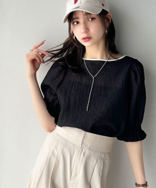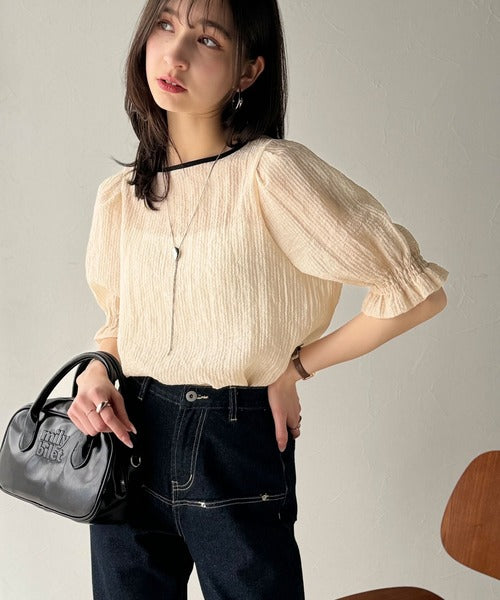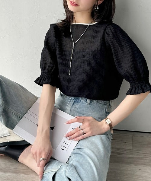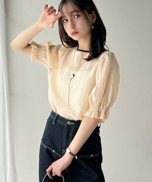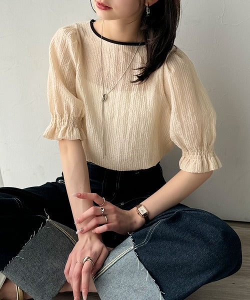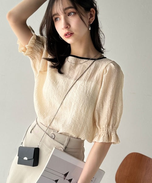 涼しげ&透明感◎配色パイピング バルーンフリルスリーブ楊柳ブラウス(プルオーバー) ce1070160