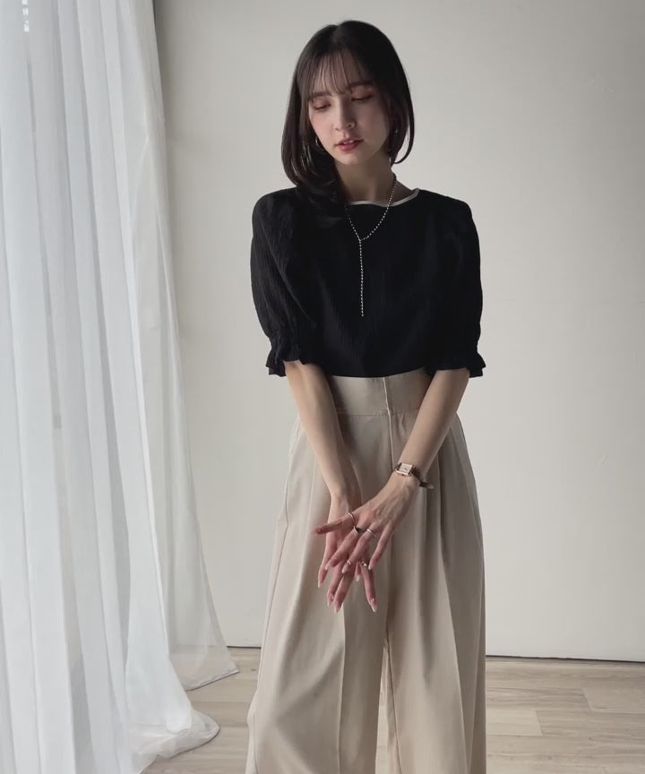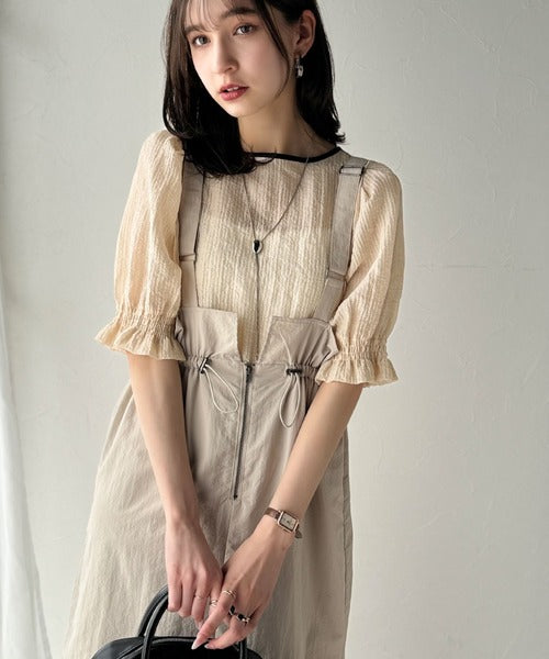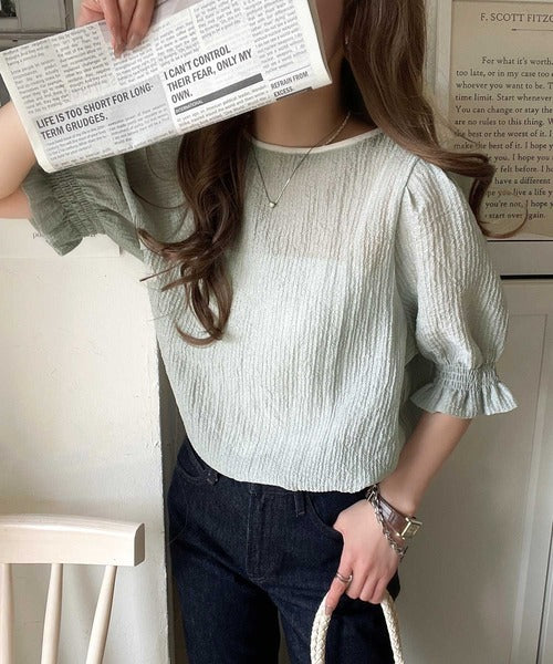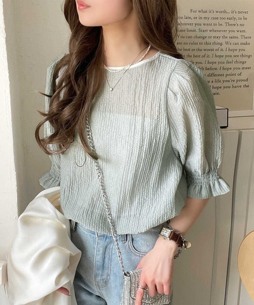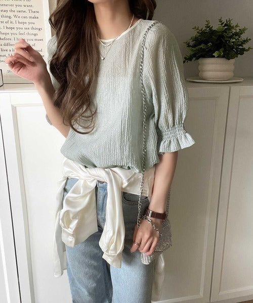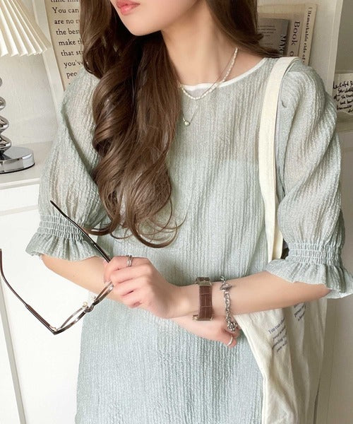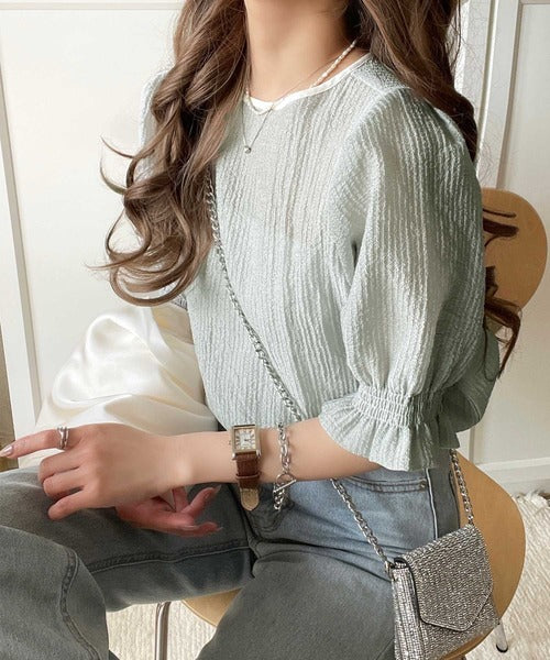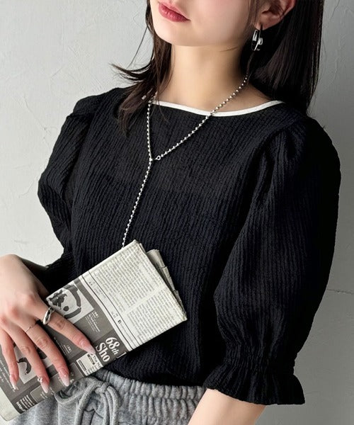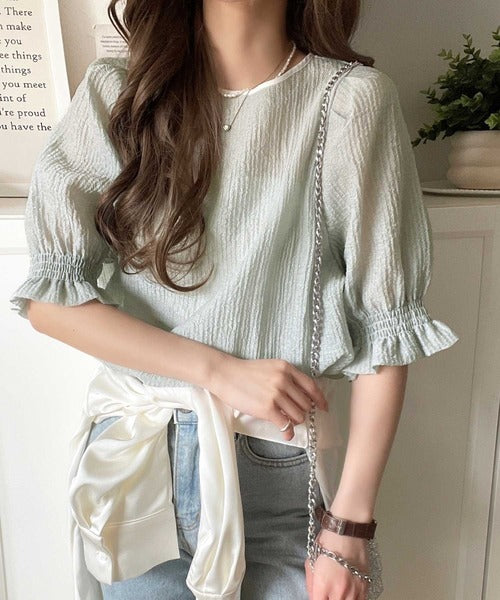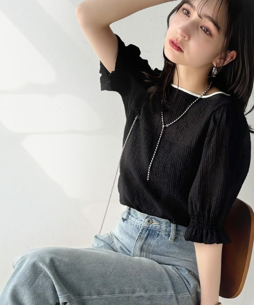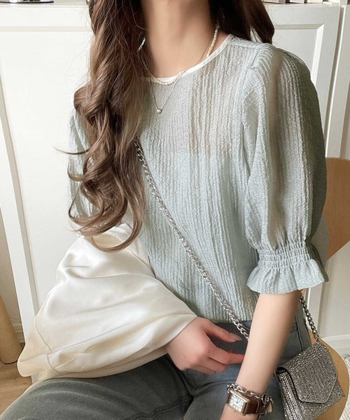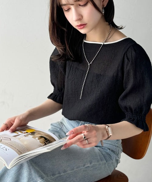 涼しげ&透明感◎配色パイピング バルーンフリルスリーブ楊柳ブラウス(プルオーバー) ce1070160