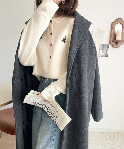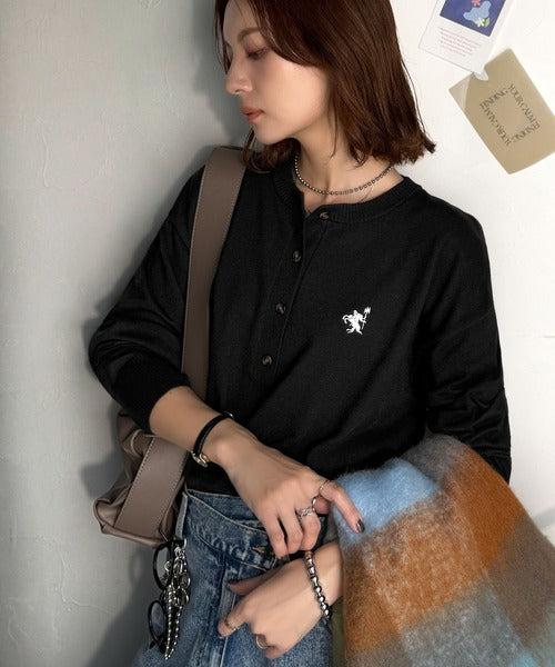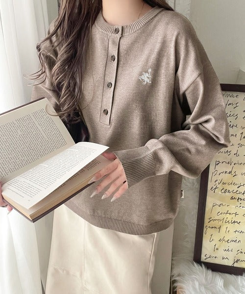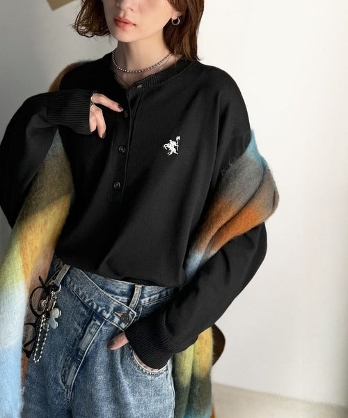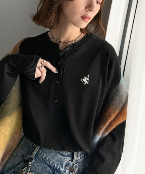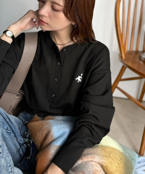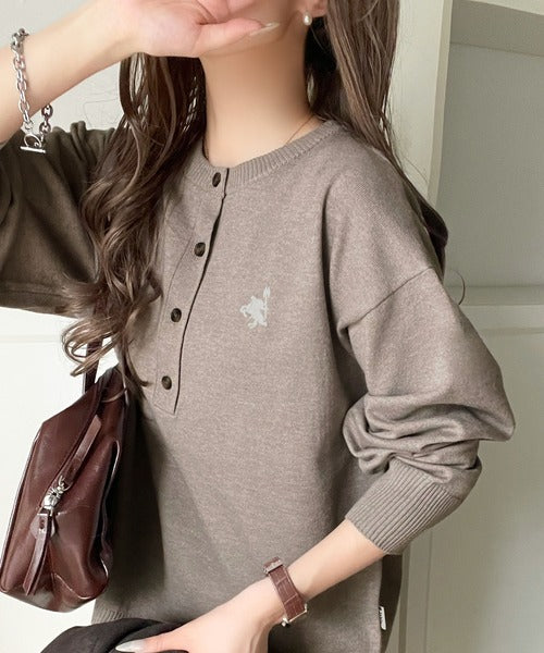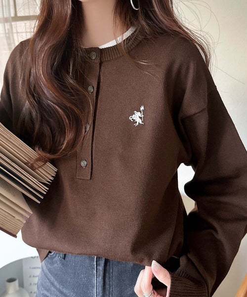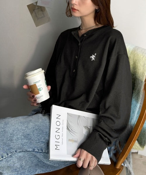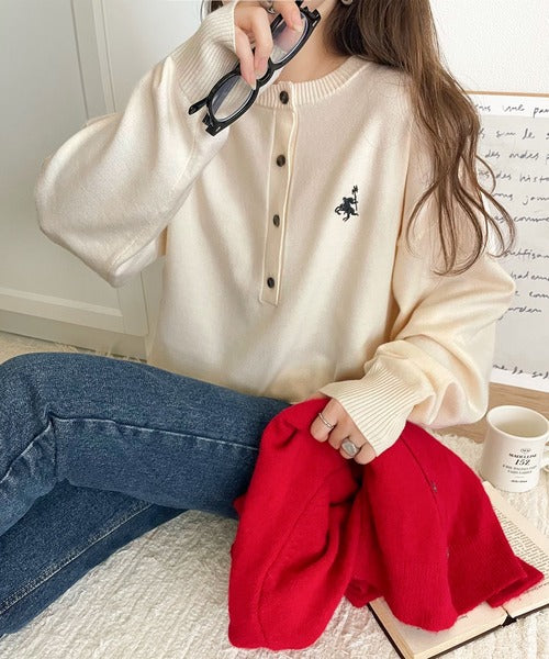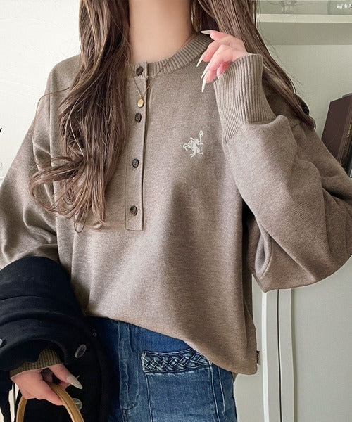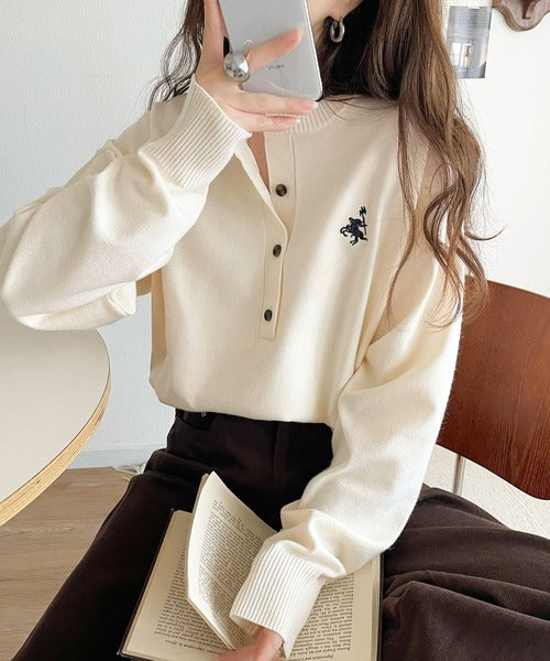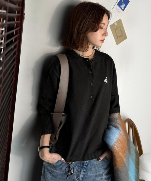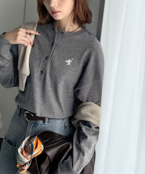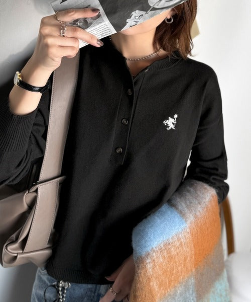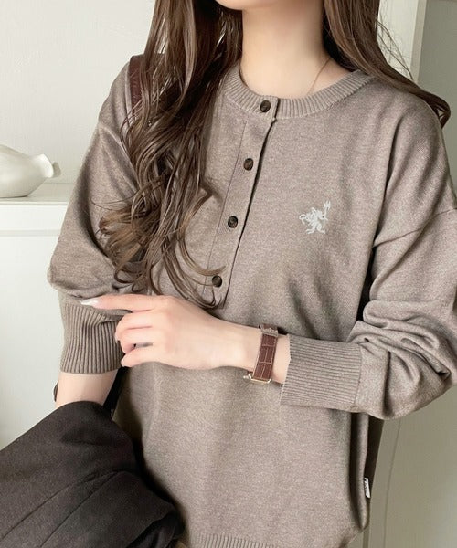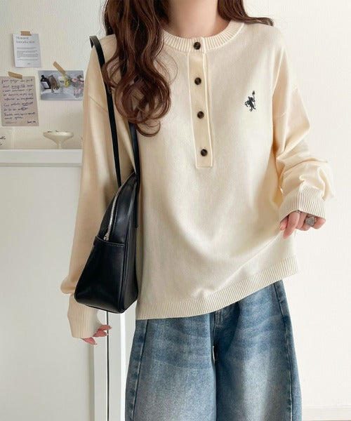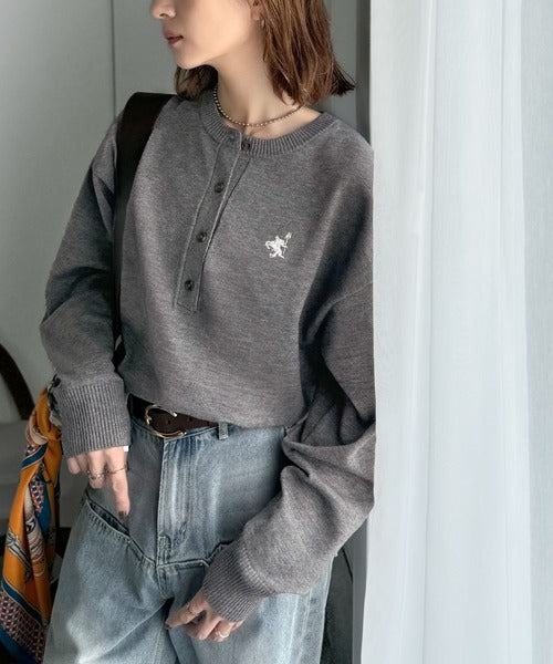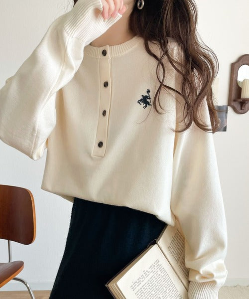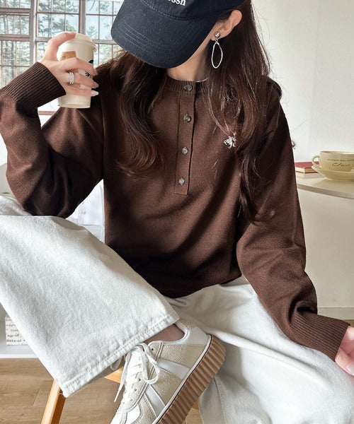 《Javaジャバコラボ》顔周りスッキリ&胸元刺繍で映える♪配色刺繍ヘンリーネックニット jv1240110