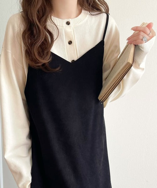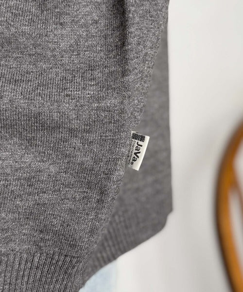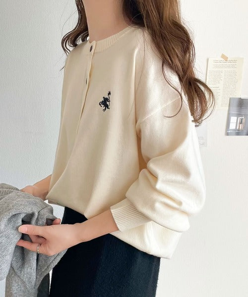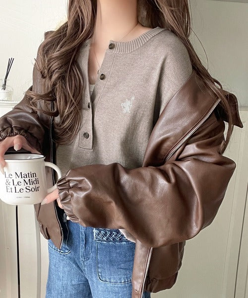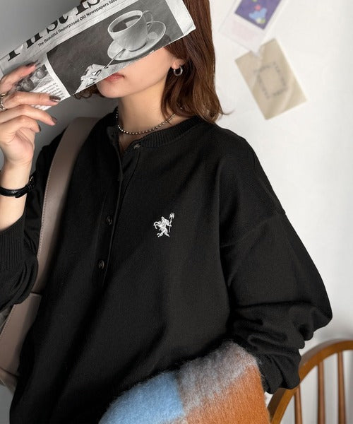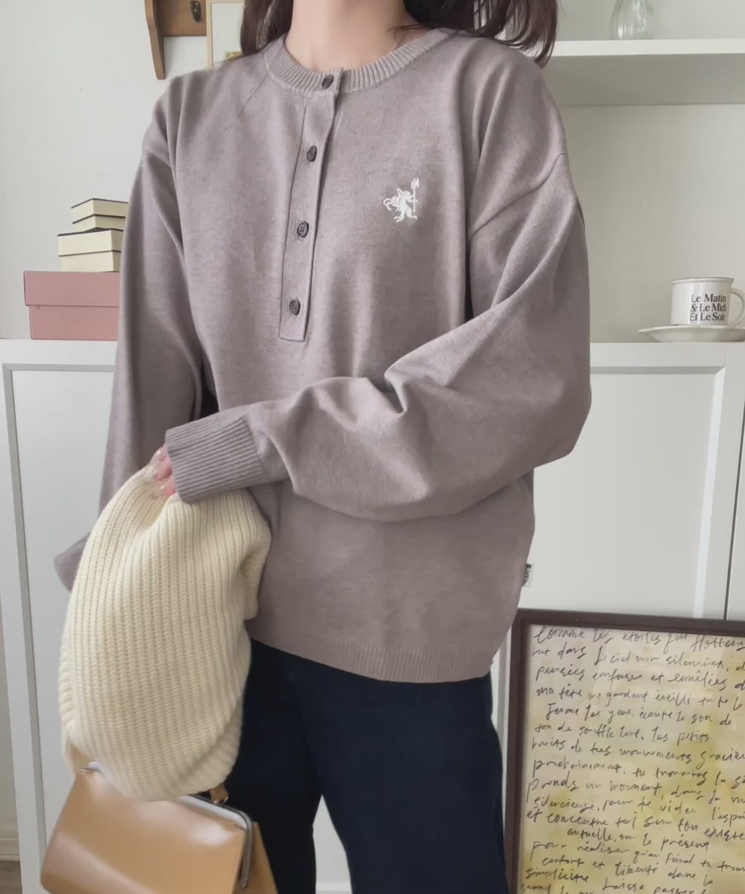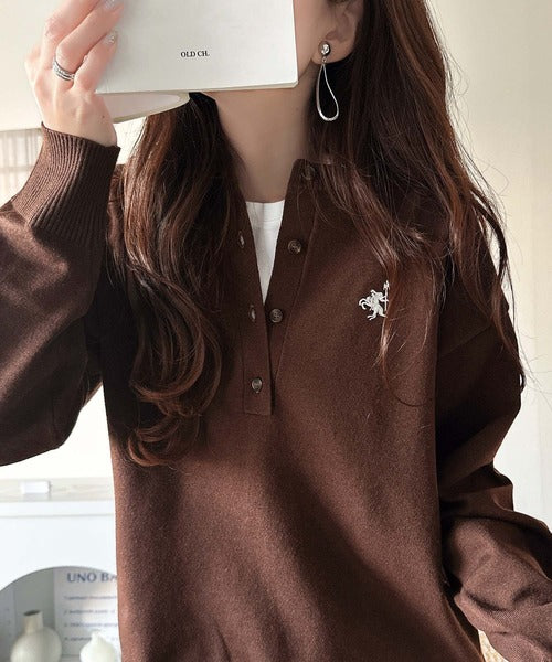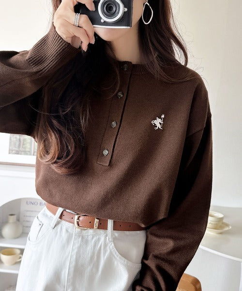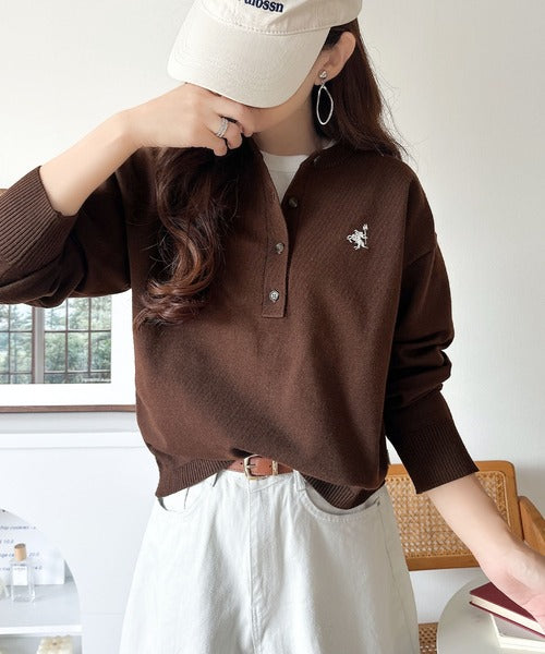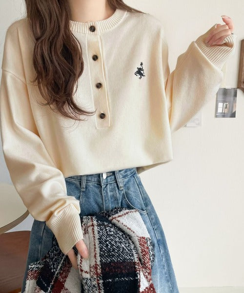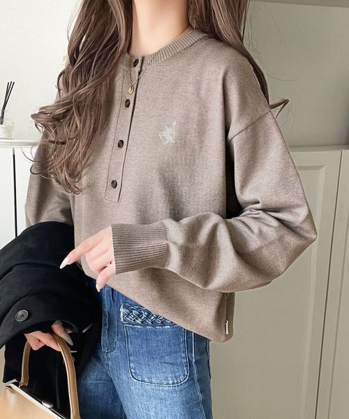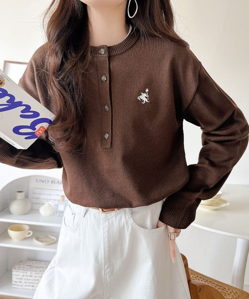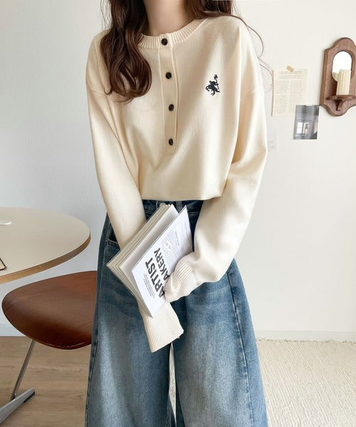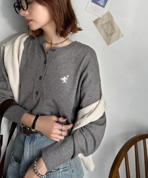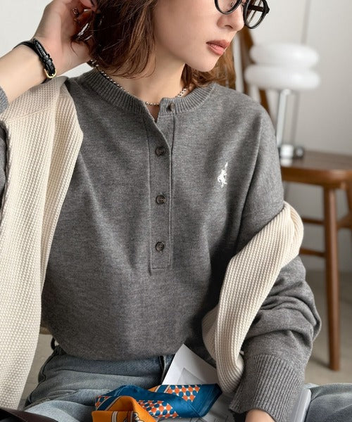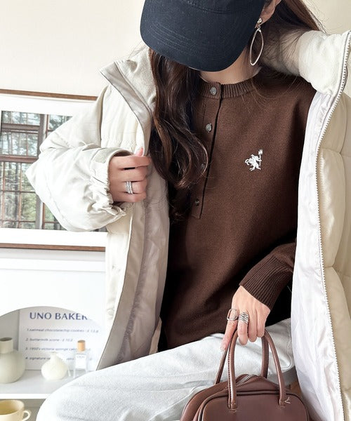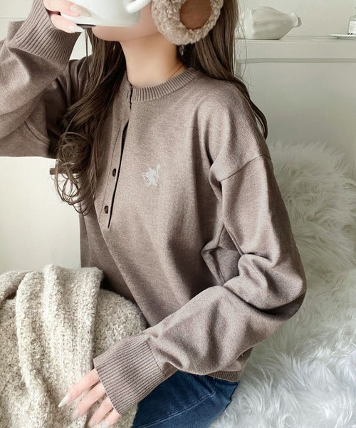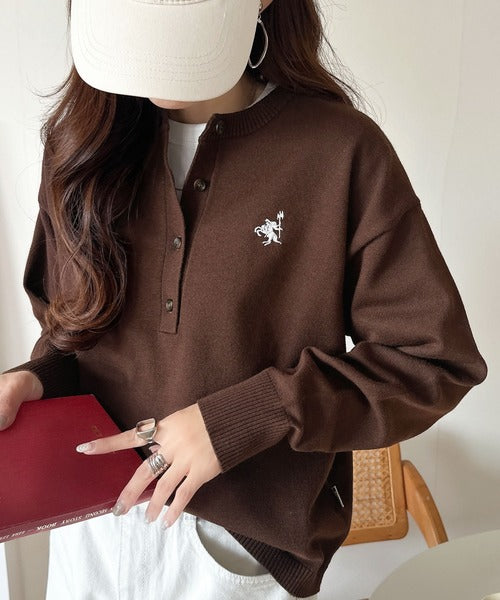 《Javaジャバコラボ》顔周りスッキリ&胸元刺繍で映える♪配色刺繍ヘンリーネックニット jv1240110